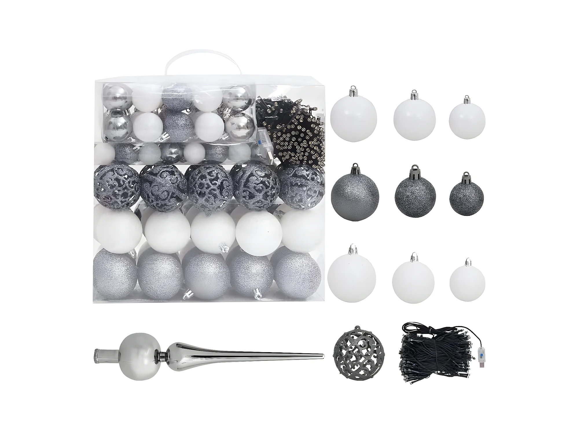Albero di Natale artificiale preilluminato e palline bianche 210 cm