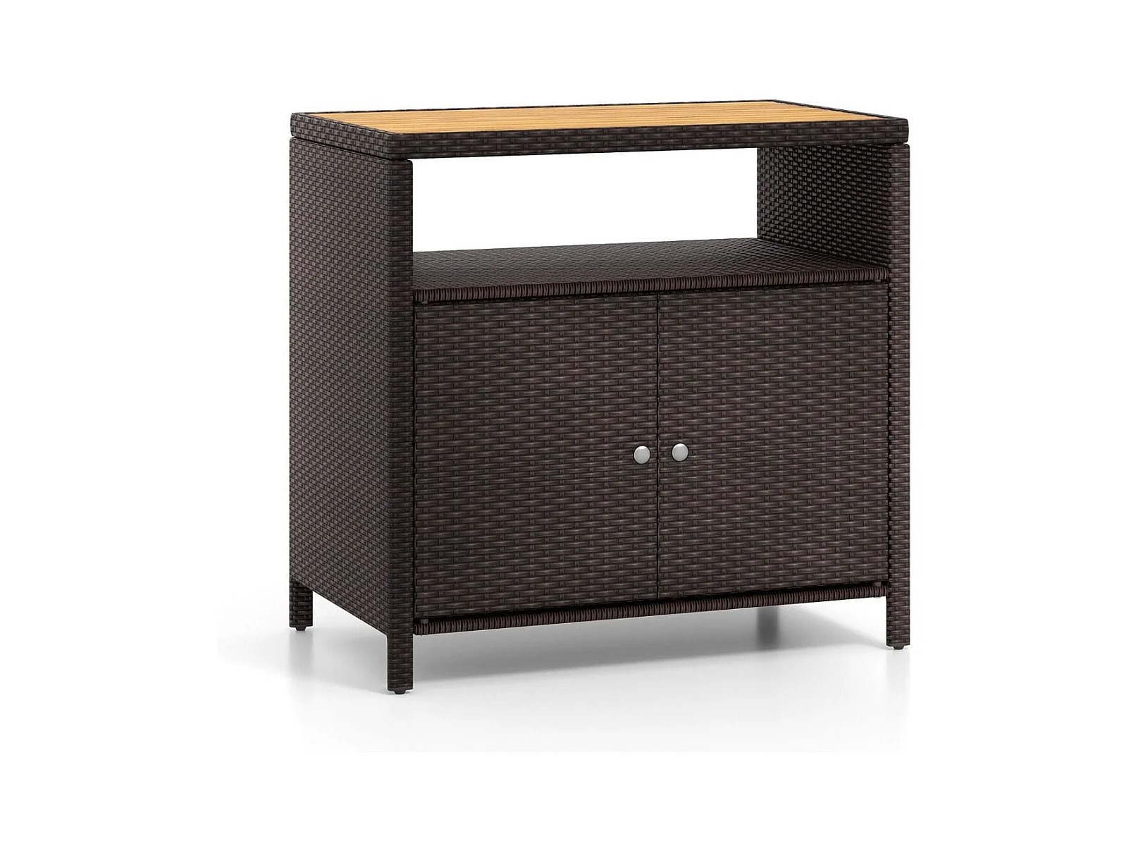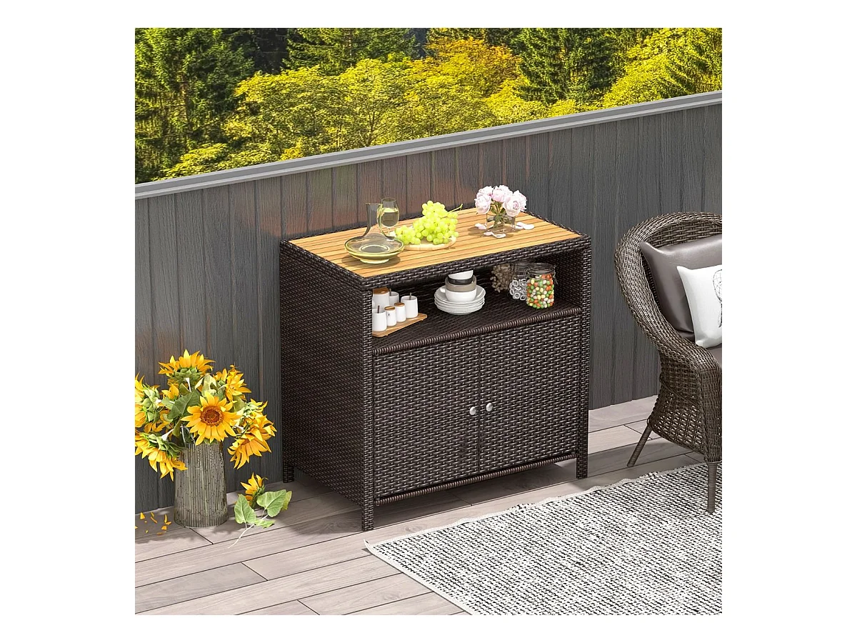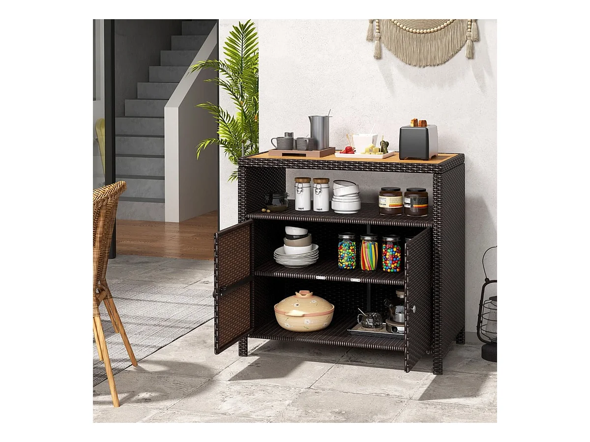 Armadietto portaoggetti in rattan con piano in legno di acacia, Mobile buffet per esterni con armadio a 2 ante Marrone
