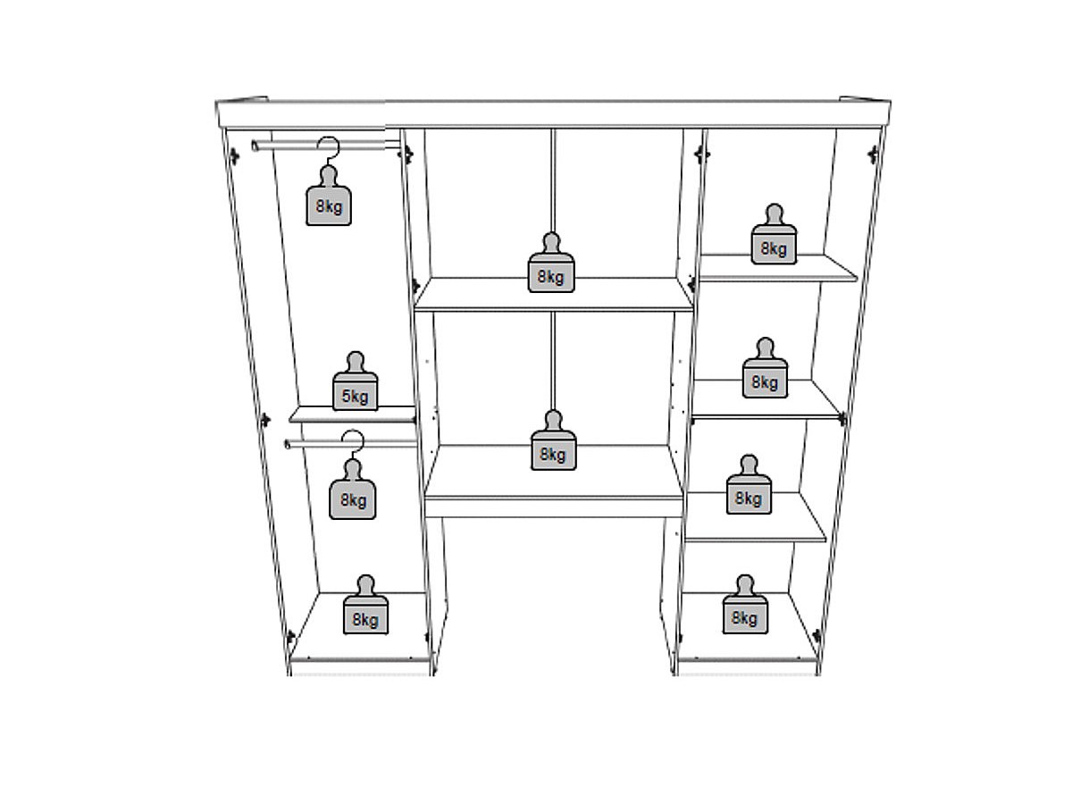 - Interno: 2 bastoni appendiabiti, 6 scaffali