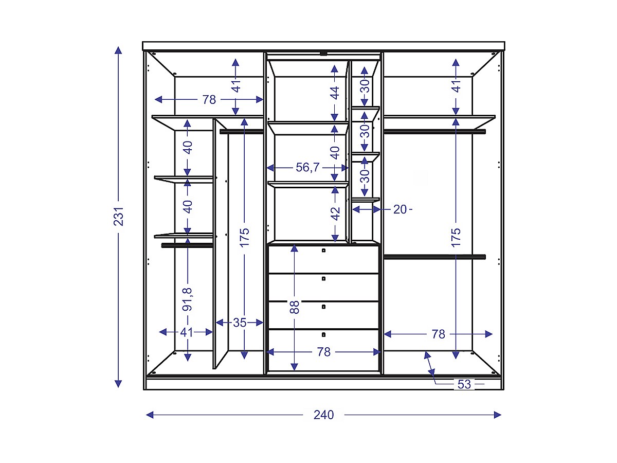 - Interno: 4 appendiabiti (1 alto, 3 medi), numerosi scaffali, 4 cassetti (dim: L76 x H19 cm)