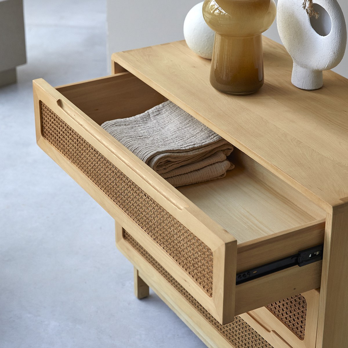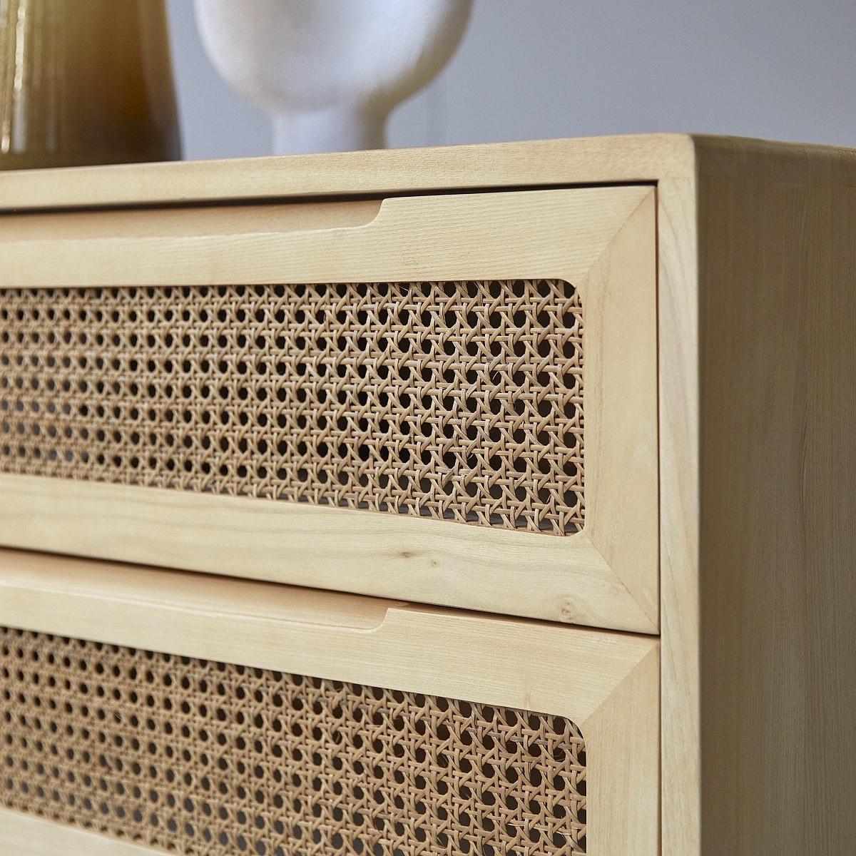 Cassettiera in legno massello di olmo e midollino Luis