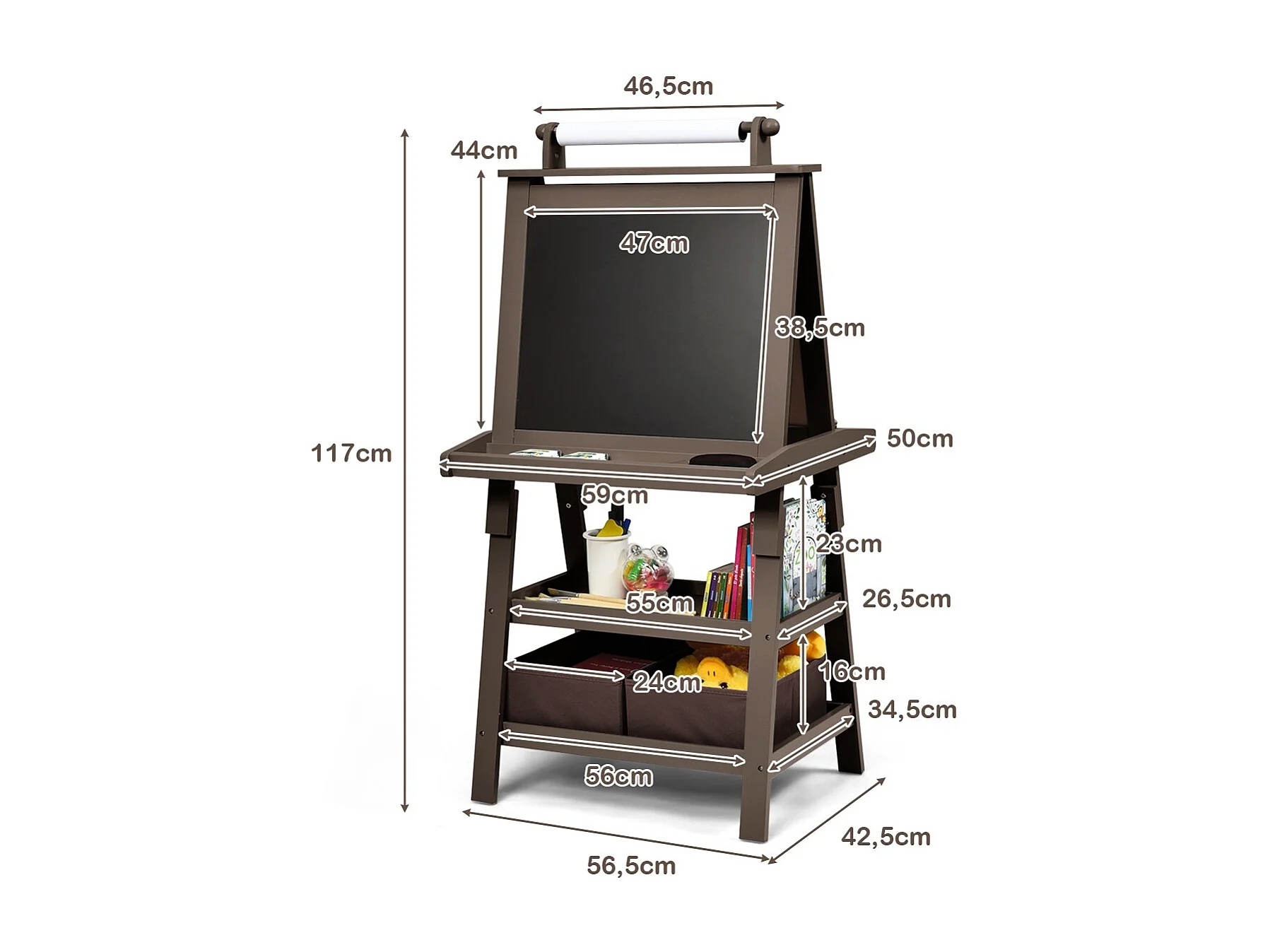 Cavalletto double face 3 in 1 per bambini, Treppiede con lavagna bianca e nera e rotolo di carta, Caffè