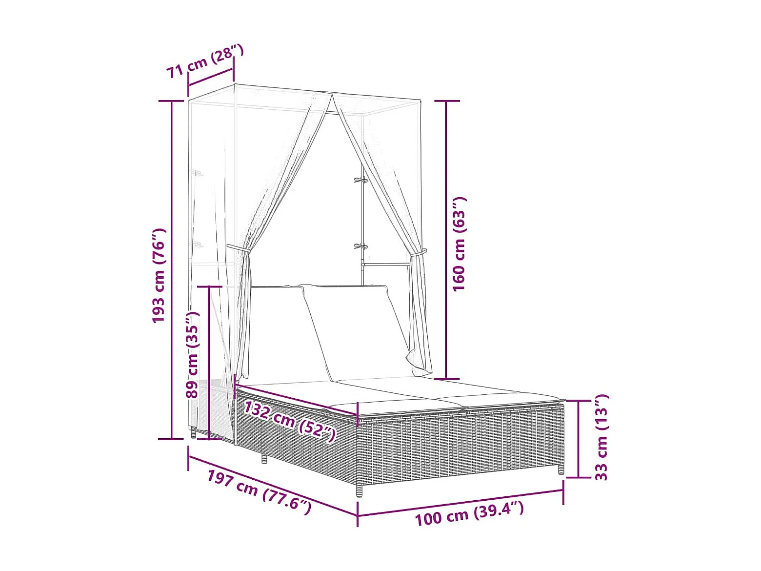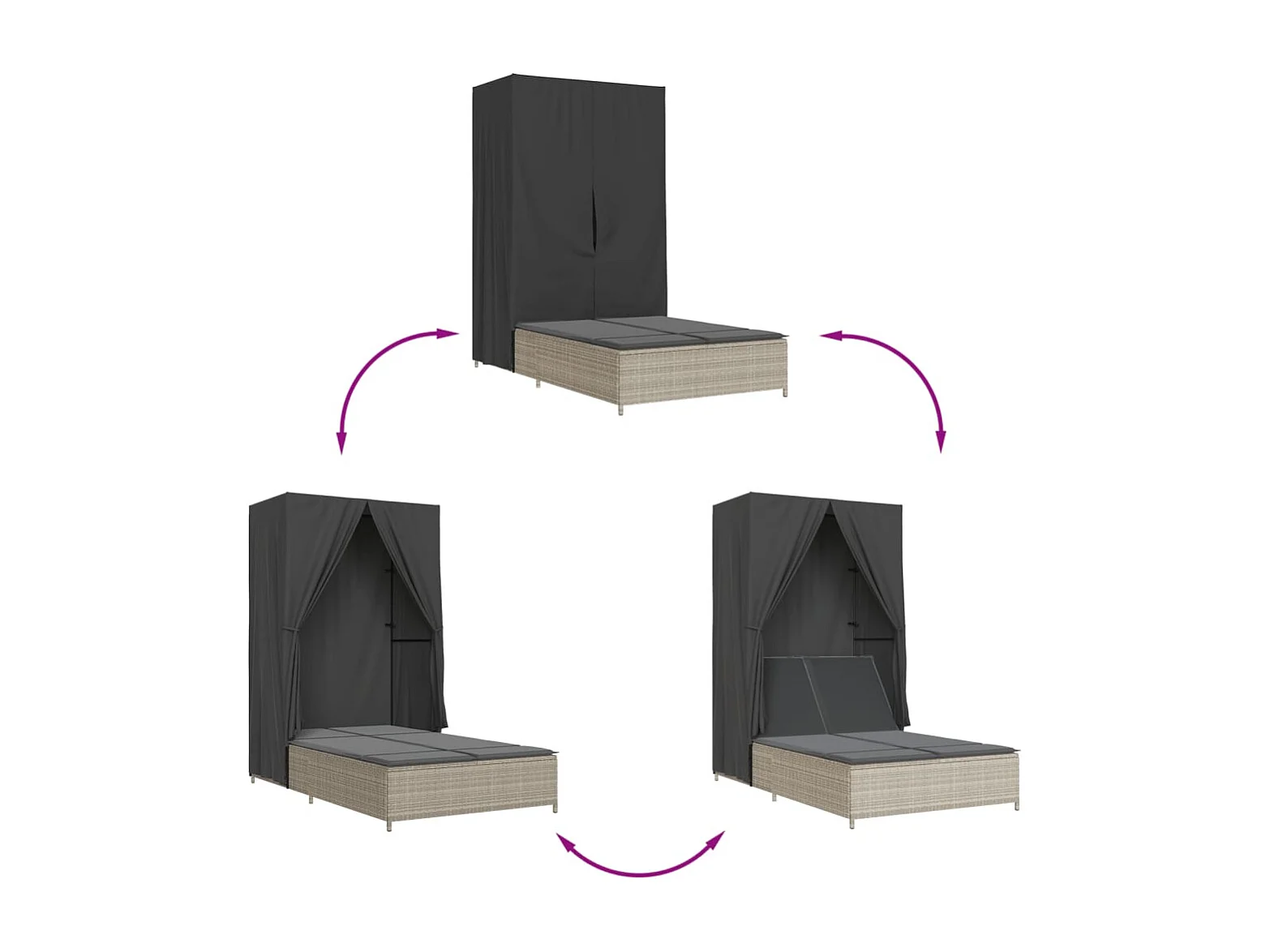 Chaise longue doppia con tetto e tende in resina intrecciata grigia
