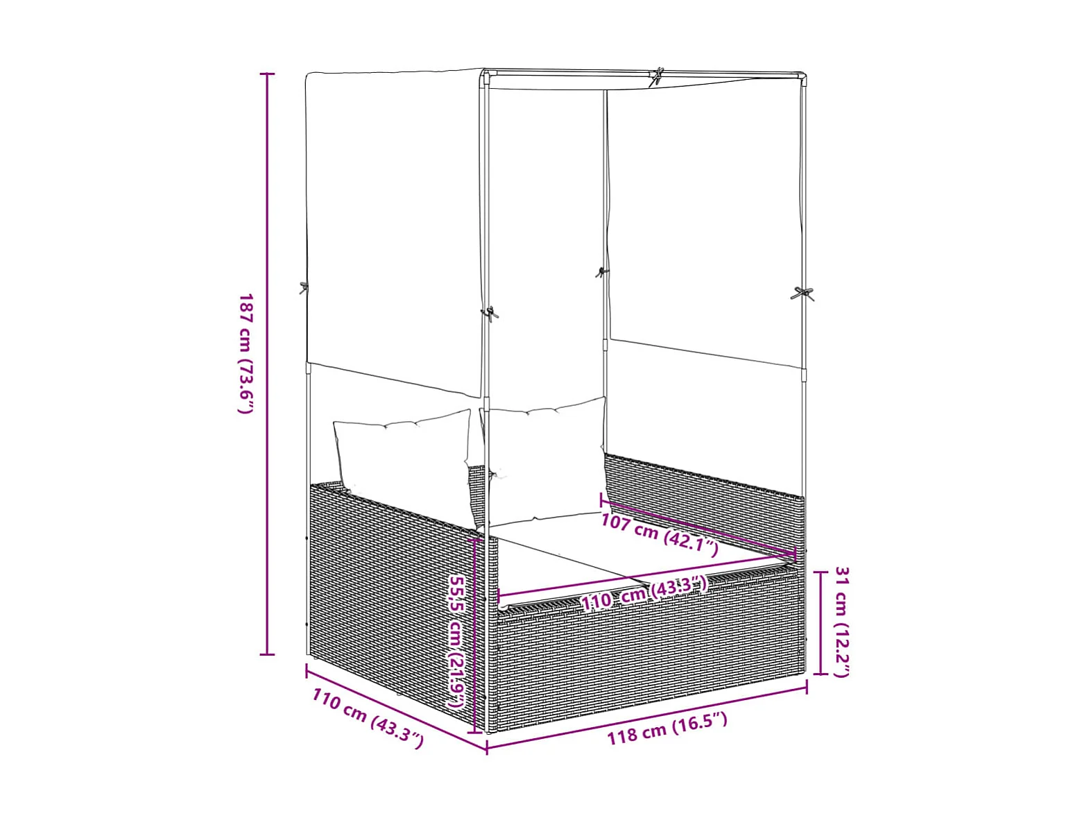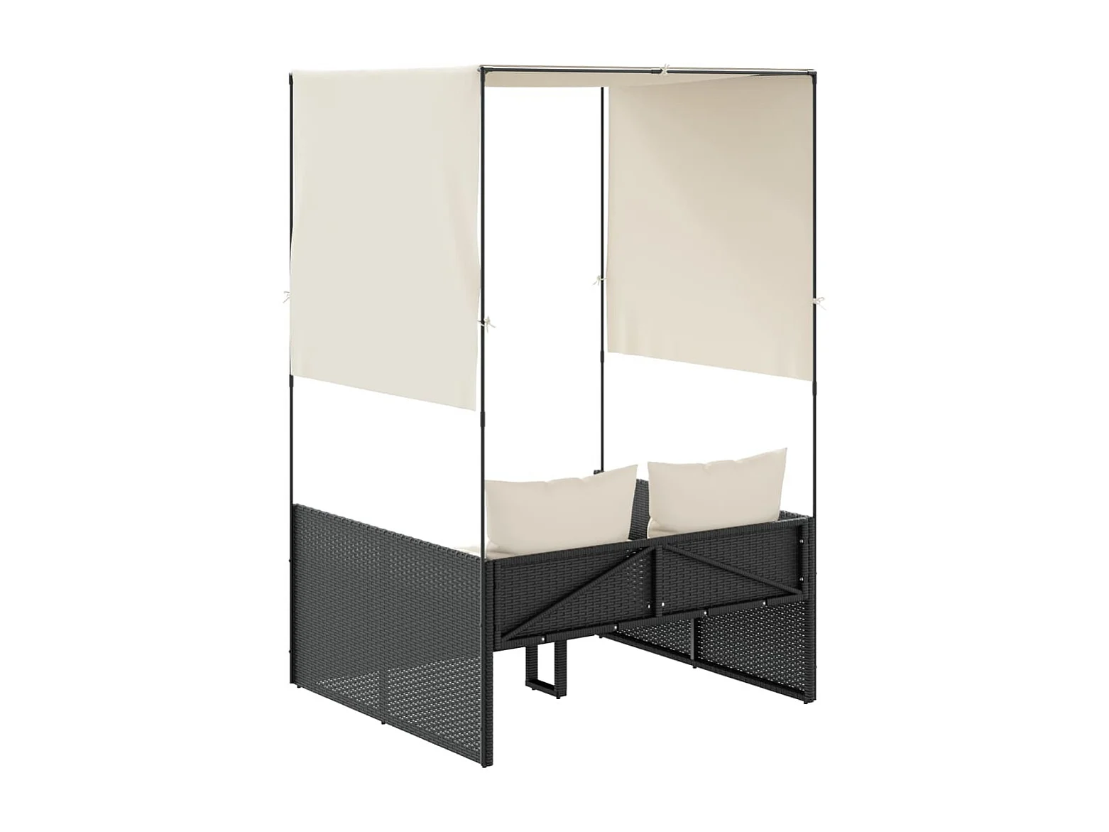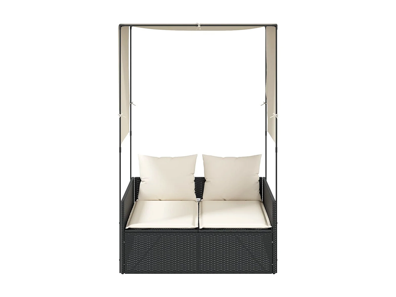 Chaise longue doppia con tetto e tende nere in resina intrecciata