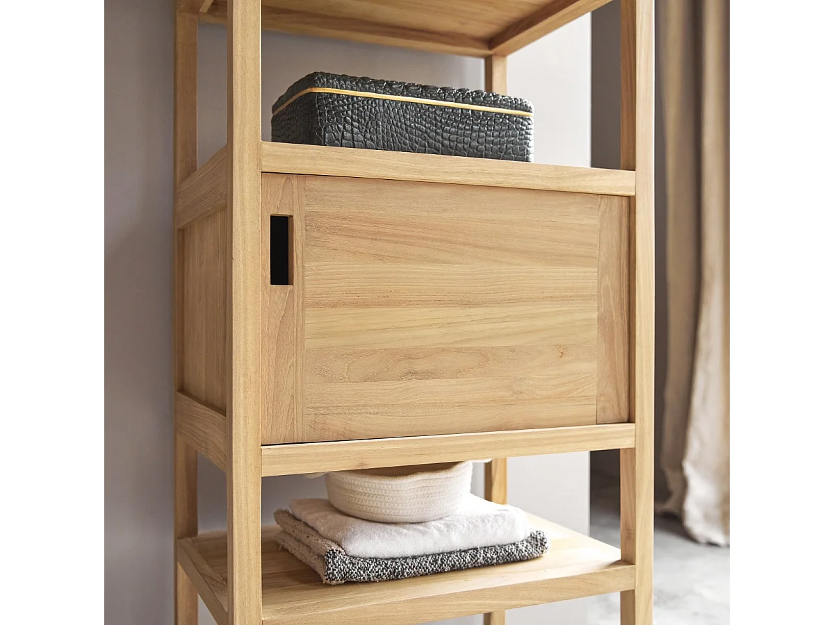 Scaffale a colonna in legno di Teak non trattato con 1 anta e 2 cassetti