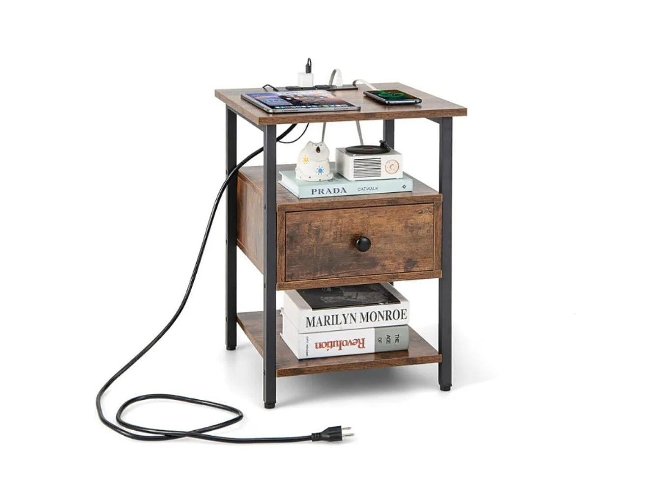 Comodino a 3 piani con stazione di ricarica ripiani aperti e cassetto struttura in metallo, Tavolino da letto in legno Marrone