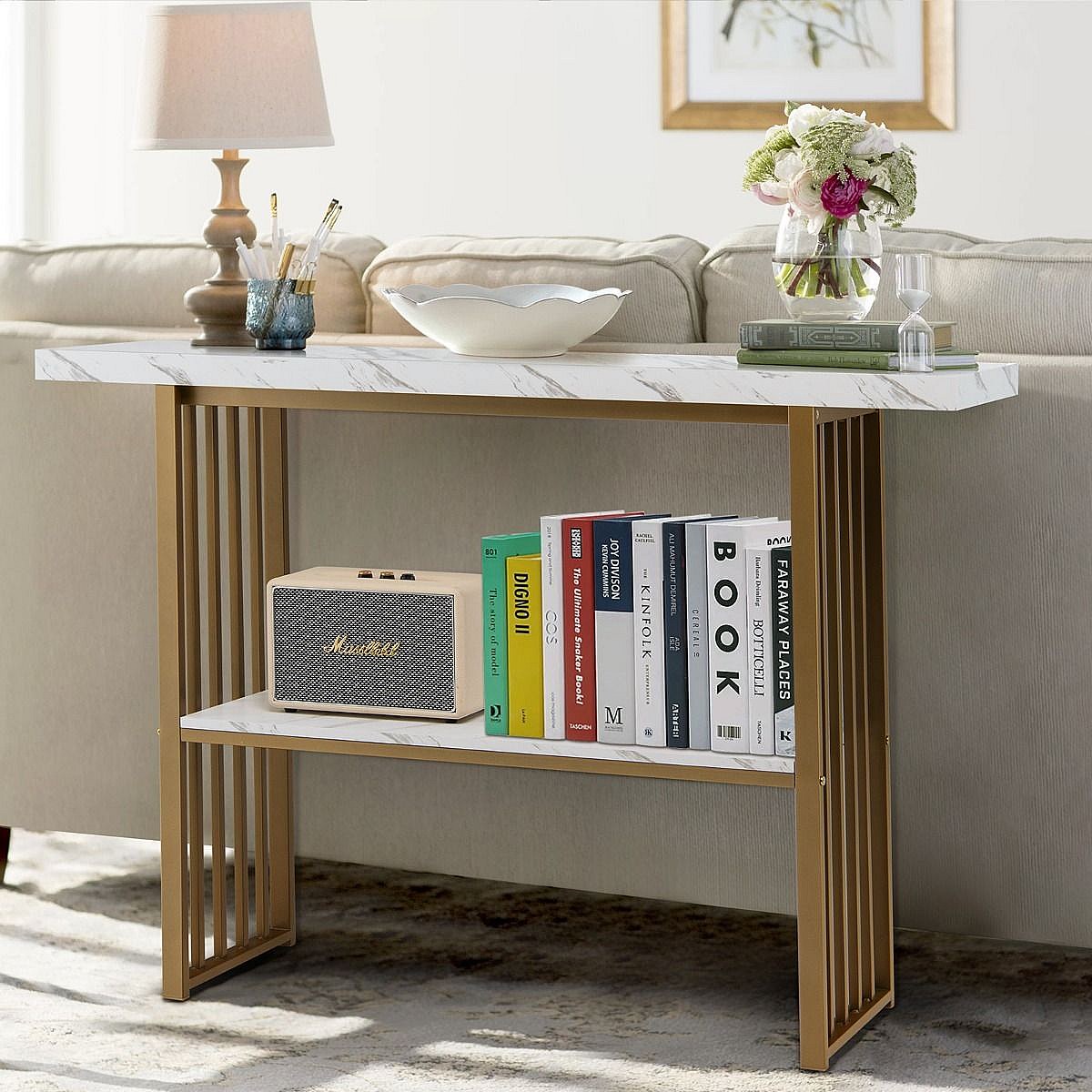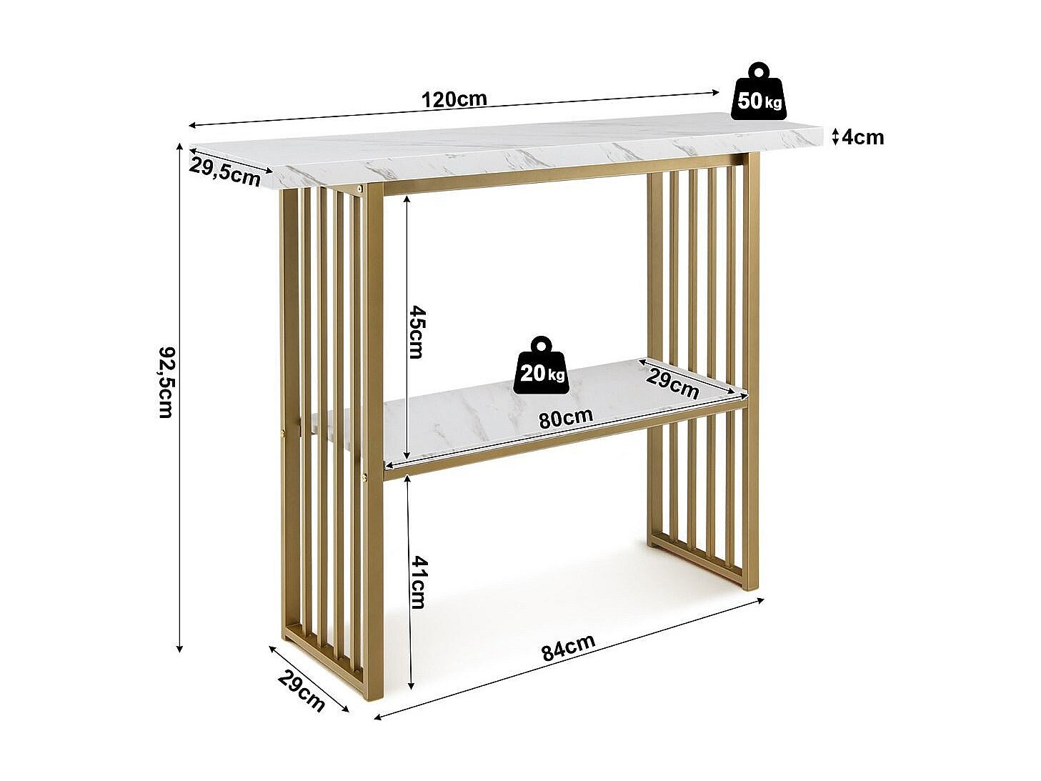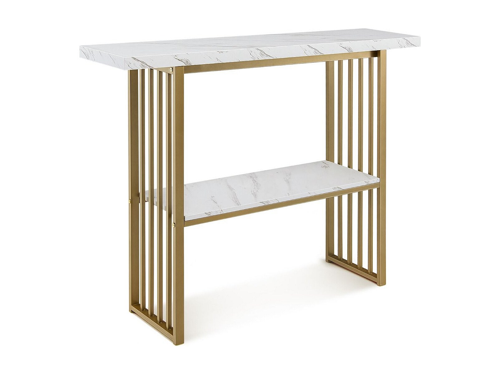 Consolle a 2 livelli con effetto marmo 120 x 29,5 x 92,5 cm Bianco e oro