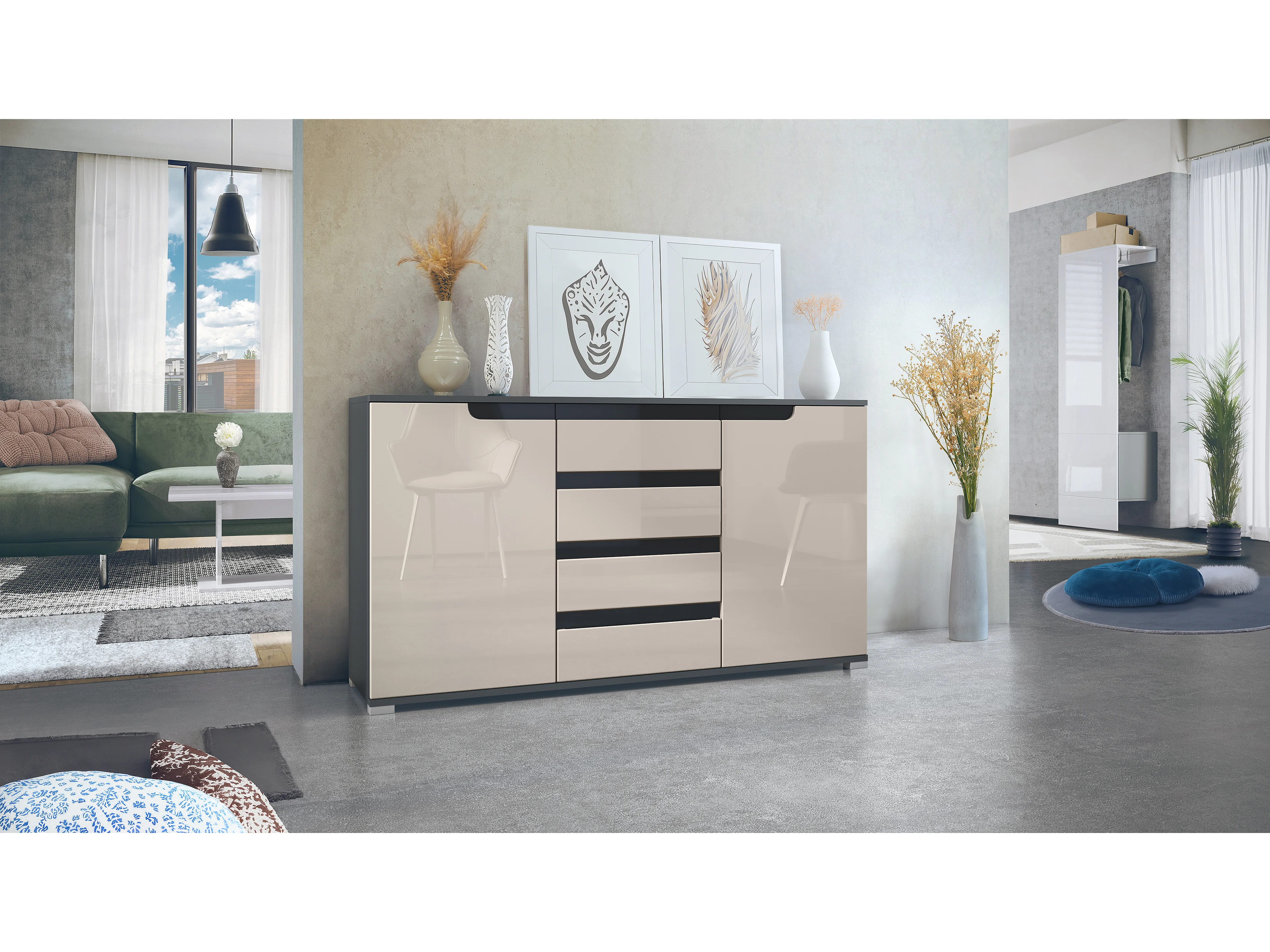 Credenza Cassettiera Sylt, struttura in nero opaco / frontale in grigio sabbia lucido con compensazioni in nero lucido (139 x 72 x 35)
