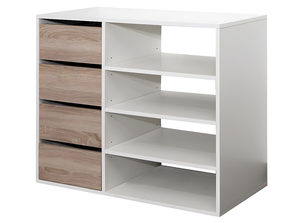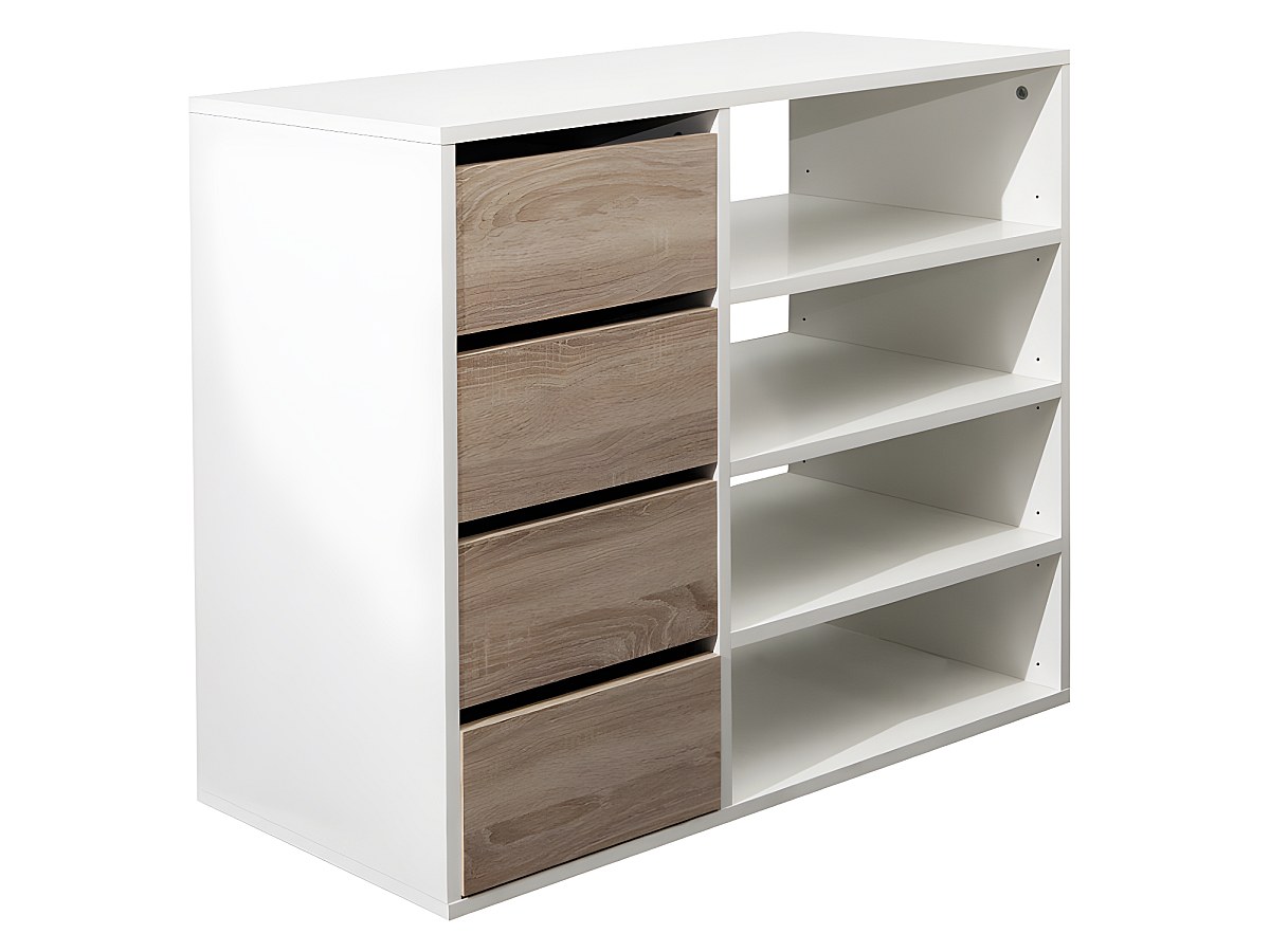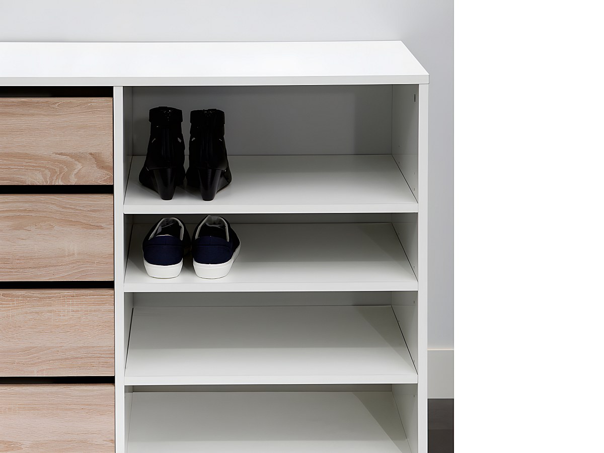 La credenza EMERIC è dotata di 4 cassetti e 4 nicchie, perfetti per organizzare e sistemare! Gli scaffali regolabili in altezza ti permettono di modificarli in funzione delle tue esigenze (sono perfetti per le scarpe alte, ad esempio).