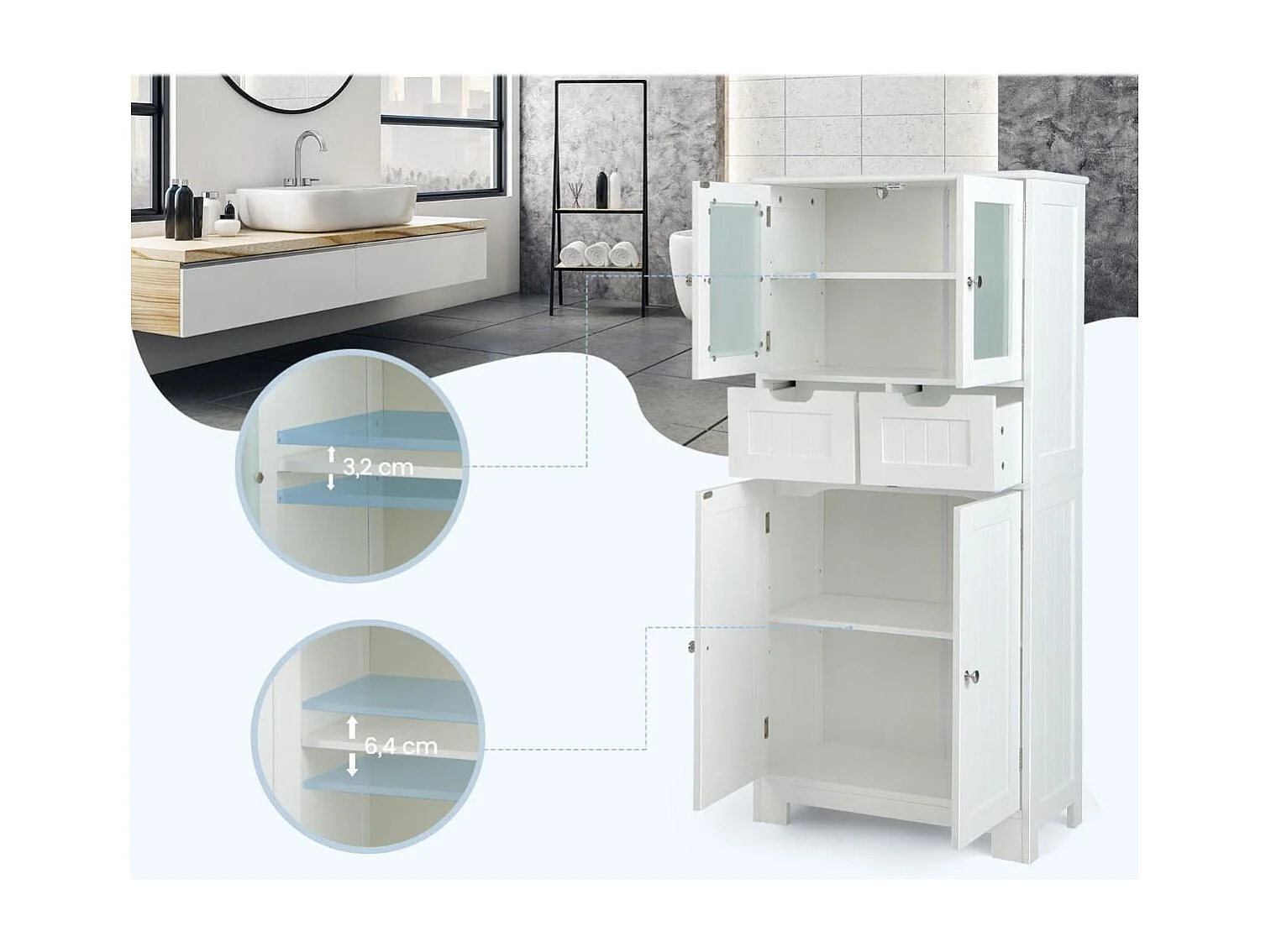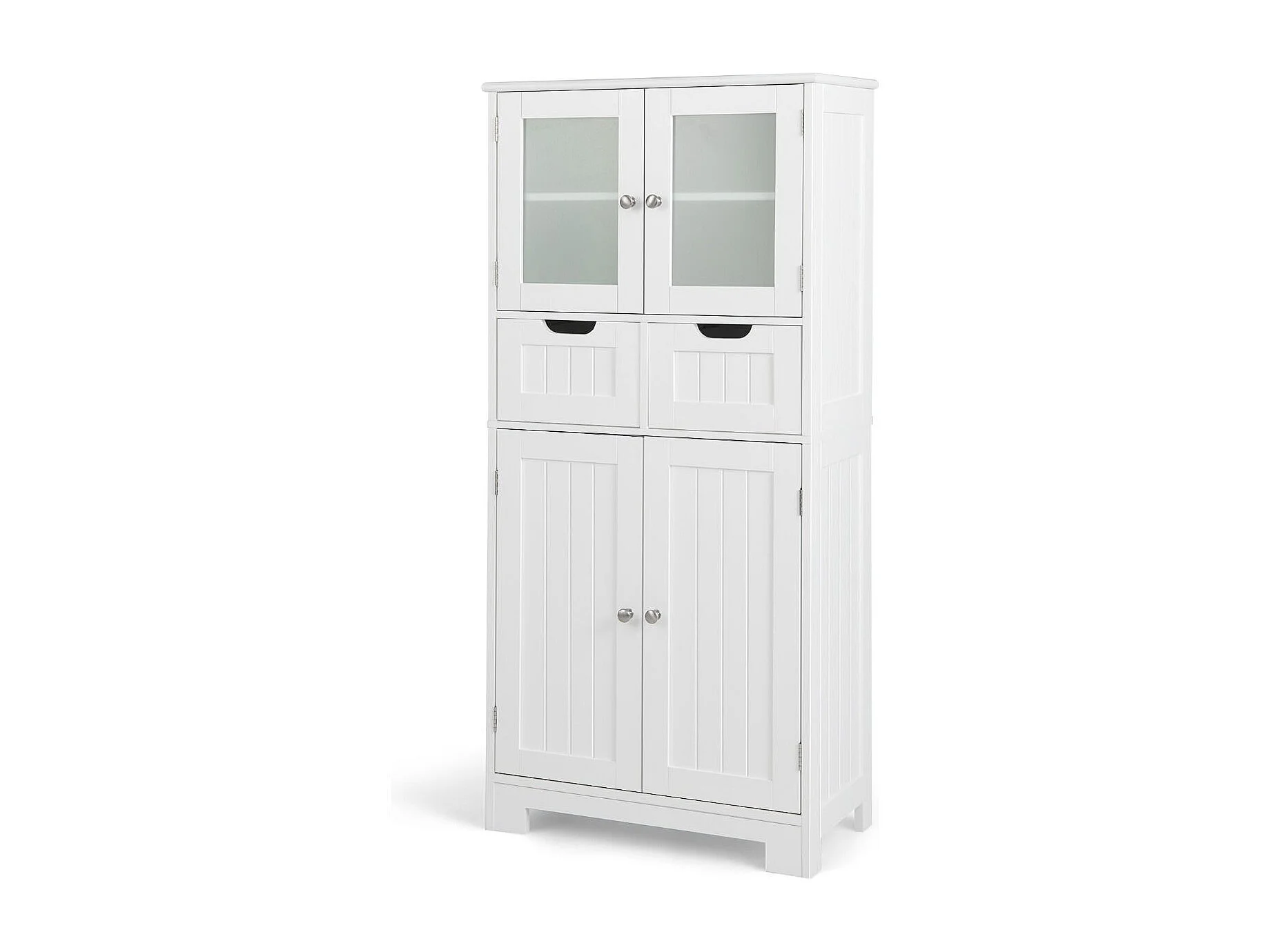 Credenza in legno Cassettiera per cucina - Bianco, 60x30x128 cm, MDF, vetro temperato, automontante