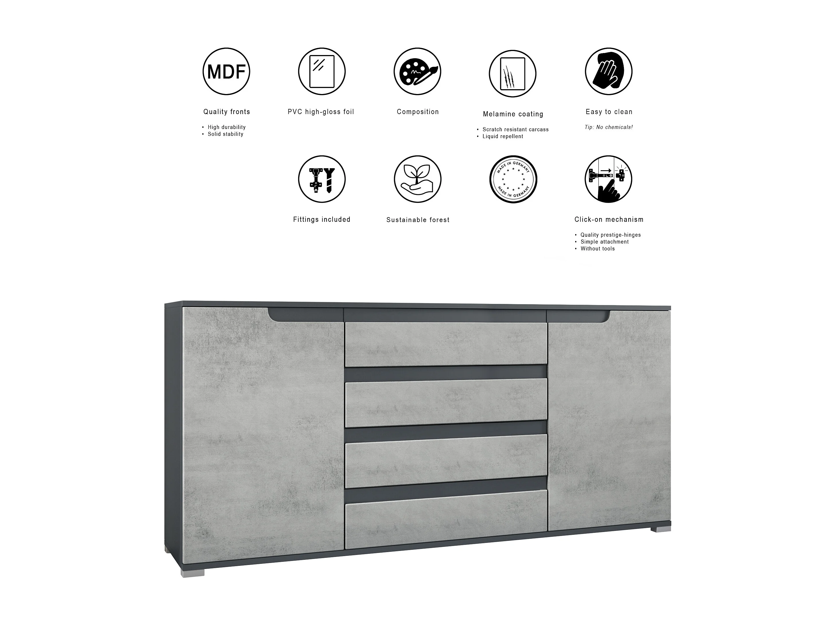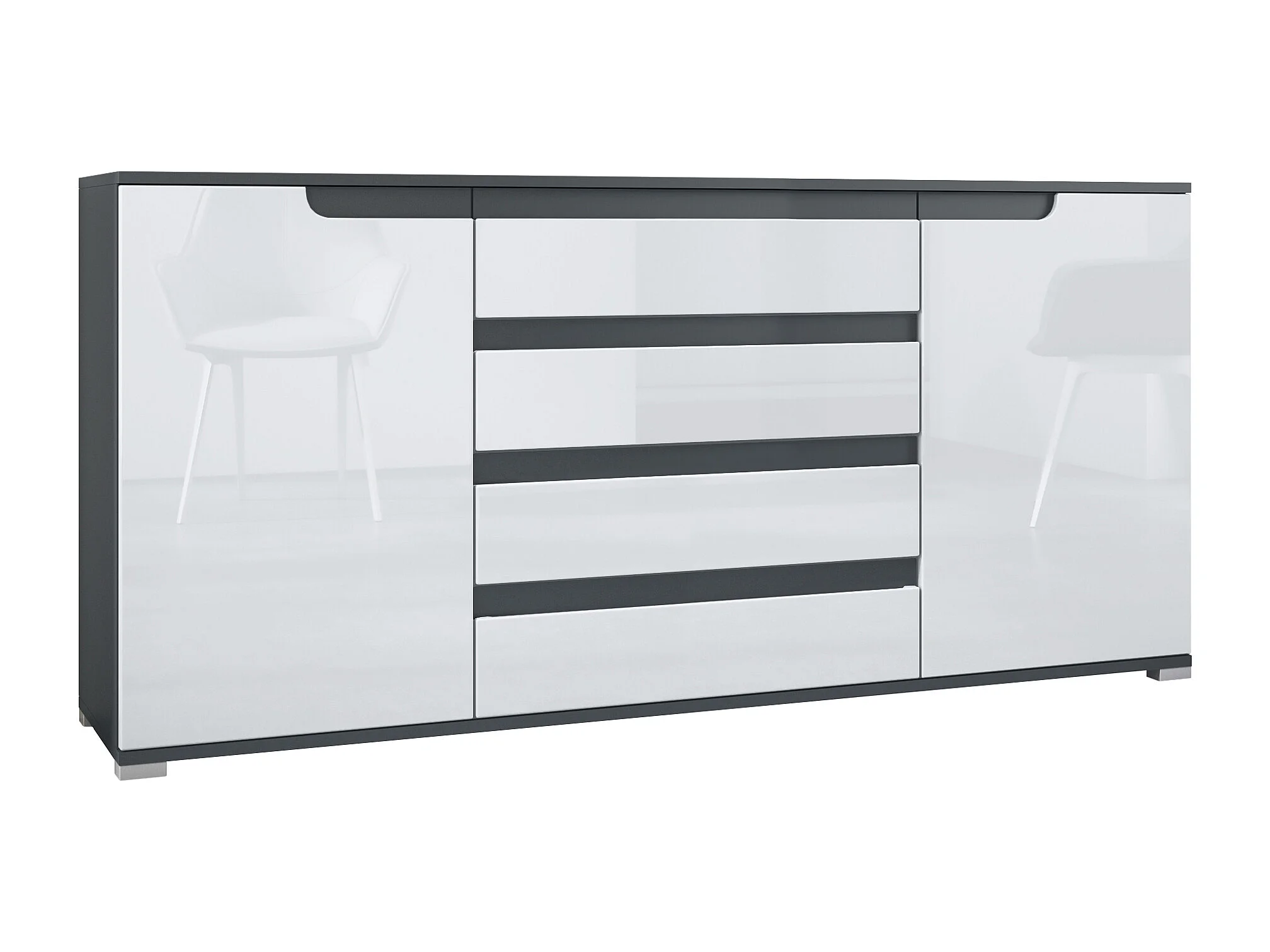 Credenza Sylt V2, Comò con 2 Ante e 4 Cassetti, Struttura - antracite opaco / Frontale - bianco lucido / Dettagli - antracite opaco (166,5 x 75,5 x 35 cm)