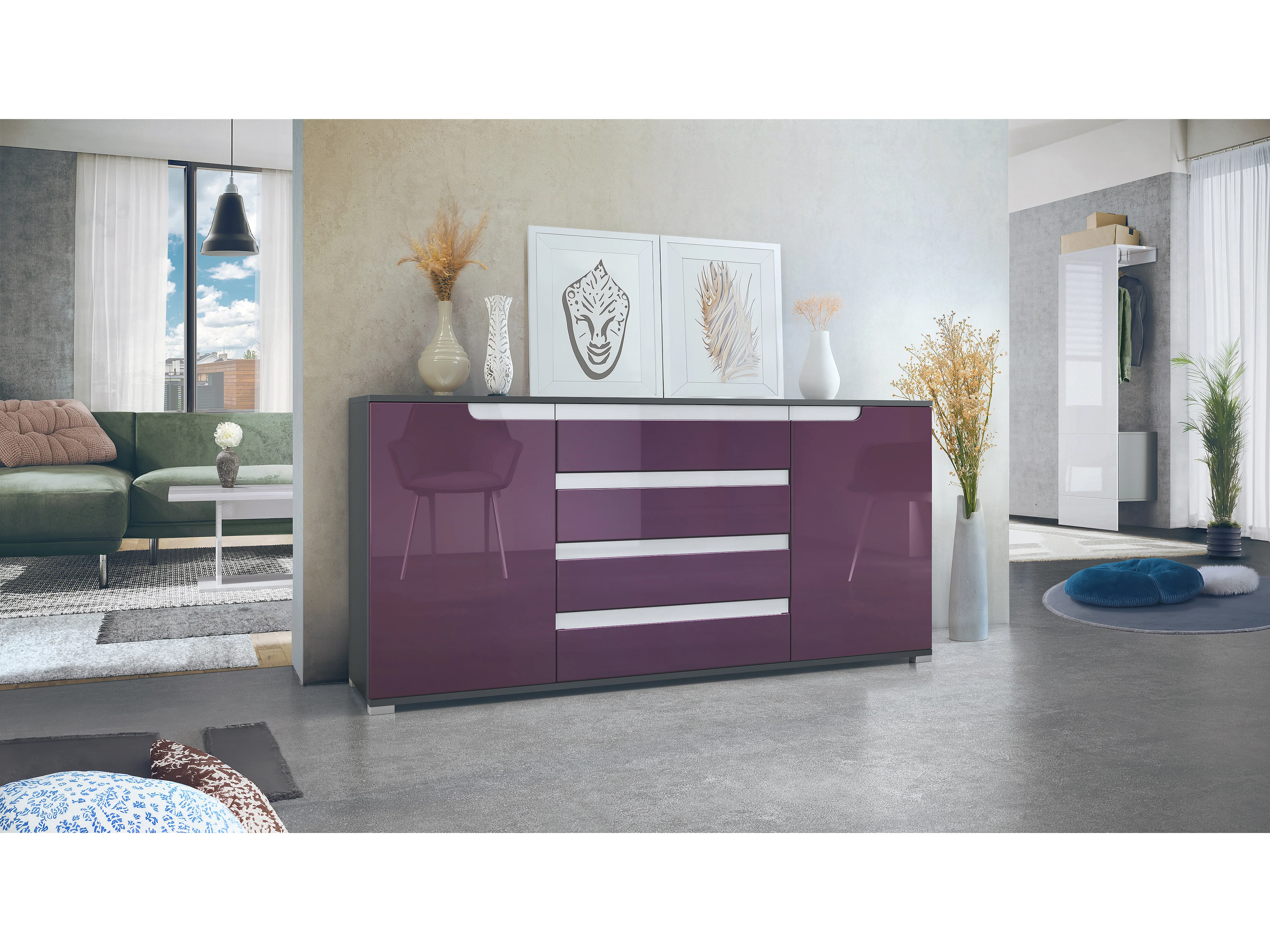 Credenza Sylt V2, Comò con 2 Ante e 4 Cassetti, Struttura - antracite opaco / Frontale - violetto porpora lucido / Dettagli - bianco lucido (166,5 x 75,5 x 35 cm)