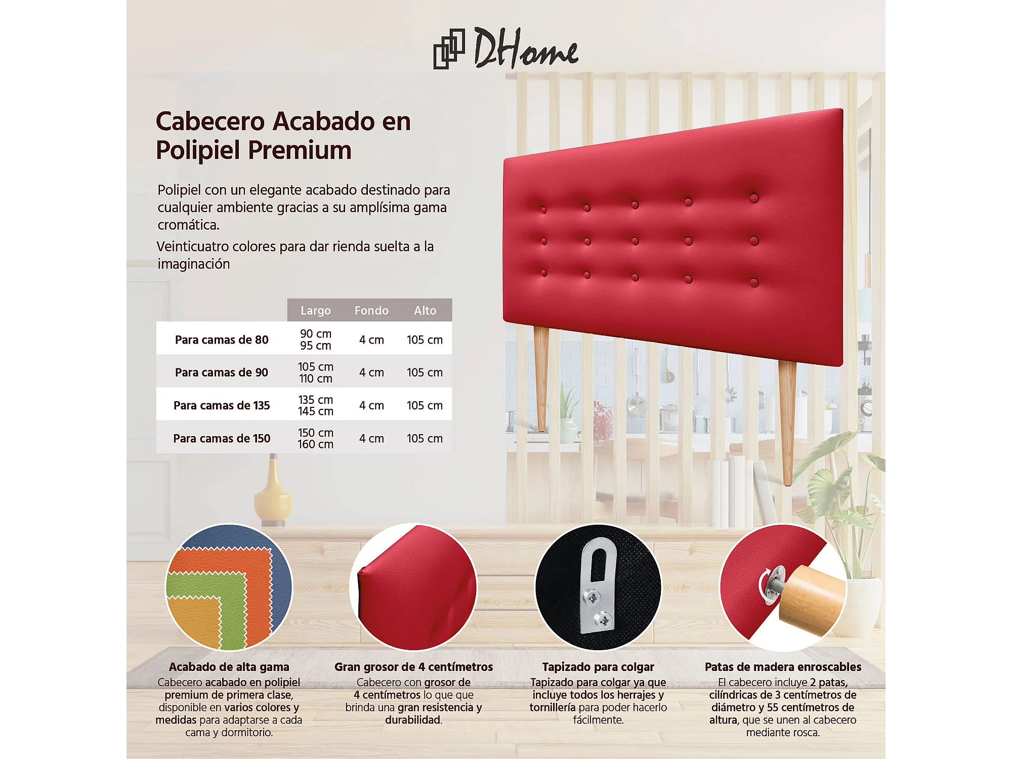DHOME Testiera in ecopelle con 3 file di bottoni Testiera imbottita per letto di lusso (Rosso, 95cm)