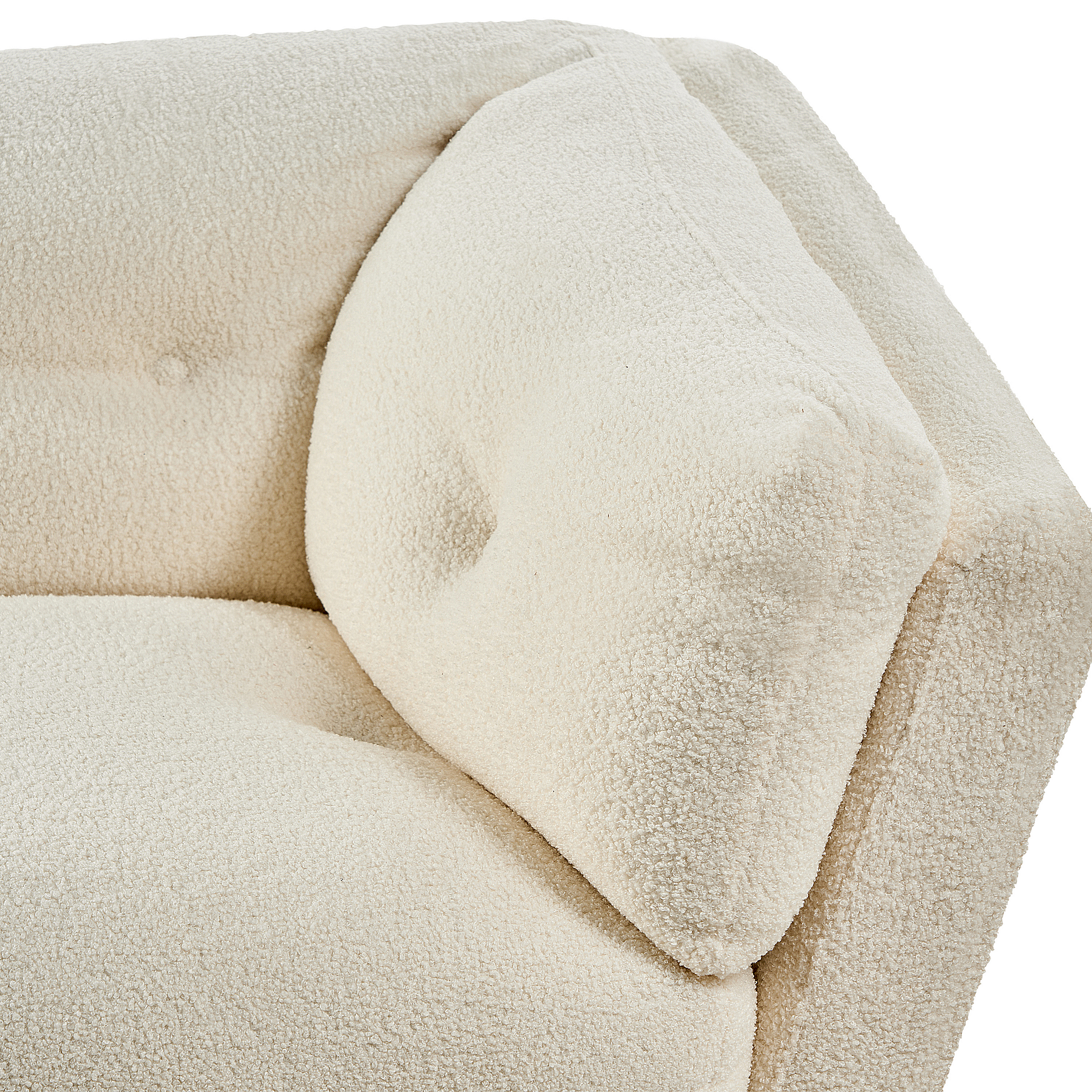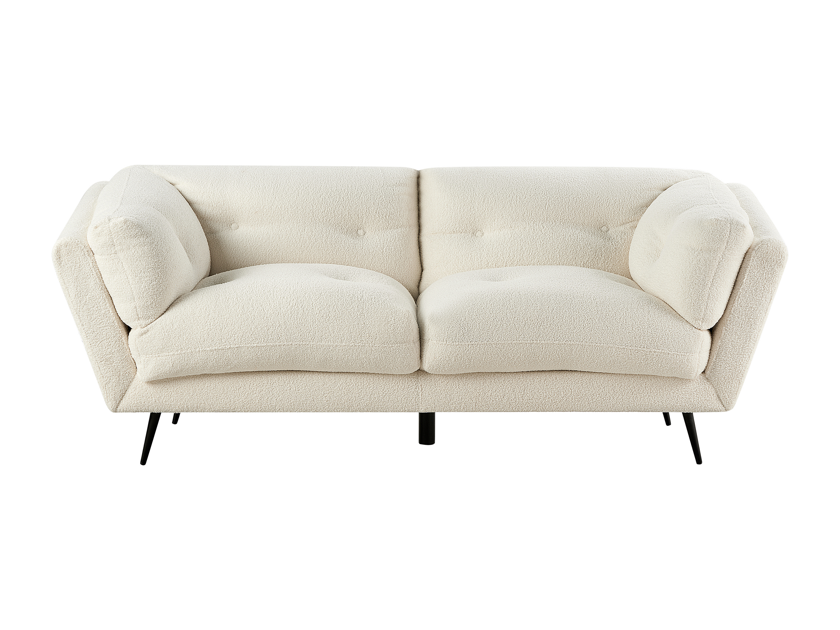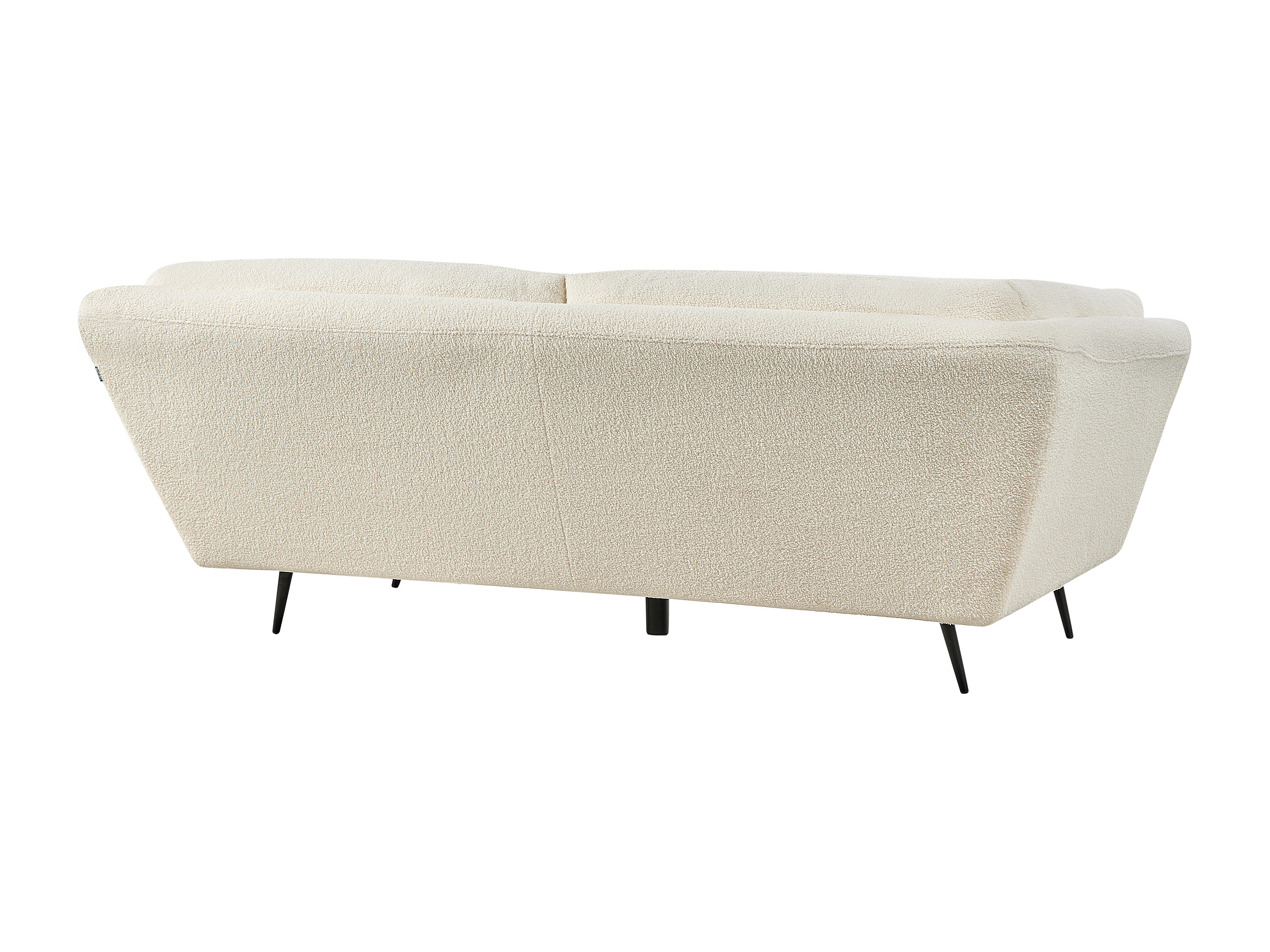 Ampio divano imbottito rivestito in bouclé. Questo divano a 3 posti dona un tocco di eleganza a un soggiorno in stile moderno, retrò o glam. Realizzato in bouclé di altissima qualità, presenta cuscini di seduta e braccioli generosamente imbottiti pensati per il massimo comfort, mentre i robusti piedi in metallo assicurano una stabilità ottimale.
