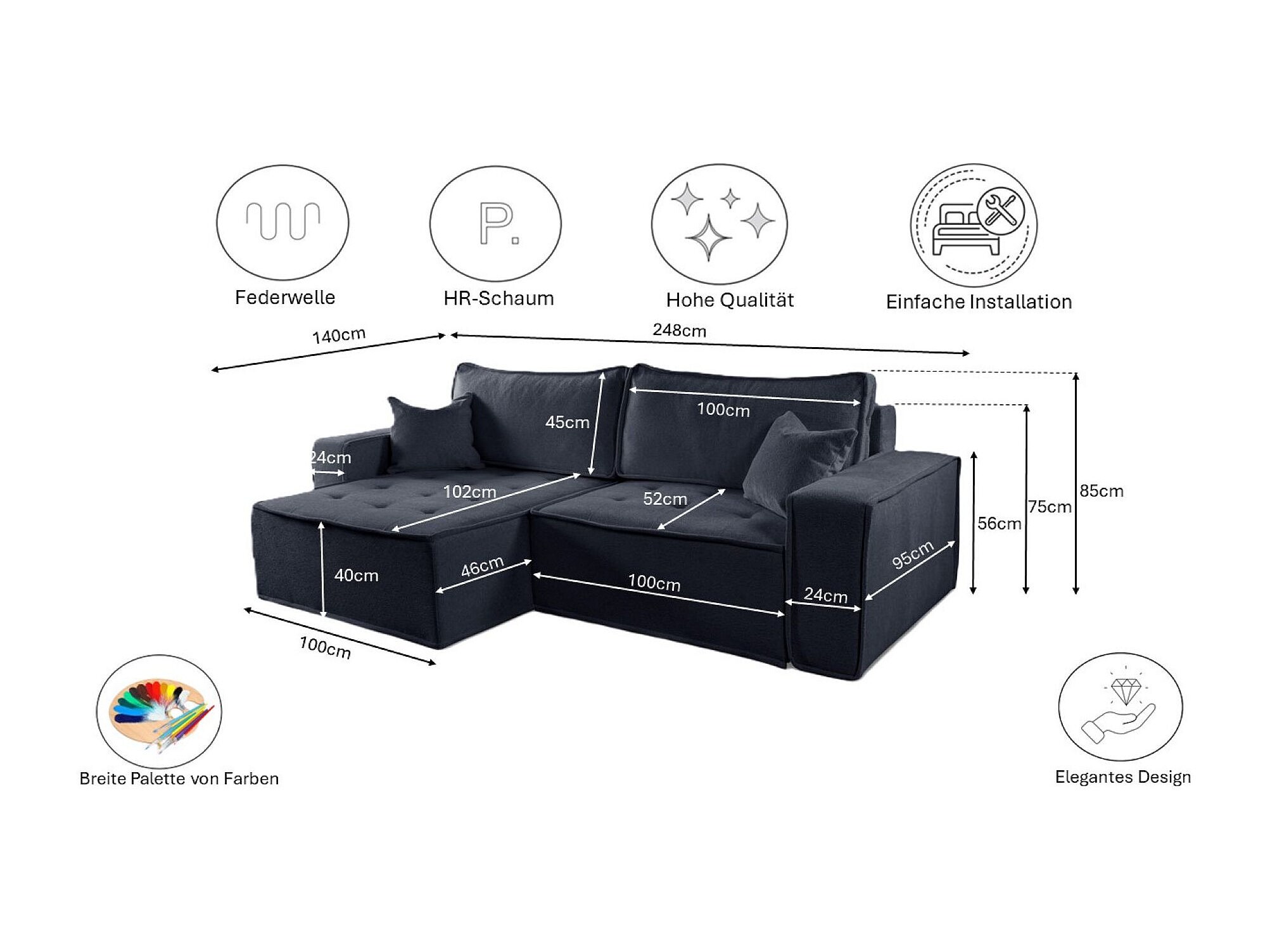 Divano angolare a L Bohoo con letto, tessuto Raven, grafite, sinistra