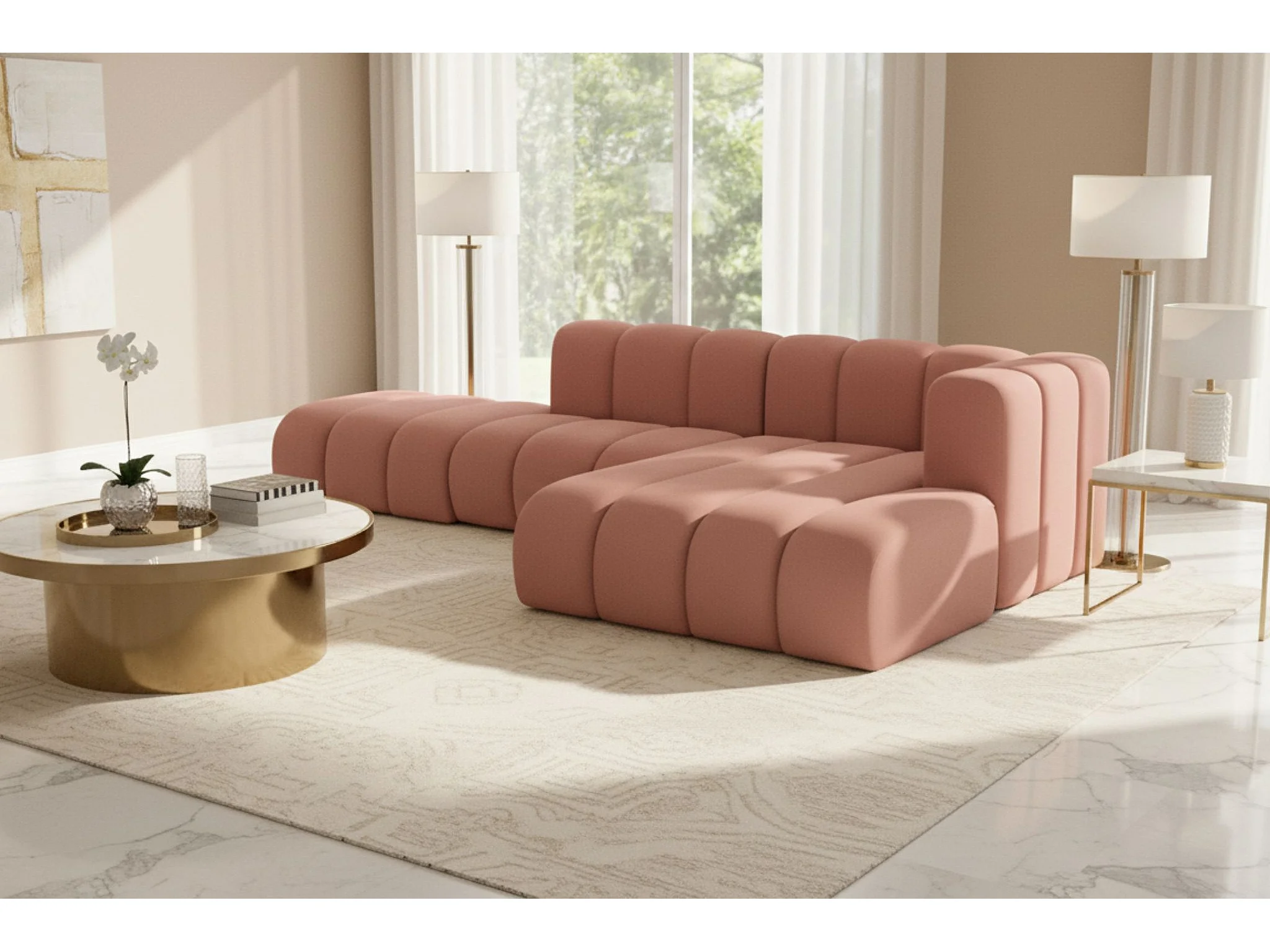 Divano angolare a L con pouf, Grand Mini, tessuto Salvador, rosa, a destra