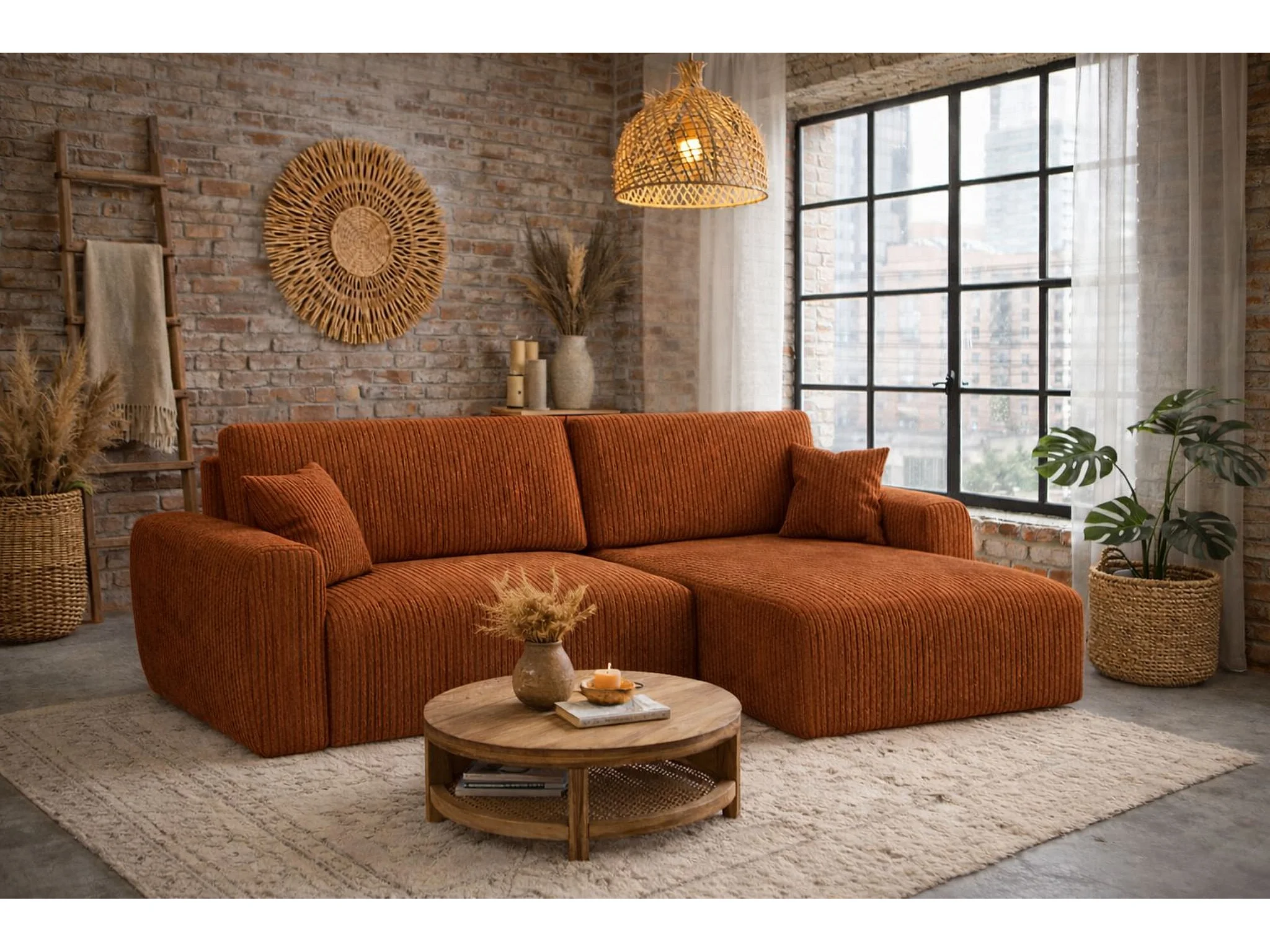 Divano angolare con funzione letto e vano contenitore, Ariel XL, tessuto velluto a coste, tessuto Poso, rame, lato destro
