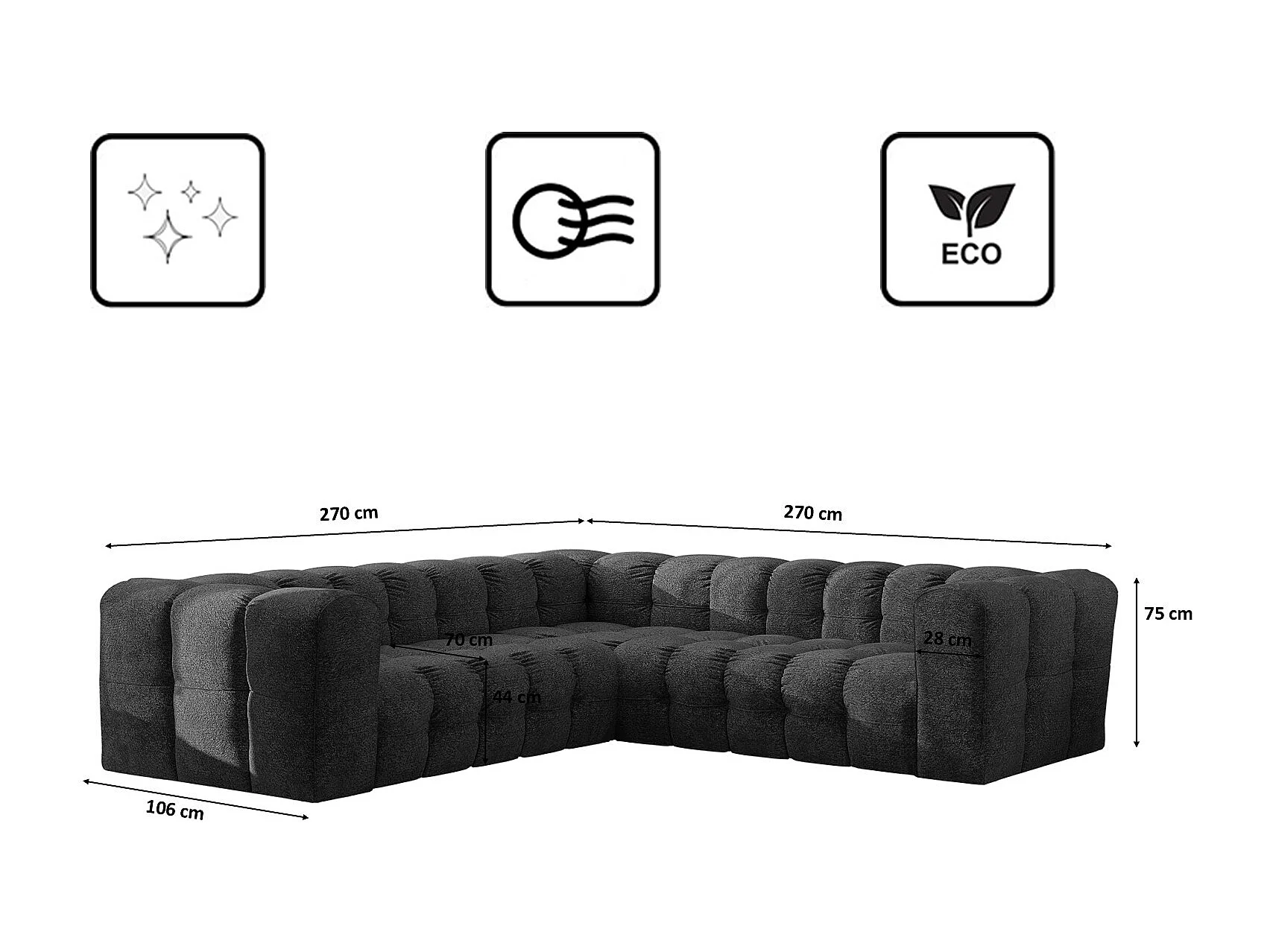 Divano angolare corner con impunture BALOO, tessuto chenille Arena, Grafite