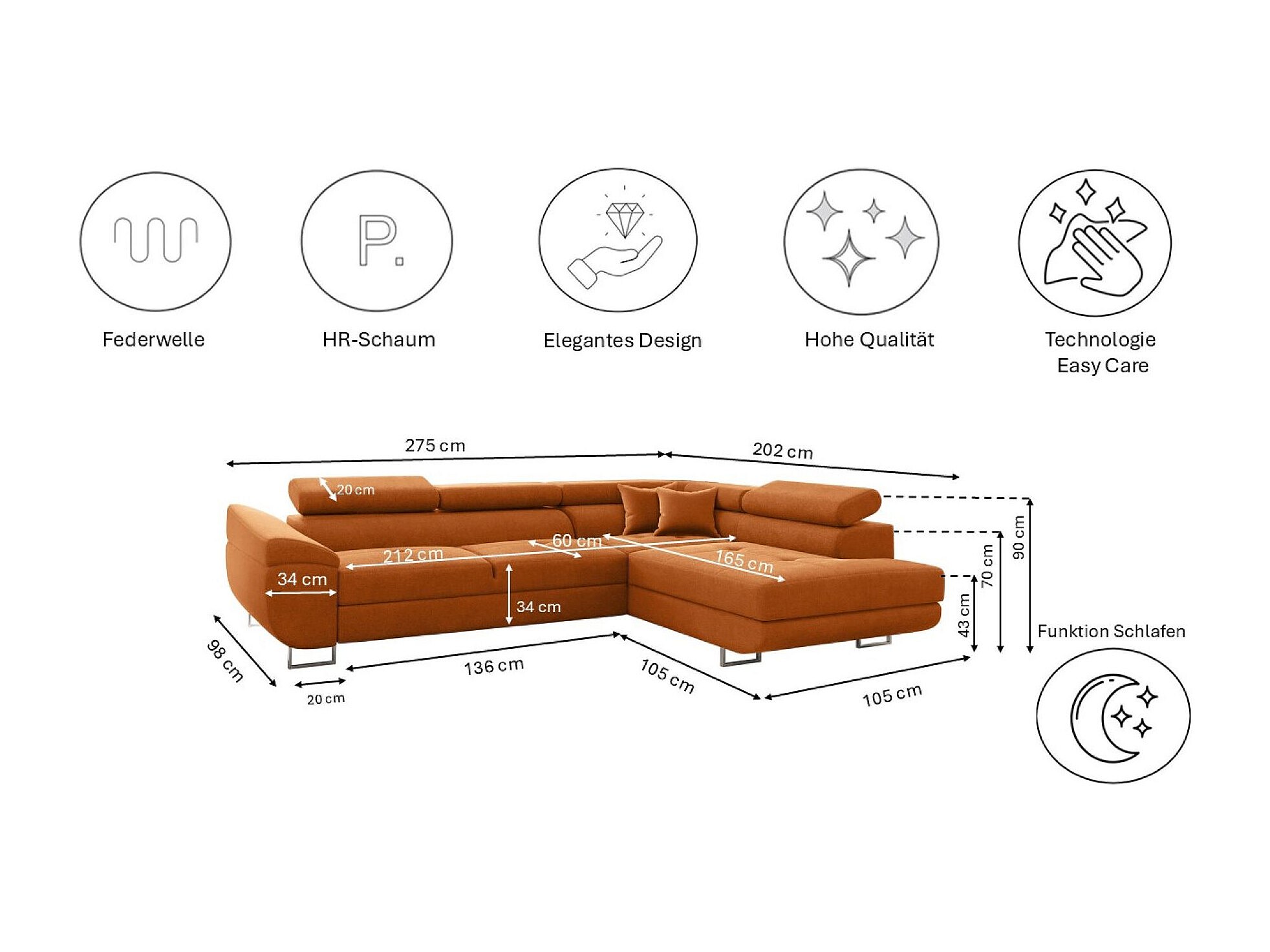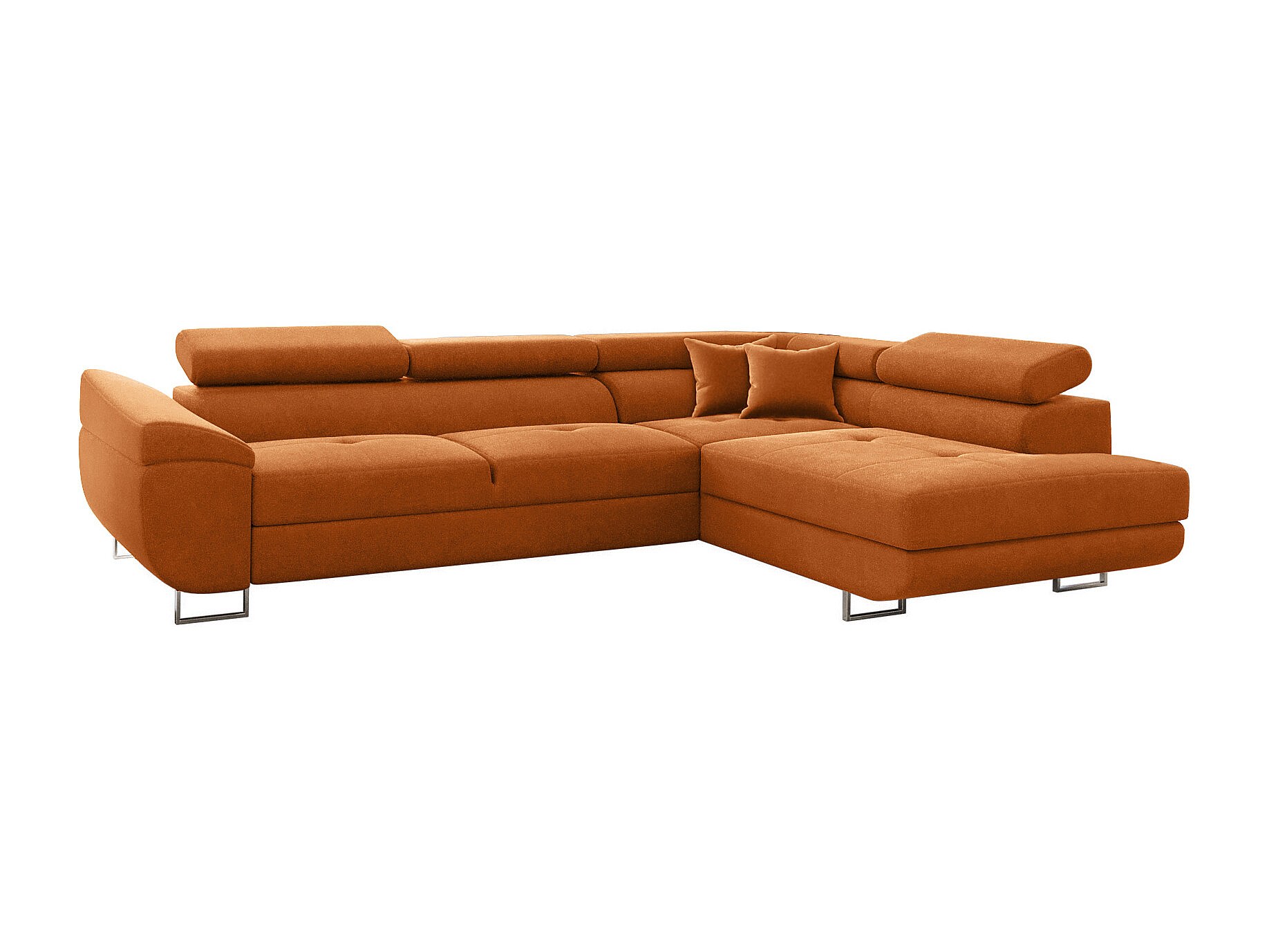 Divano angolare FALIO a L con funzione letto, tessuto Noel, arancione, destra