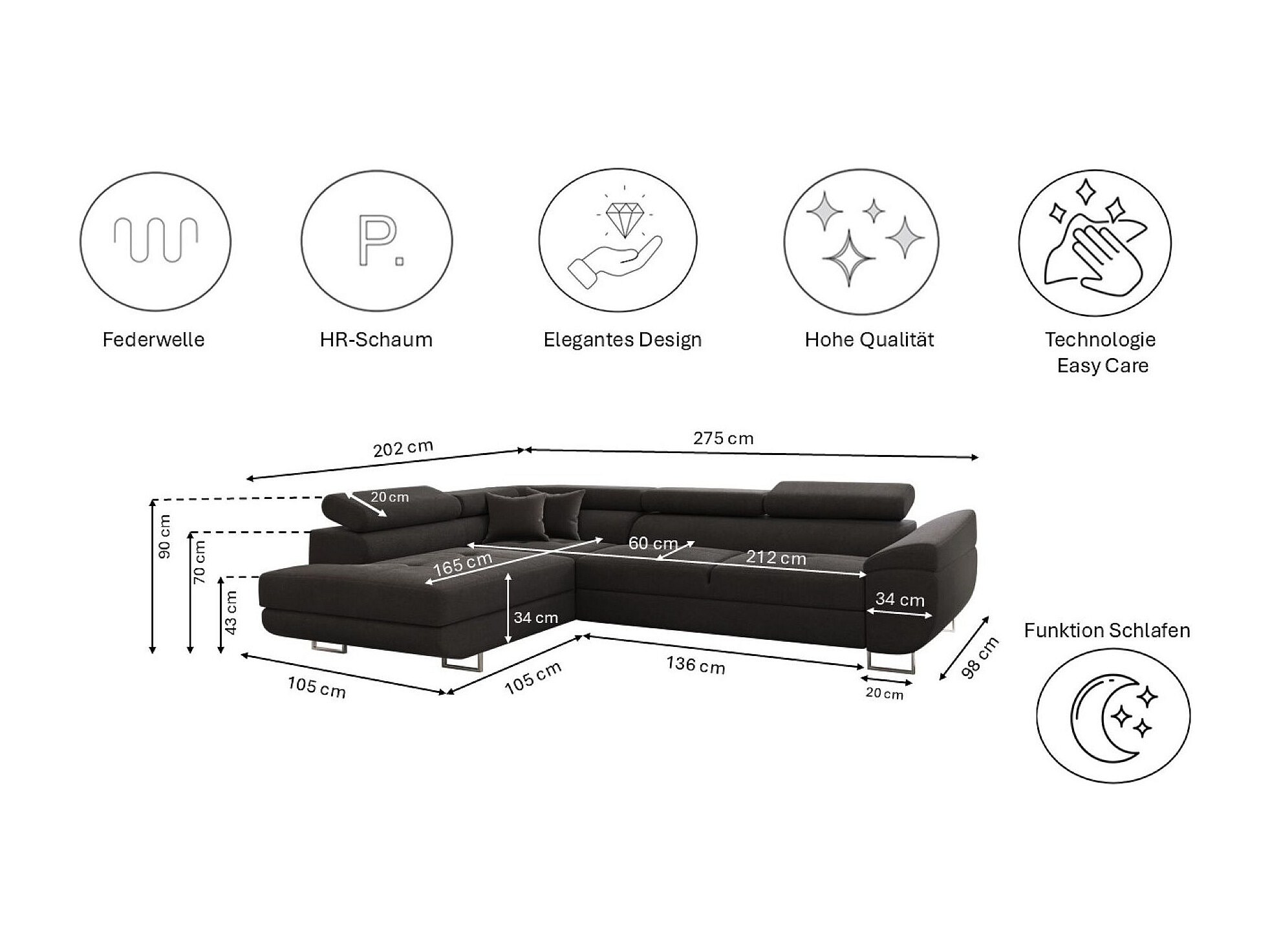 Divano angolare FALIO a L con funzione letto, tessuto Noel, grafite, sinistro