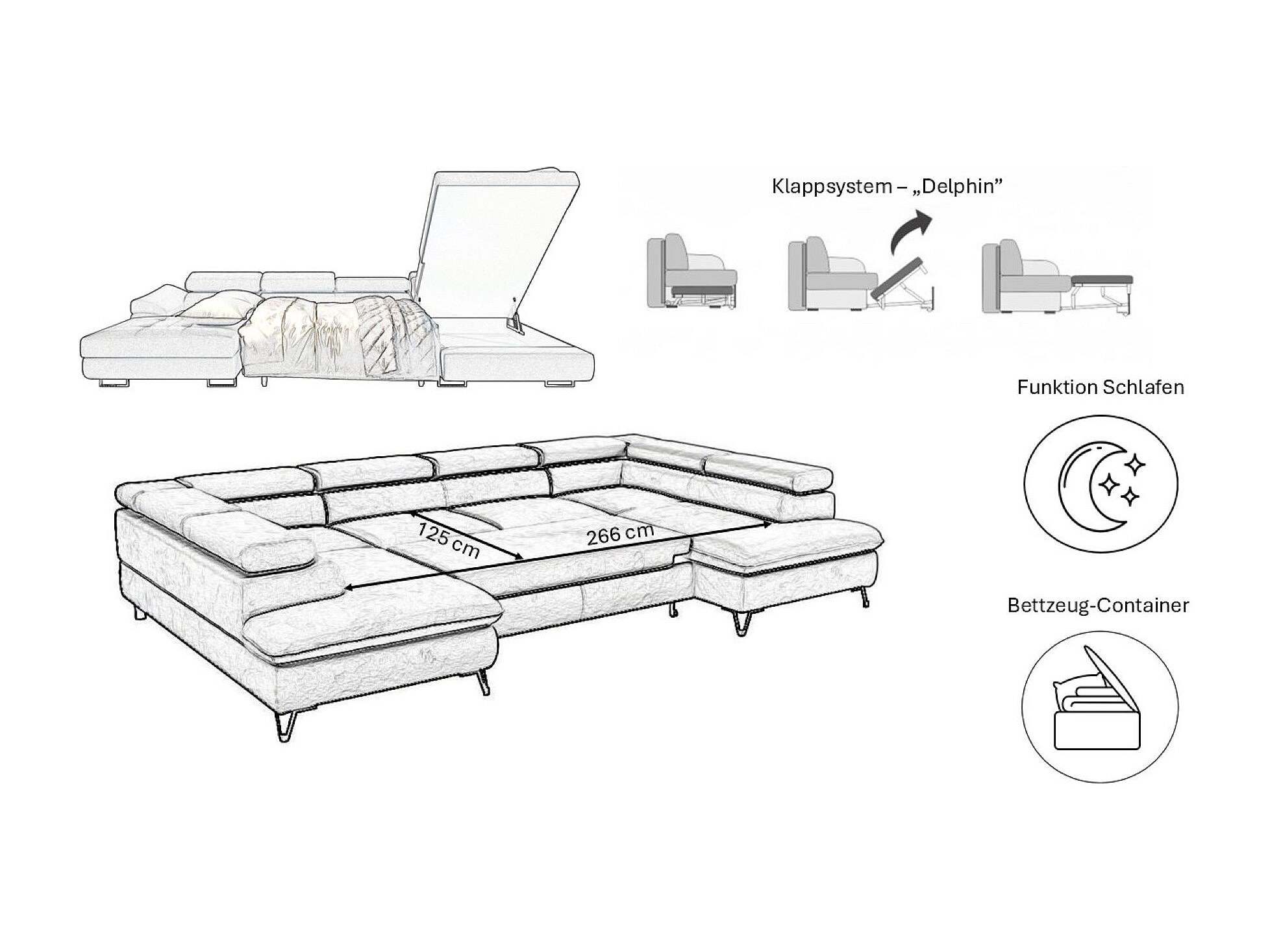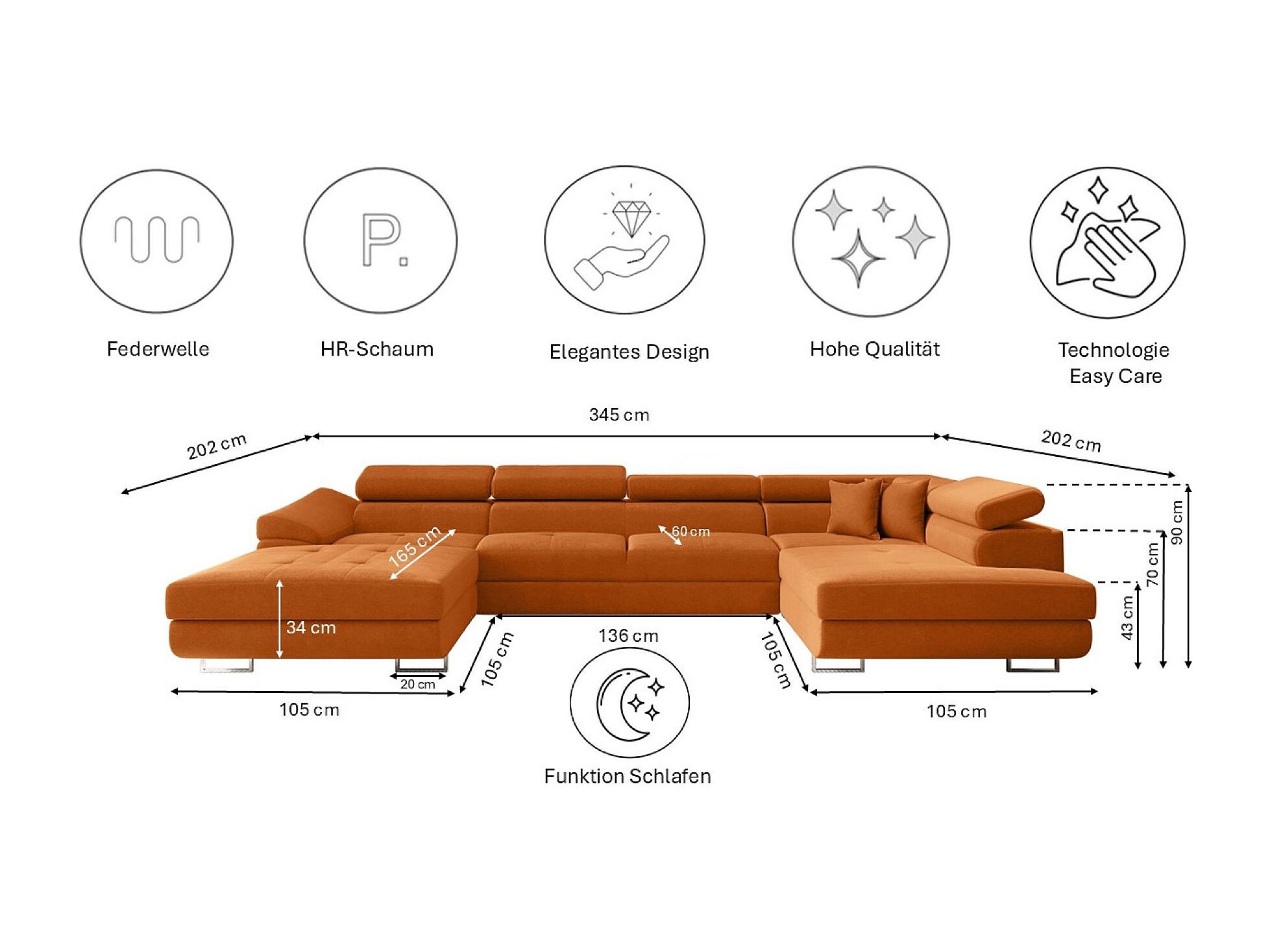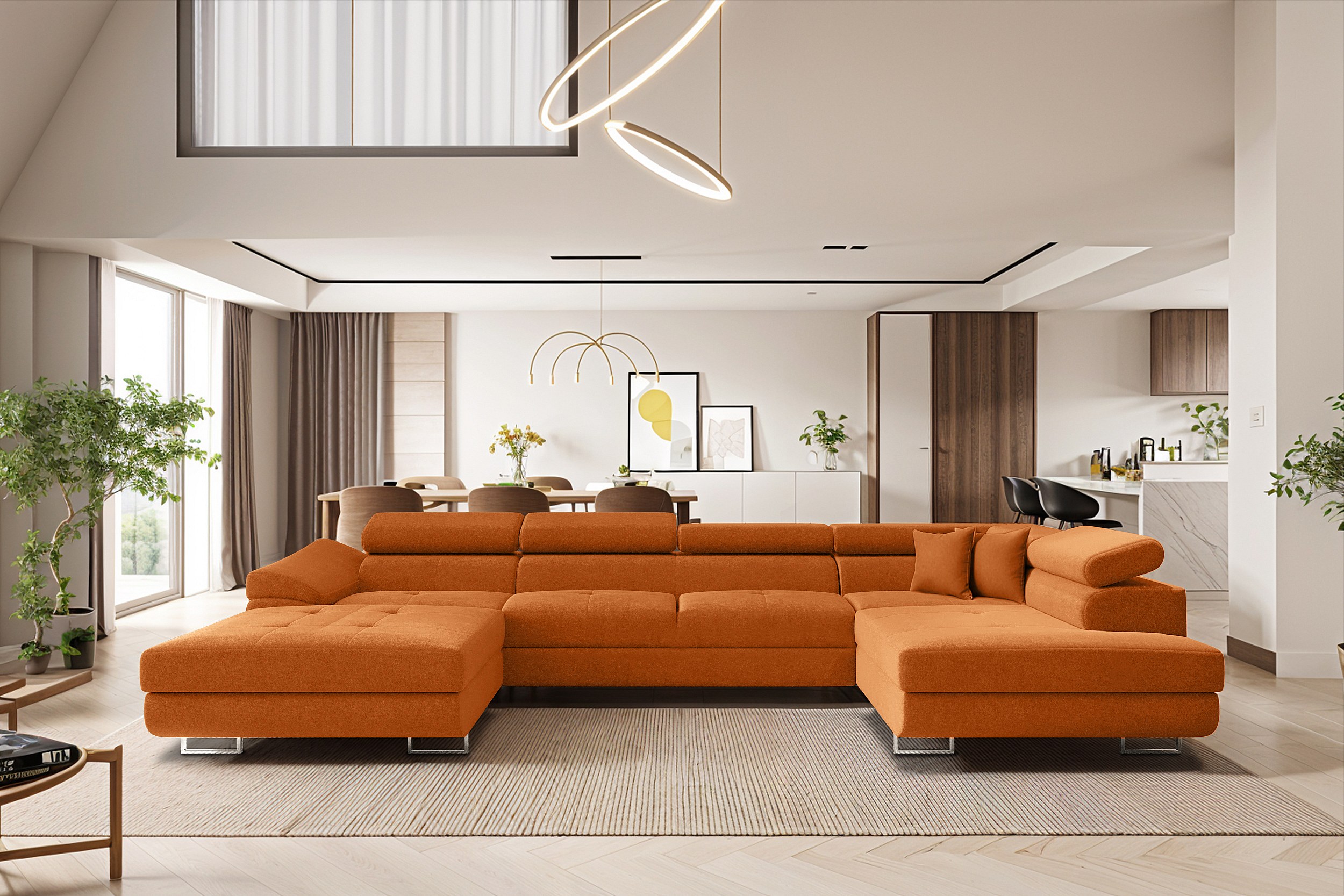 Divano angolare FALIO II a U con funzione letto, tessuto Noel, arancione, a destra