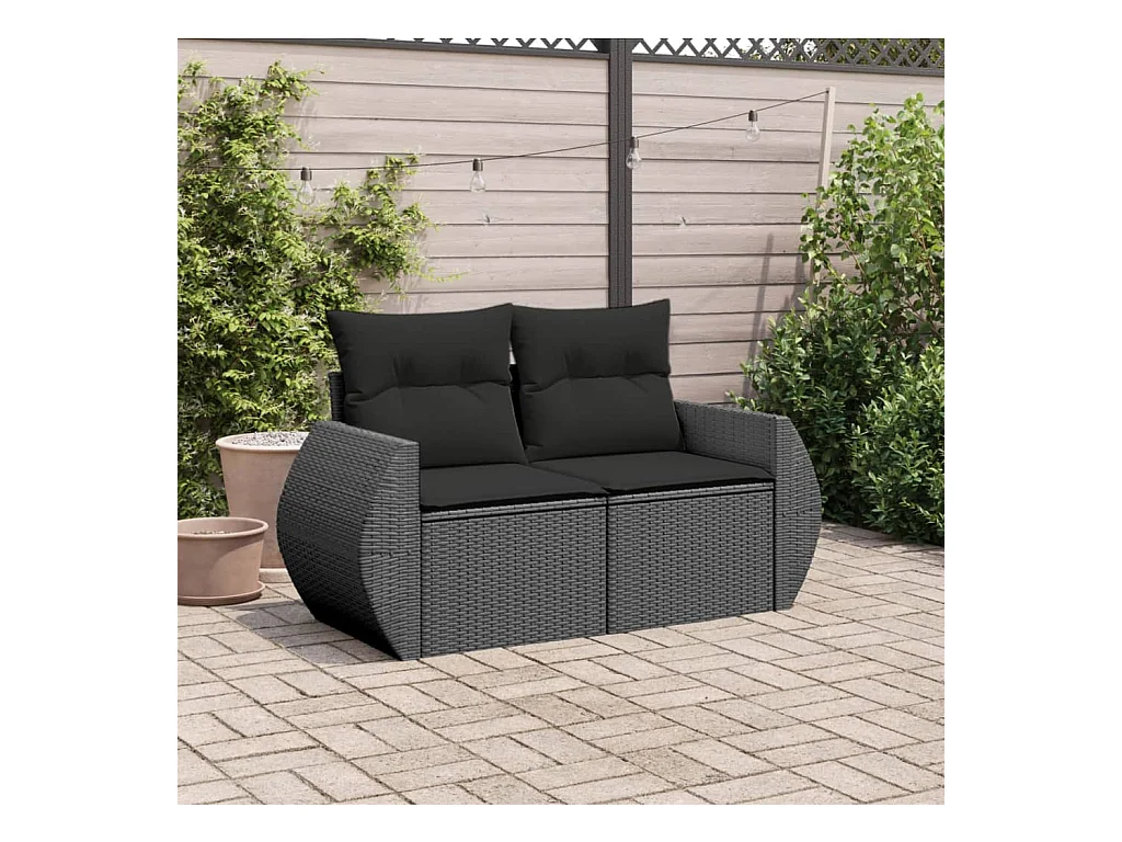 Divano da giardino con cuscini a 2 posti, resina intrecciata nera