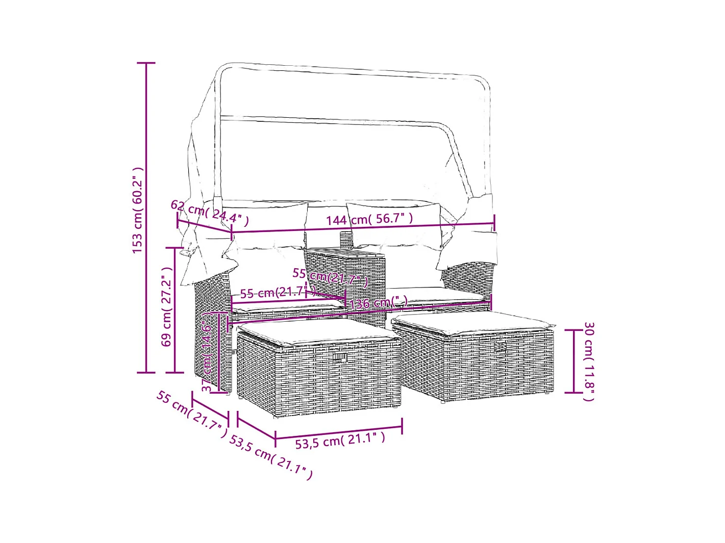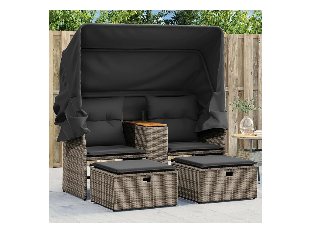 Divano Giardino 2Posti Baldacchino e Sgabelli Grigio Polyrattan