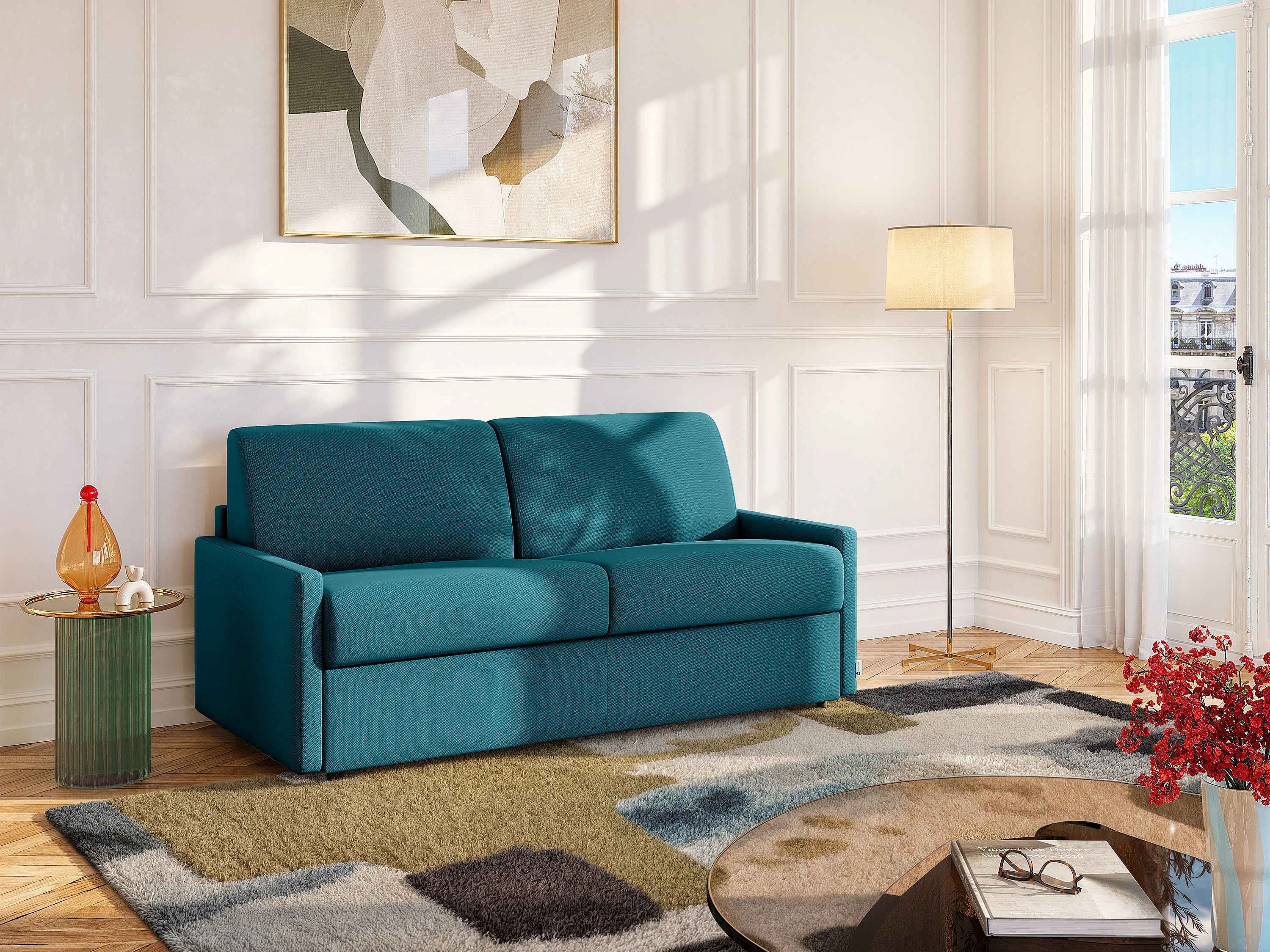 Divano letto 2 posti a ribalta in Tessuto Turchese - Larghezza Materasso 120 cm memory foam - Spessore 22 cm - CALIFE