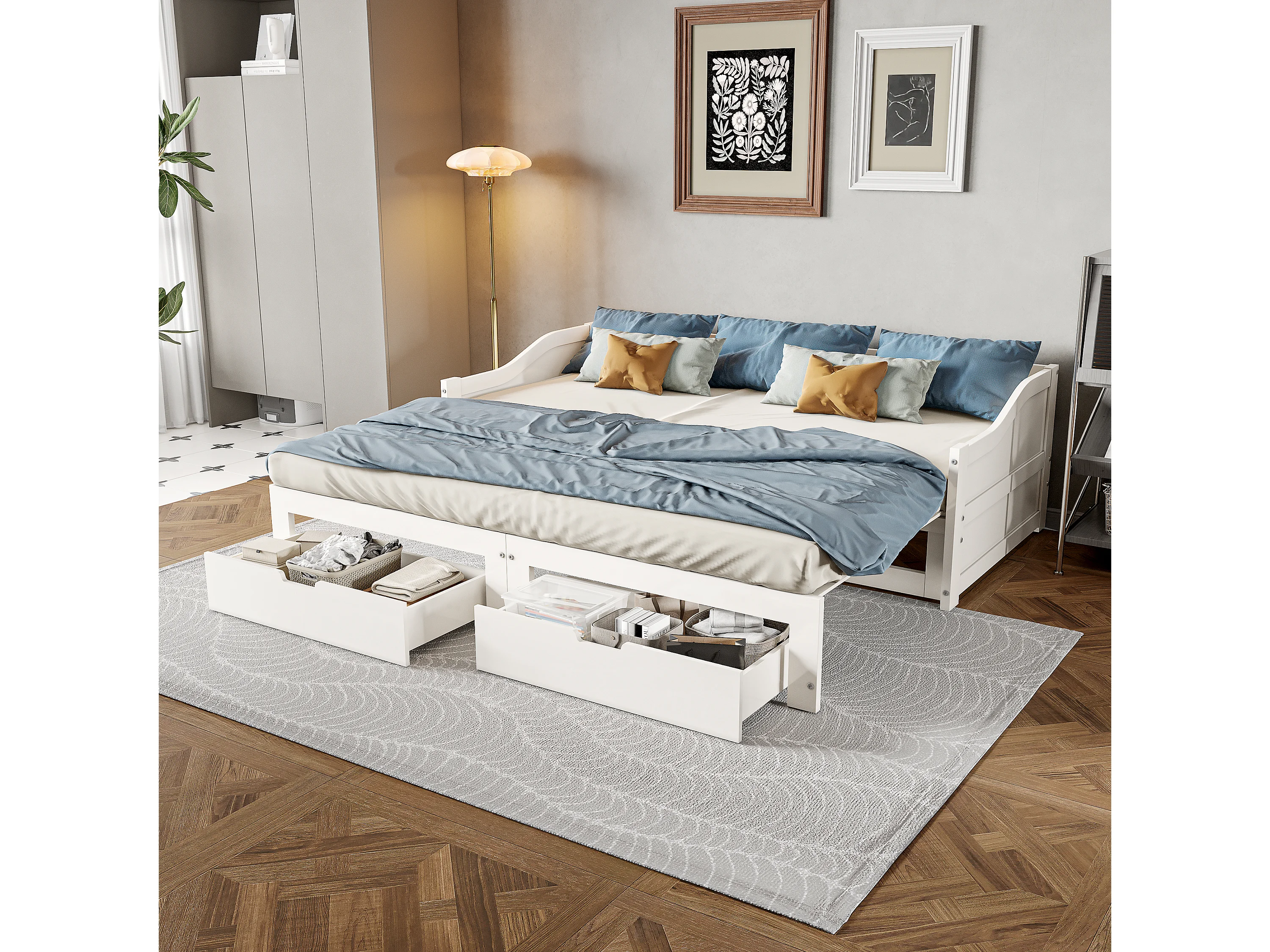Divano letto 2 posti 90/180 x 200 cm con cassetti e rete a doghe, struttura estensibile, bianco