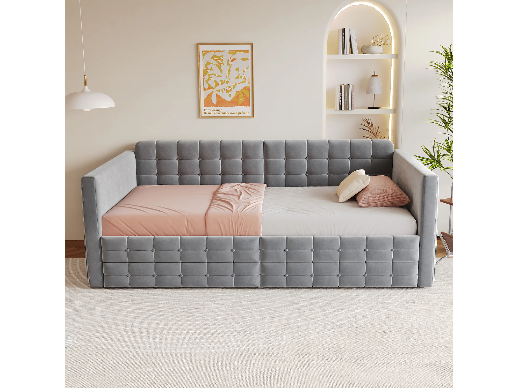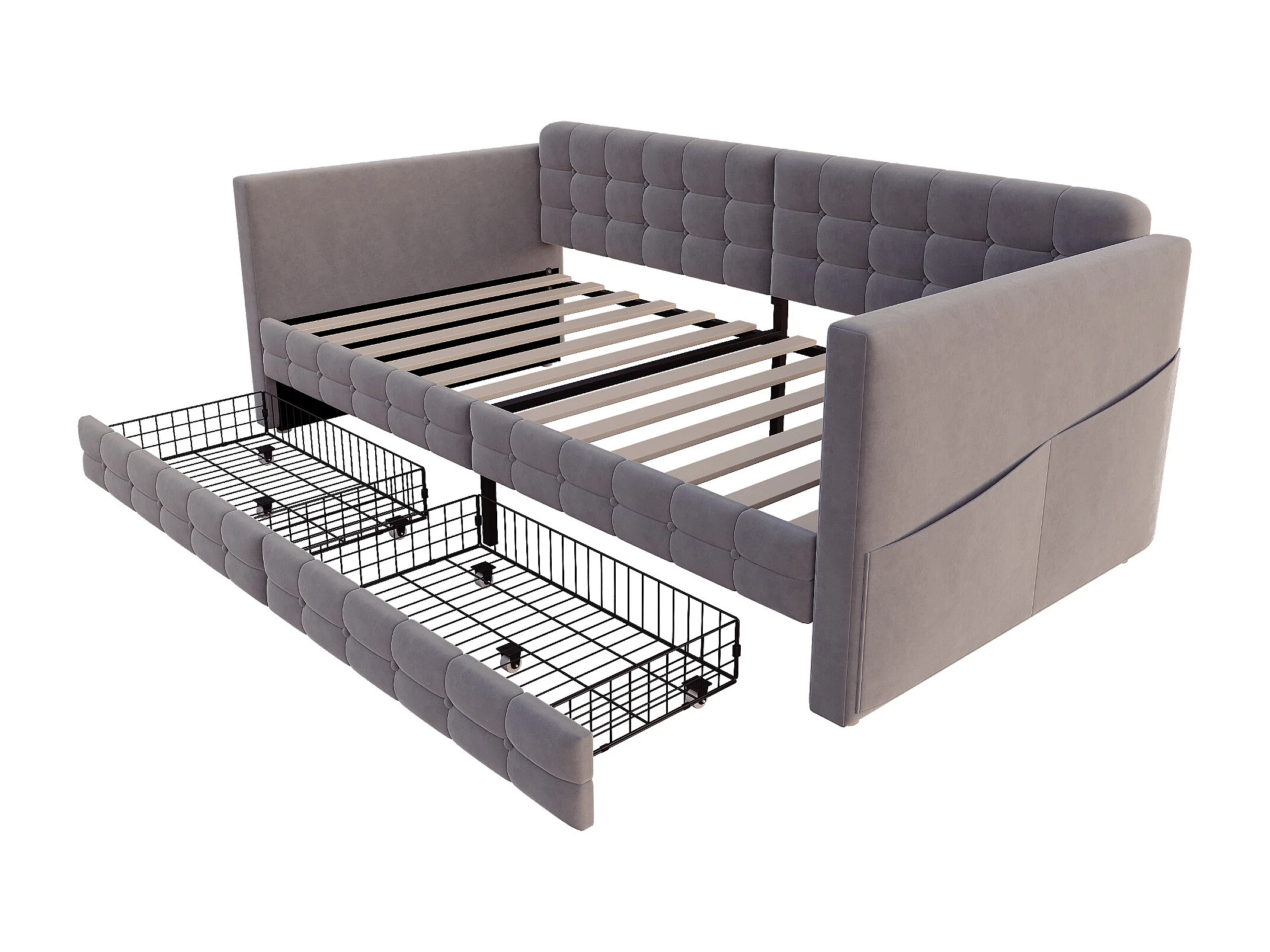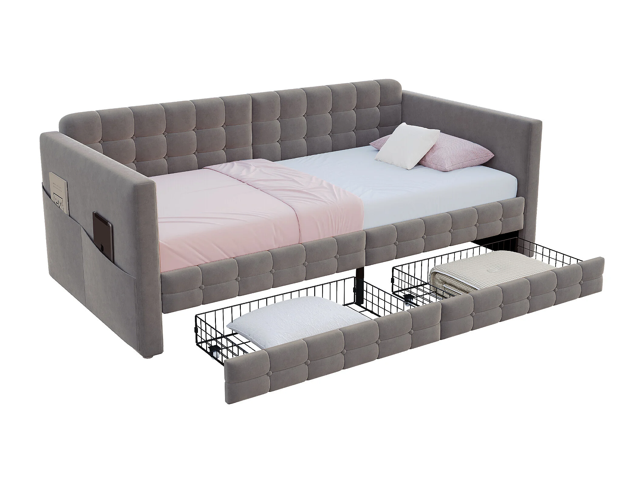 Divano letto imbottito 90x190 cm - con 2 cassetti - tessuto velluto - grigio (materasso non incluso)