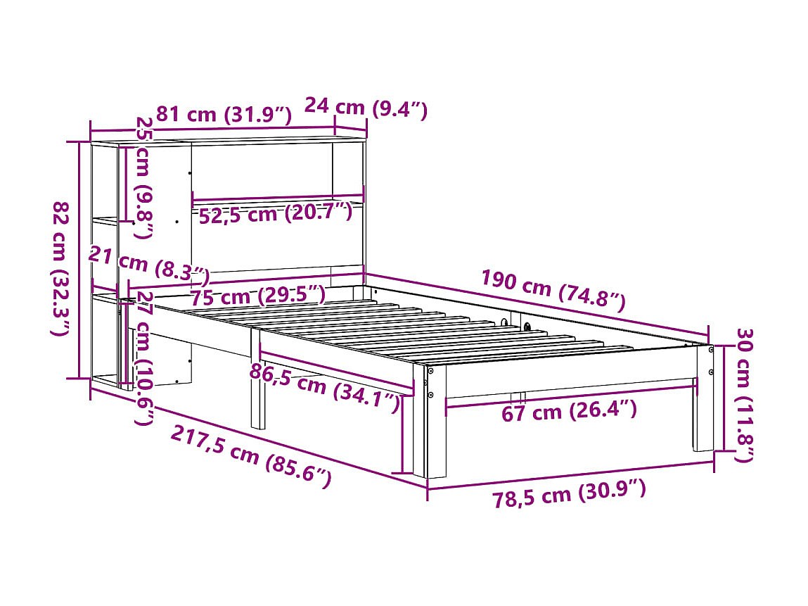 Giroletto con Libreria senza Materasso 75x190 cm in Legno Pino