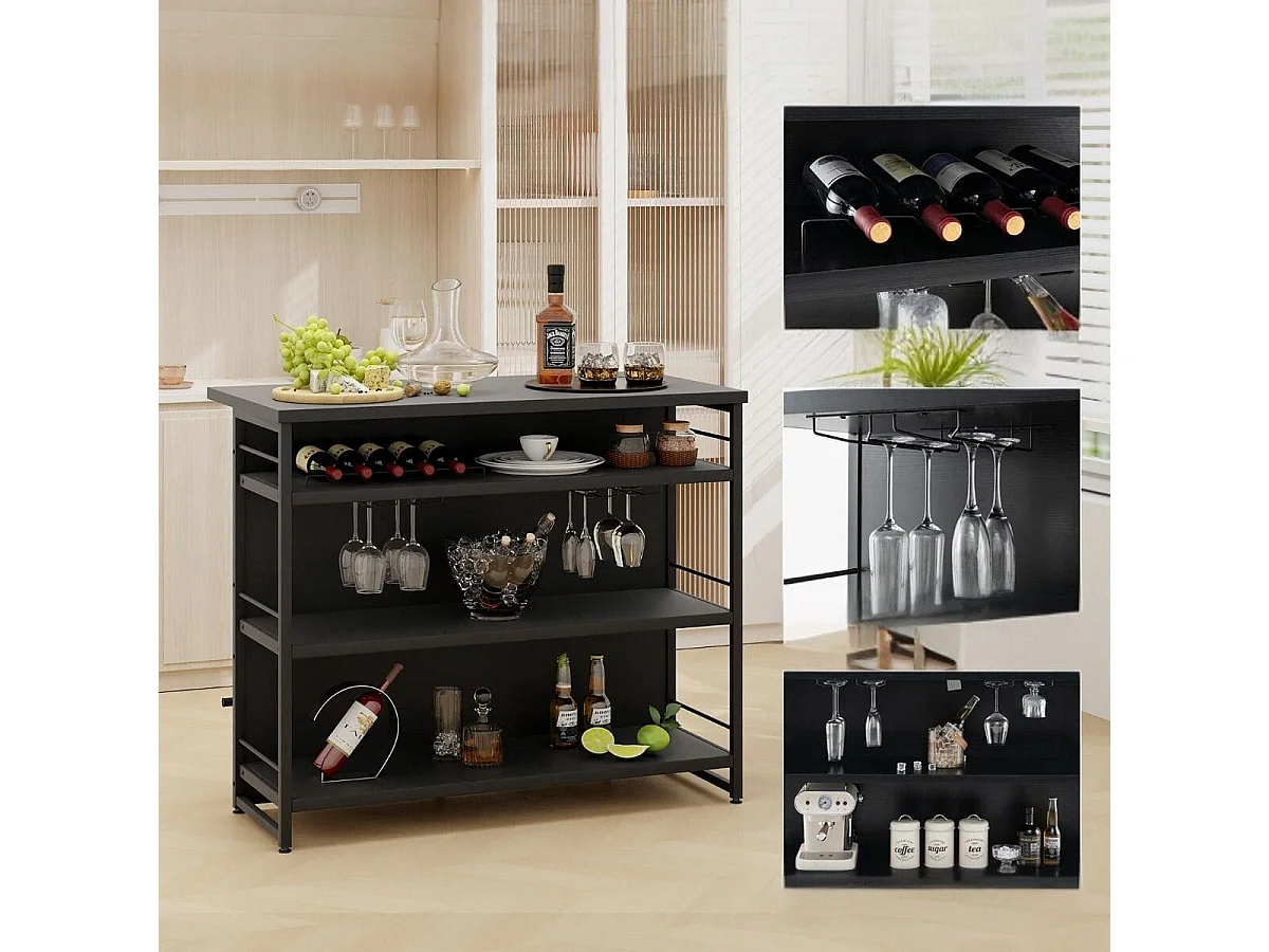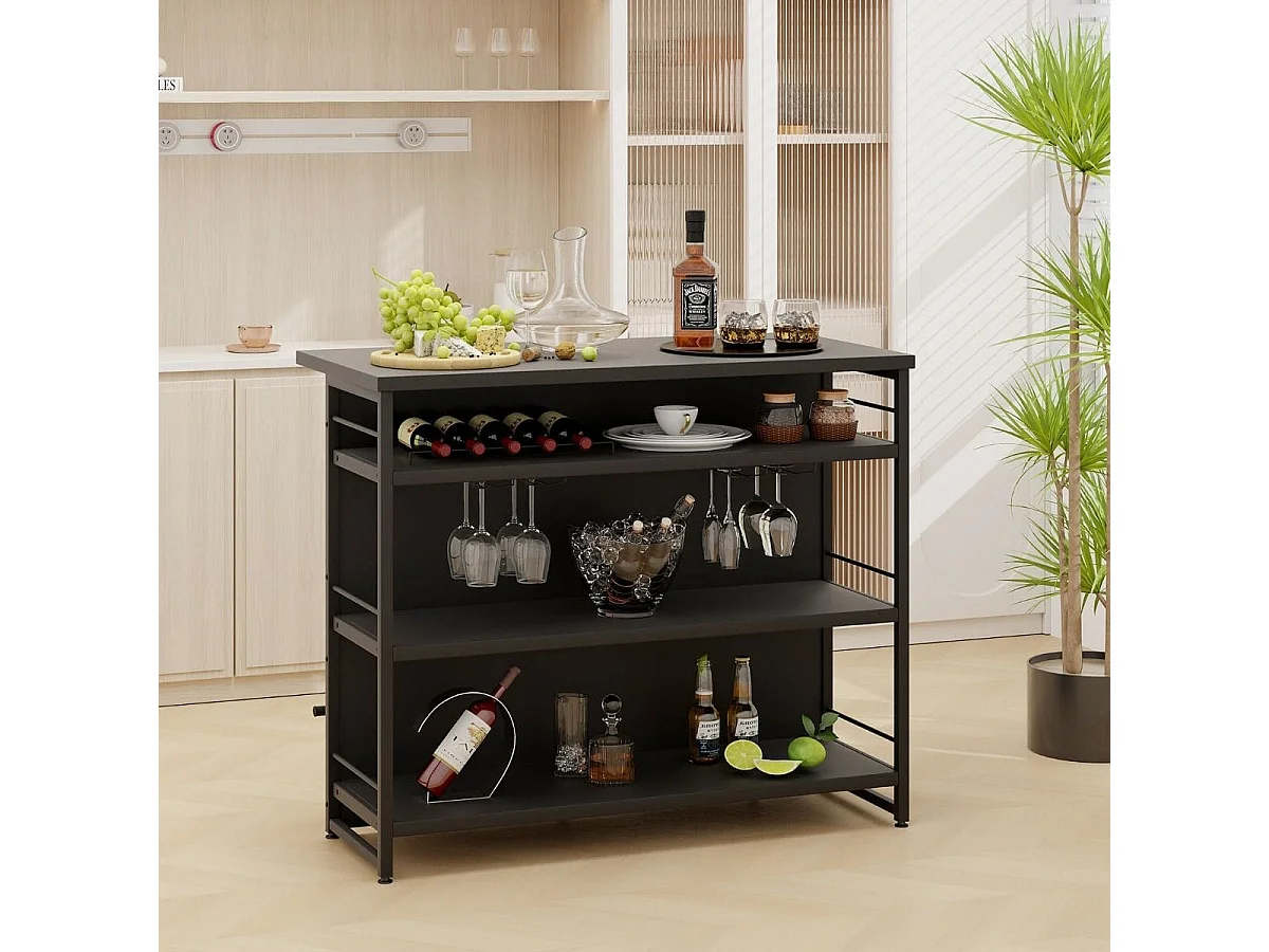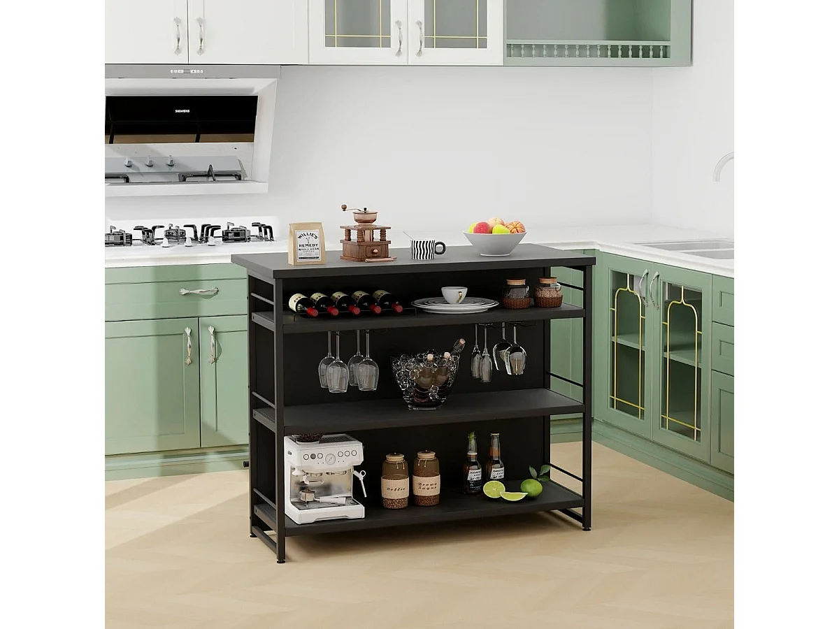 Isola cucina stile industriale con 3 ripiani aperti portabottiglie e porta calici, Mobile bar con poggiapiedi Nero