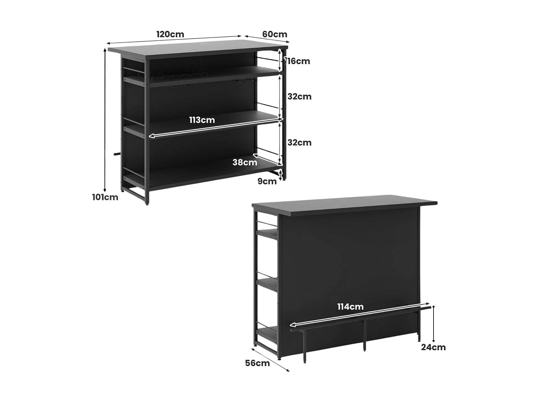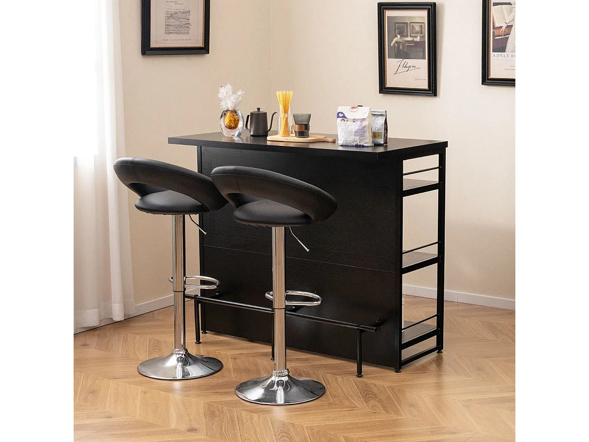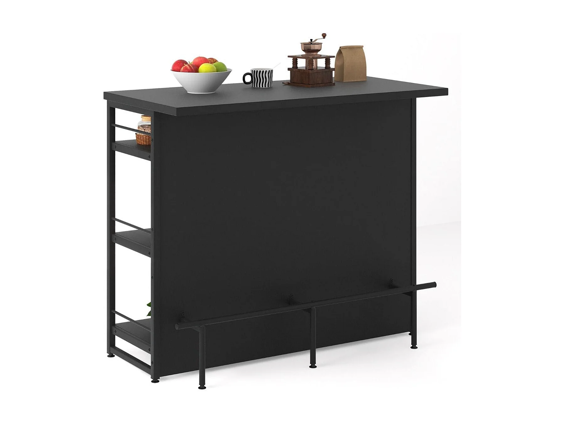Isola cucina stile industriale con 3 ripiani aperti portabottiglie e porta calici, Mobile bar con poggiapiedi Nero