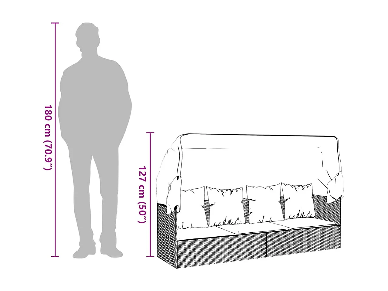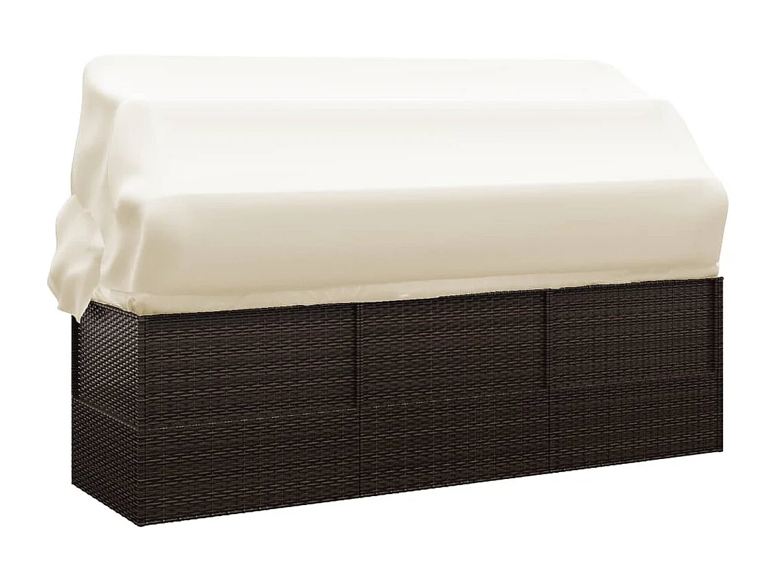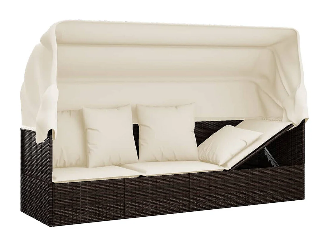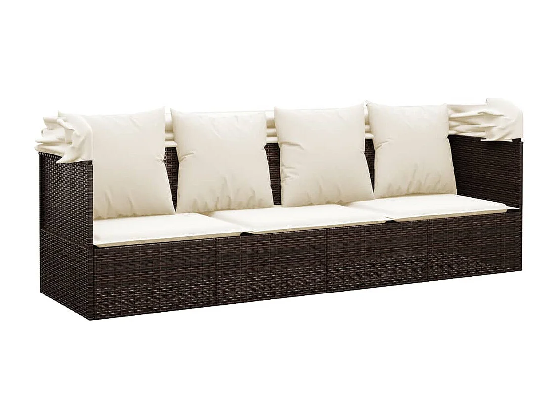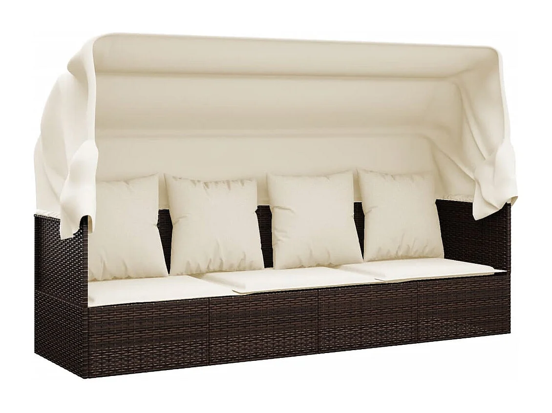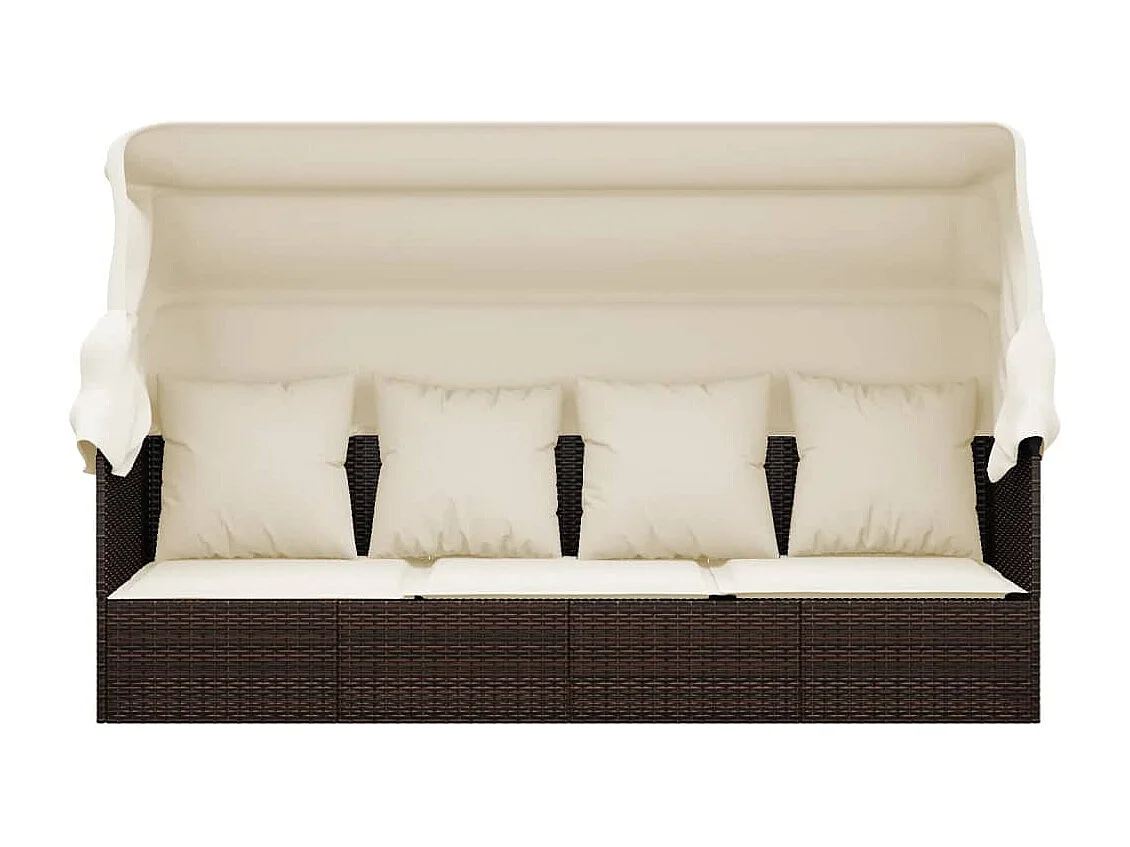 Lettino da esterno con tetto e cuscini in resina intrecciata marrone