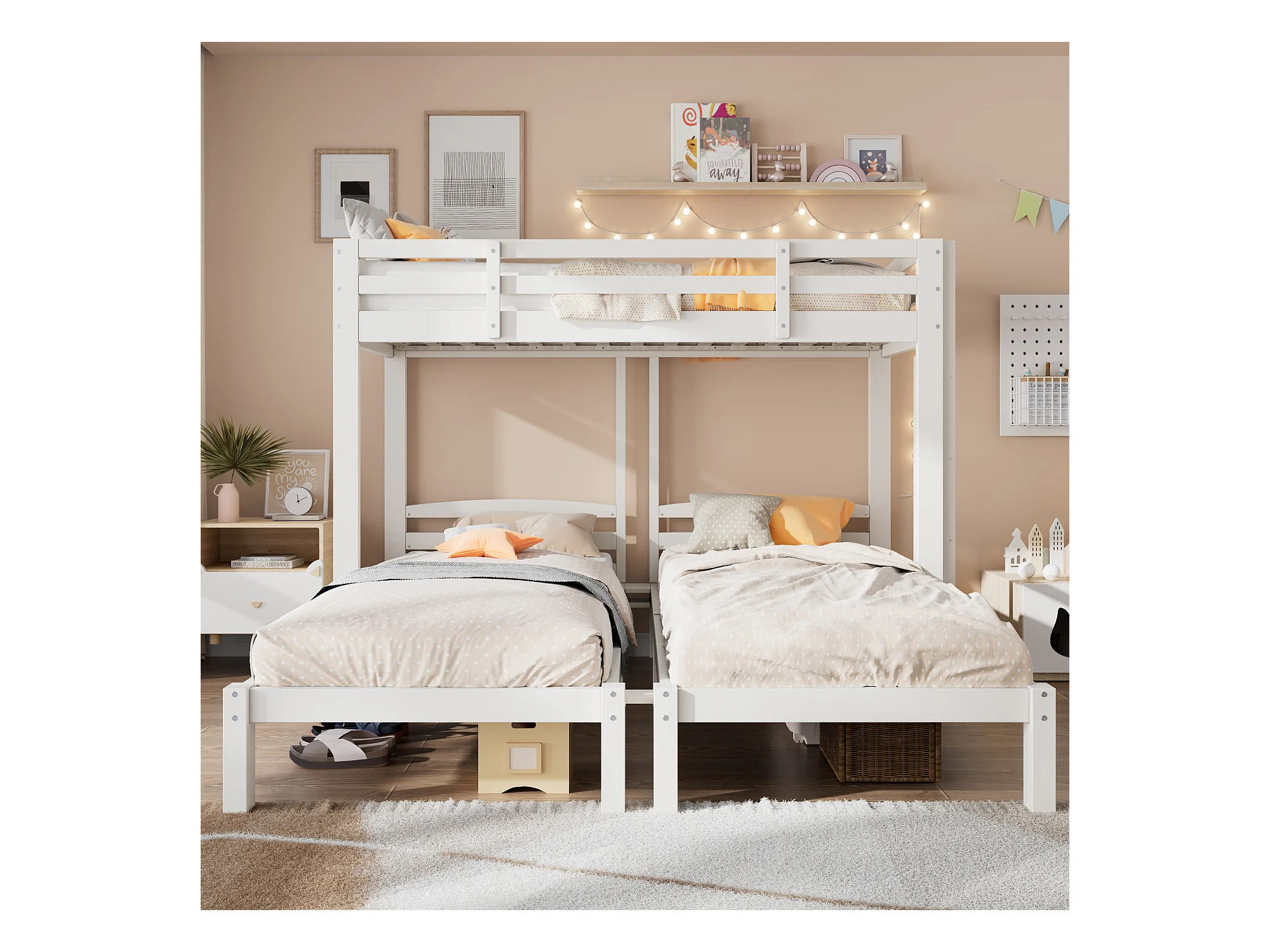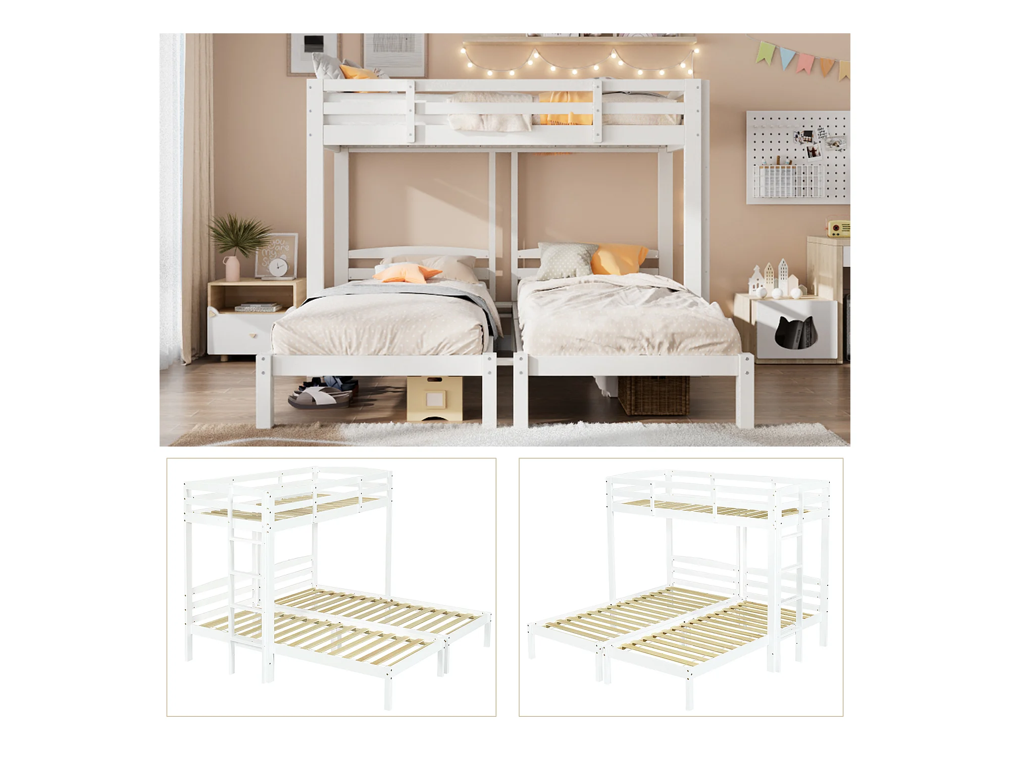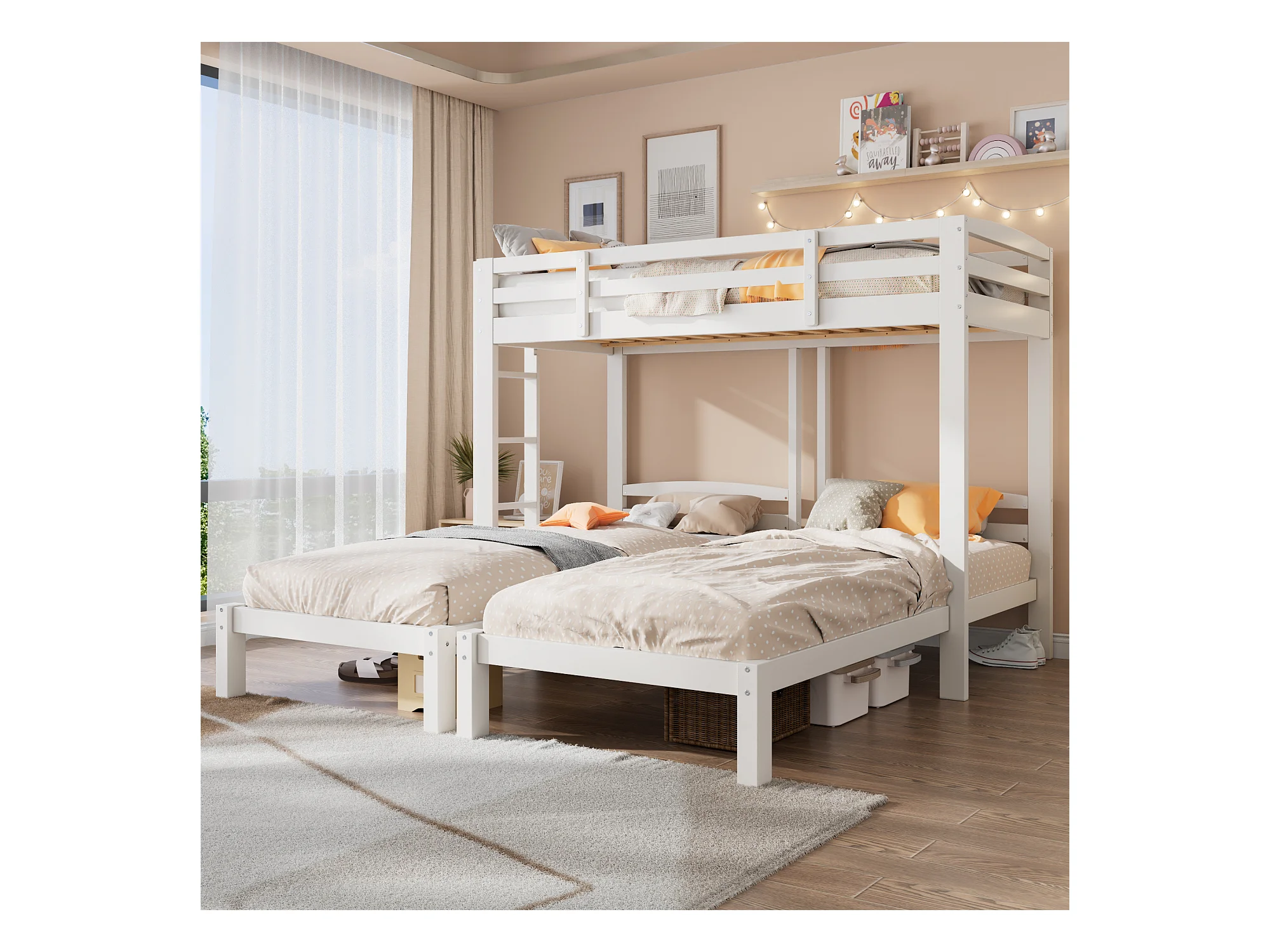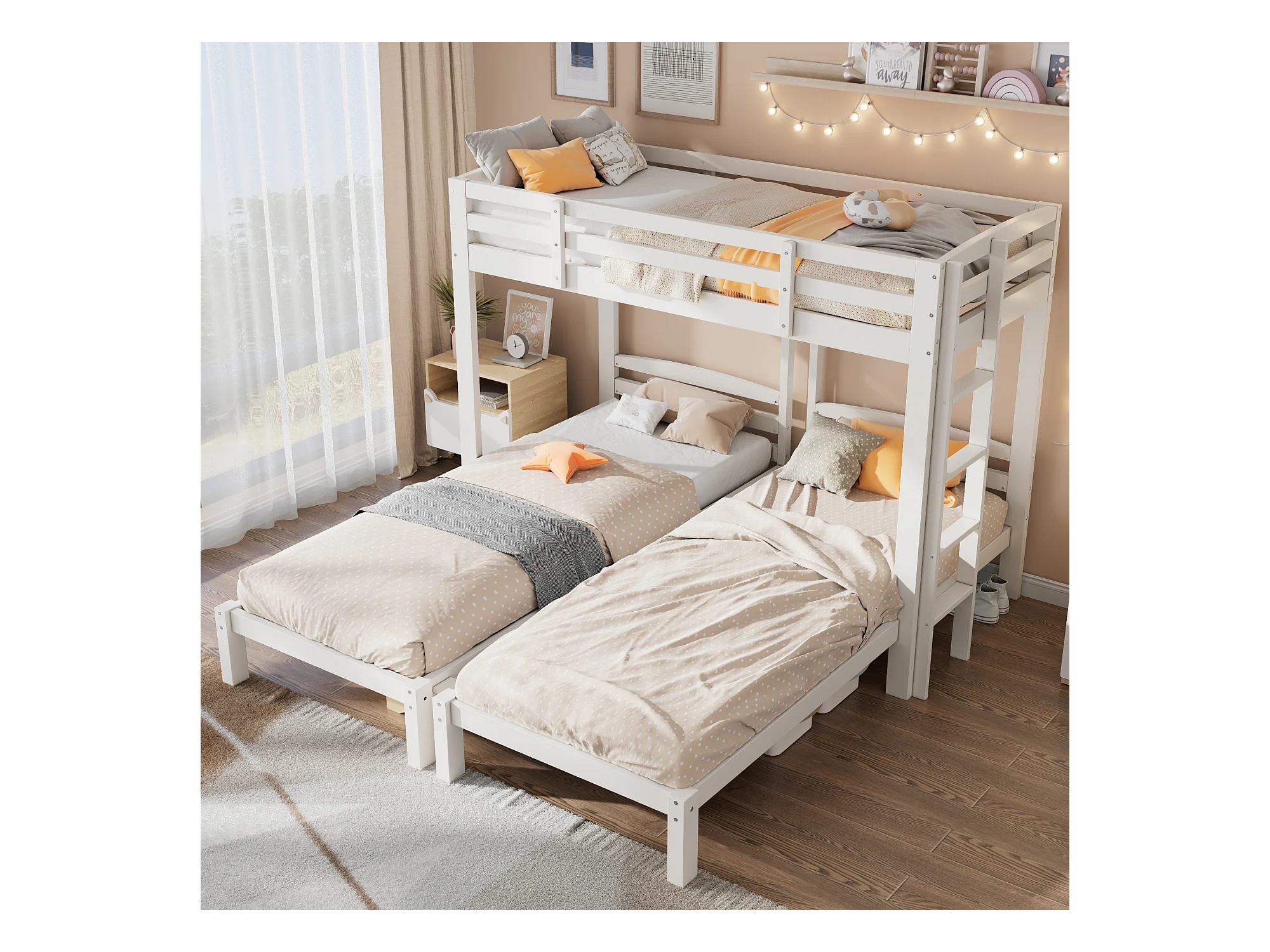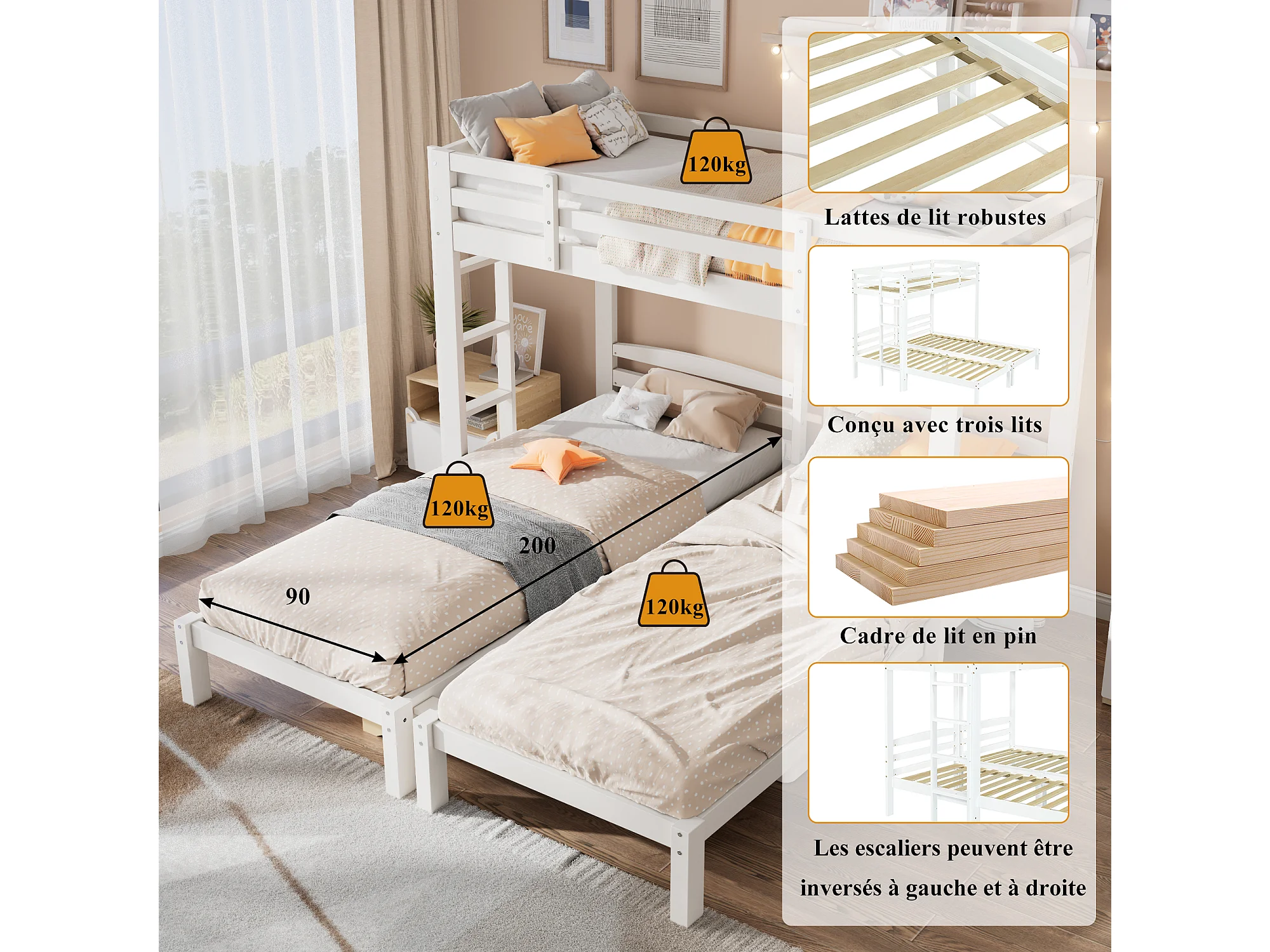Letto a castello triplo - 3 x 90 x 200 cm - con scaletta laterale per bambini e ragazzi - Legno - Bianco