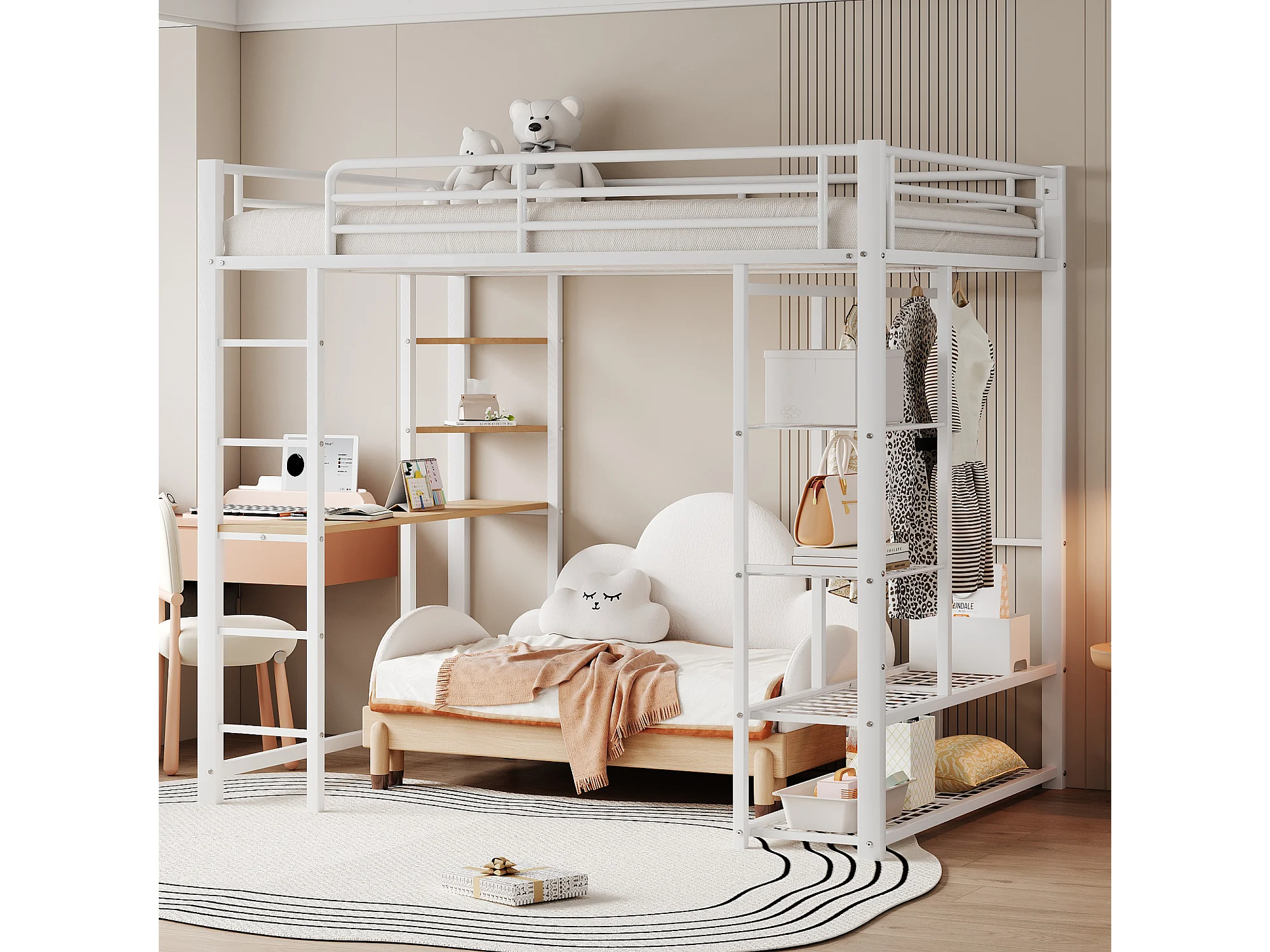 Letto a soppalco 140 x 200 cm con scrivania e ripiani portaoggetti - metallo - rete a doghe - bianco (senza materasso)
