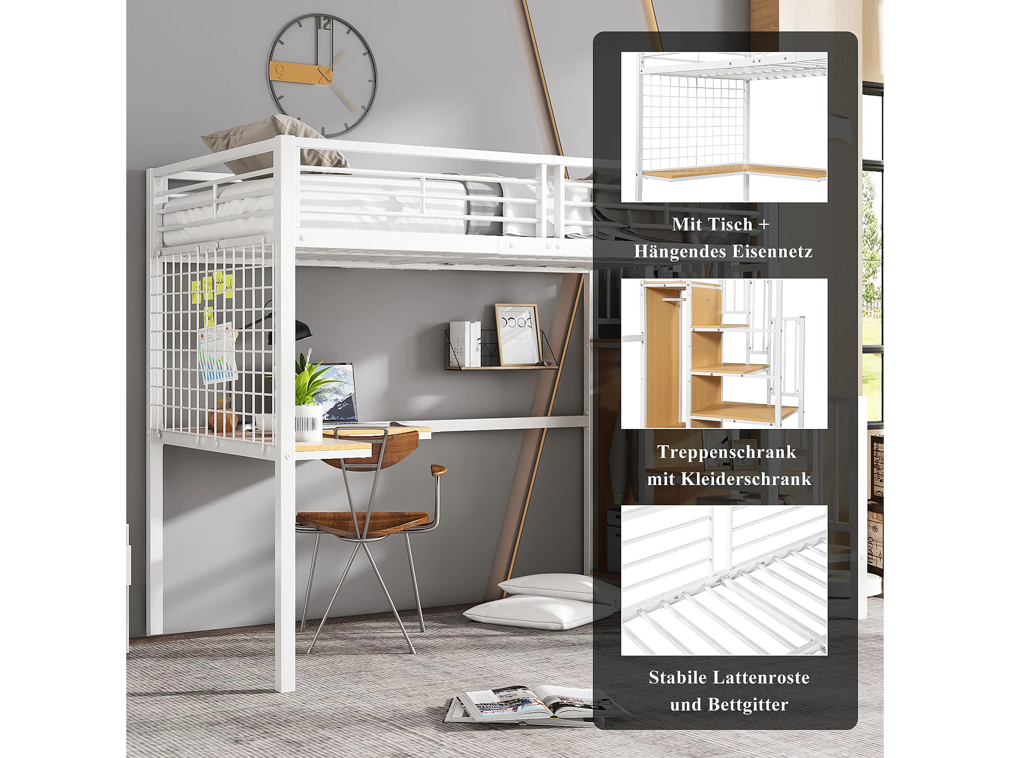 Letto soppalco in legno 90x200 cm - con scrivania/armadio/armadietti estraibili e scala portaoggetti - Bianco