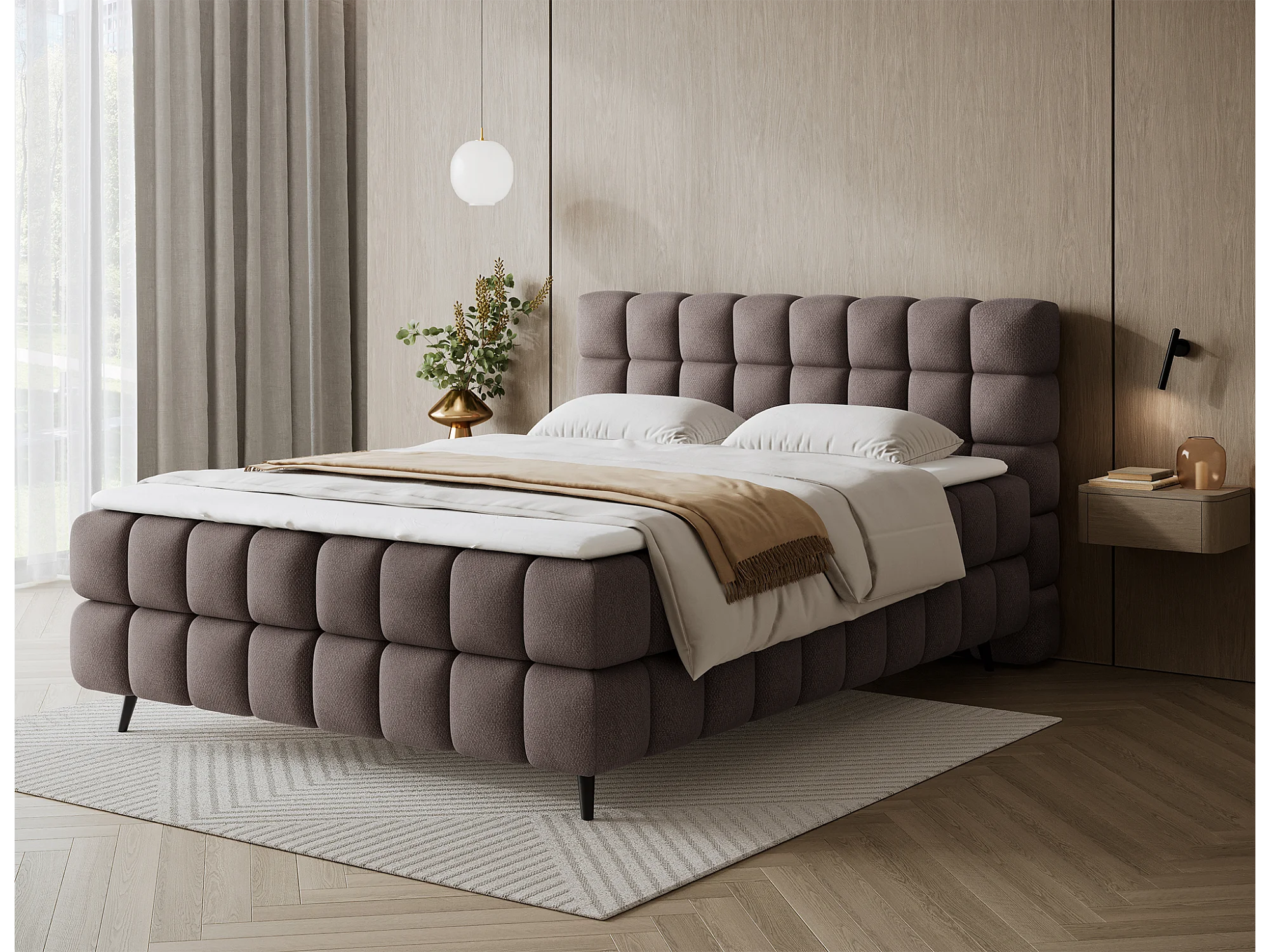 Letto box spring con contenitore e topper TRENTO tessuto peluche cordoncino 140x200 cm marrone H3-Bonell