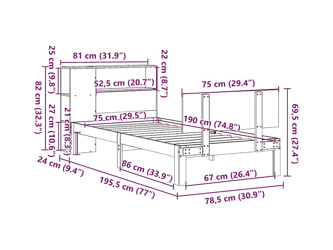 Letto con Libreria senza Materasso 75x190 cm in Legno Pino