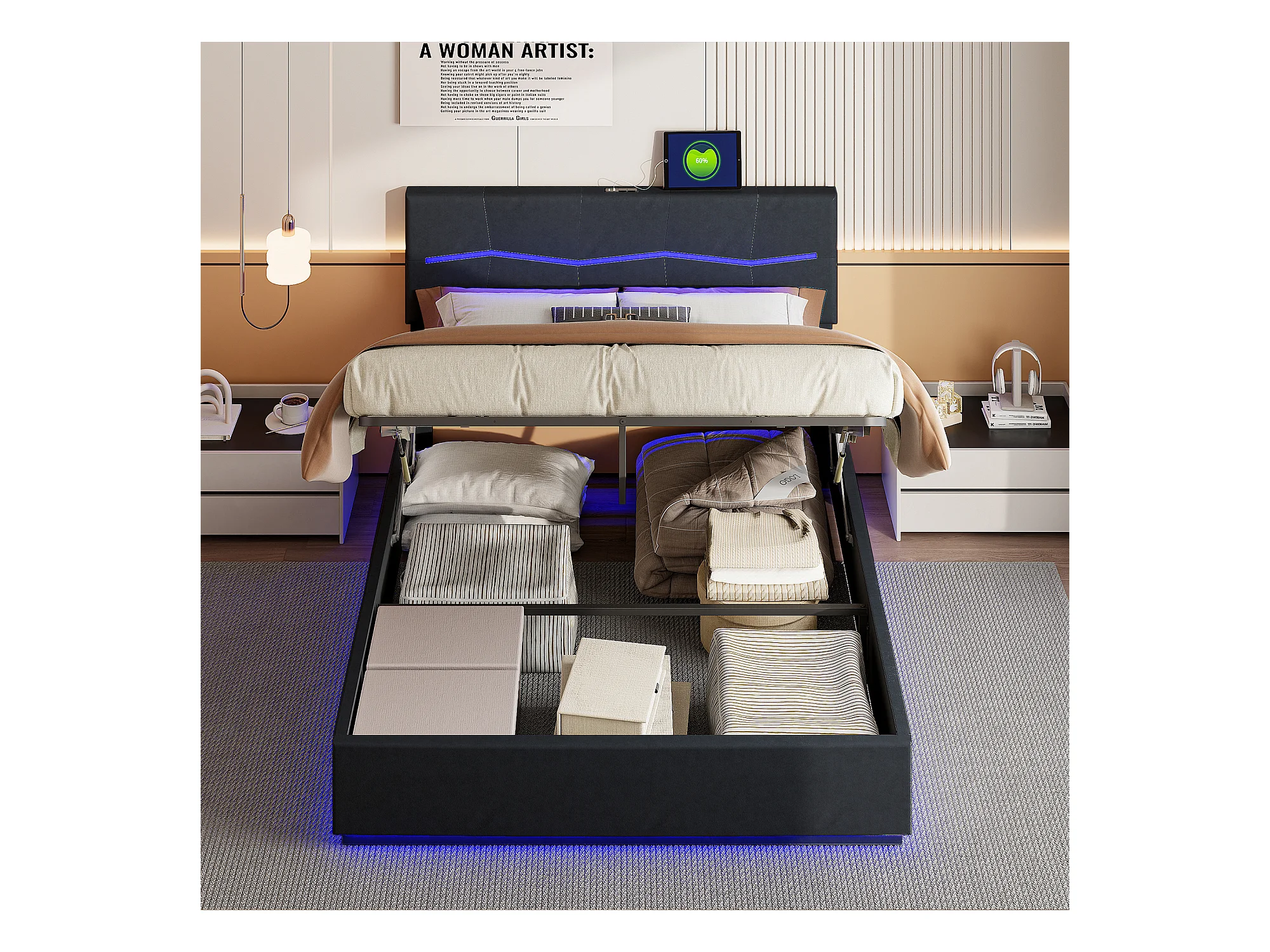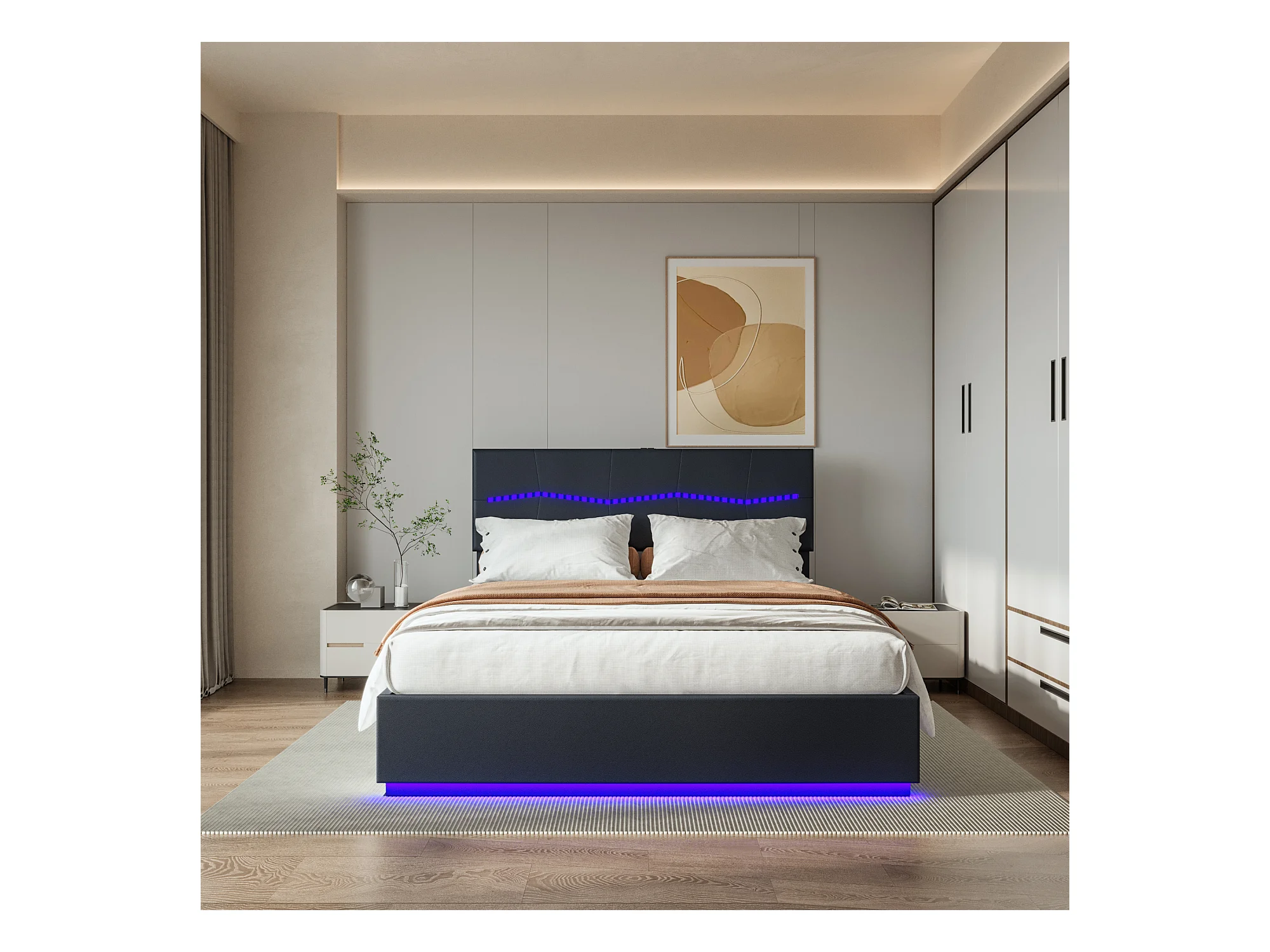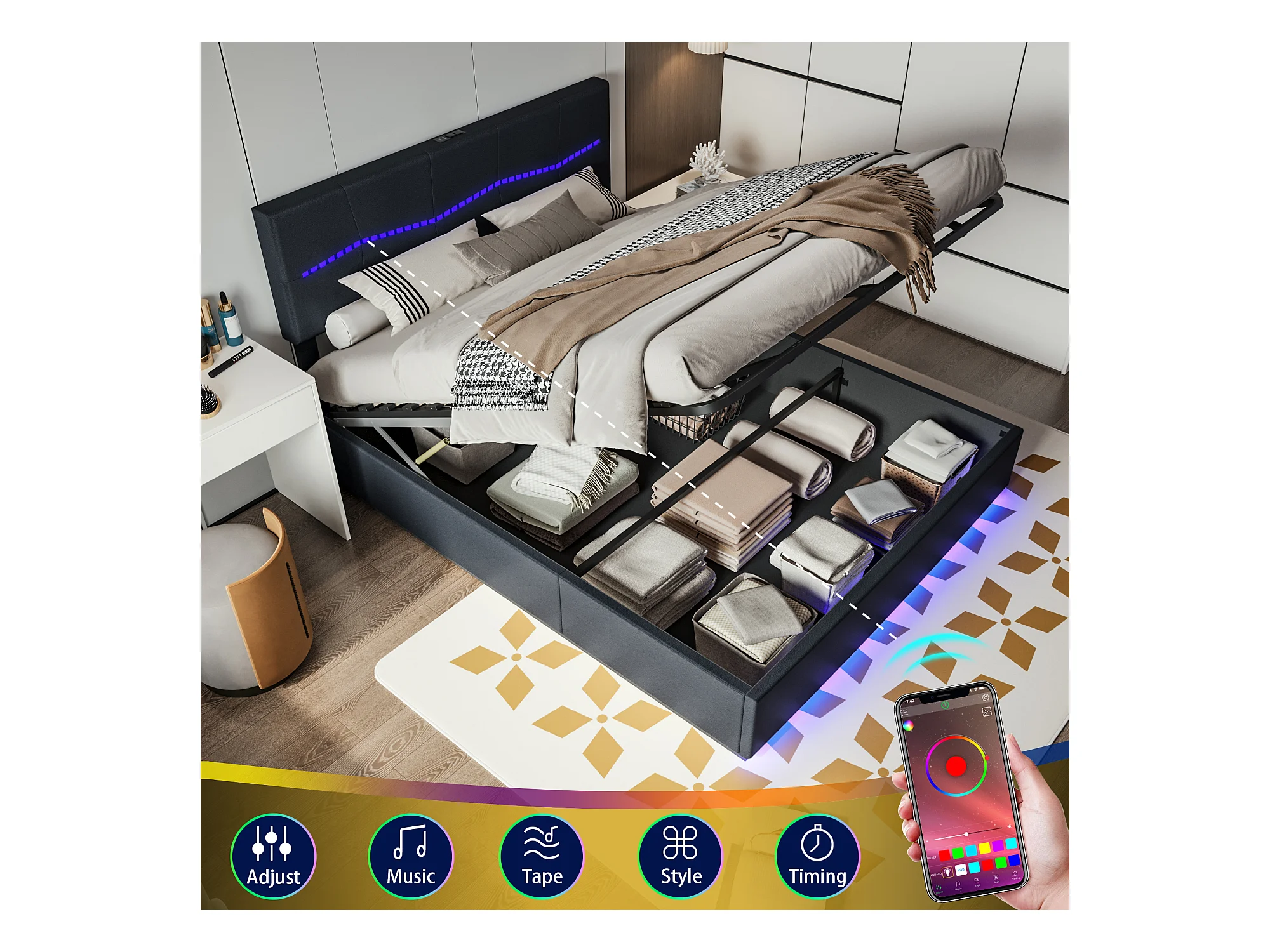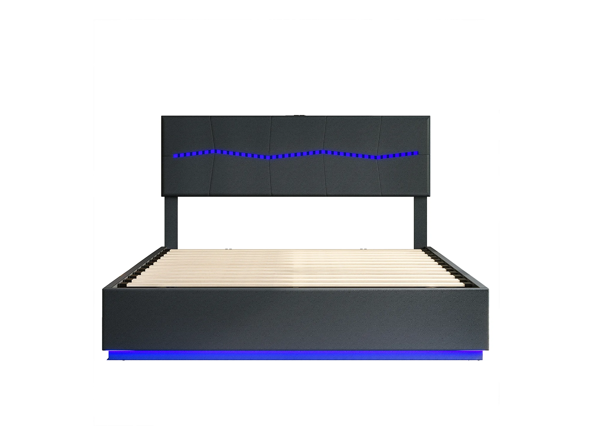 Letto contenitore 140*200cm, letto matrimoniale gonfiabile Euro, dotato di LED colorati, nero, PU