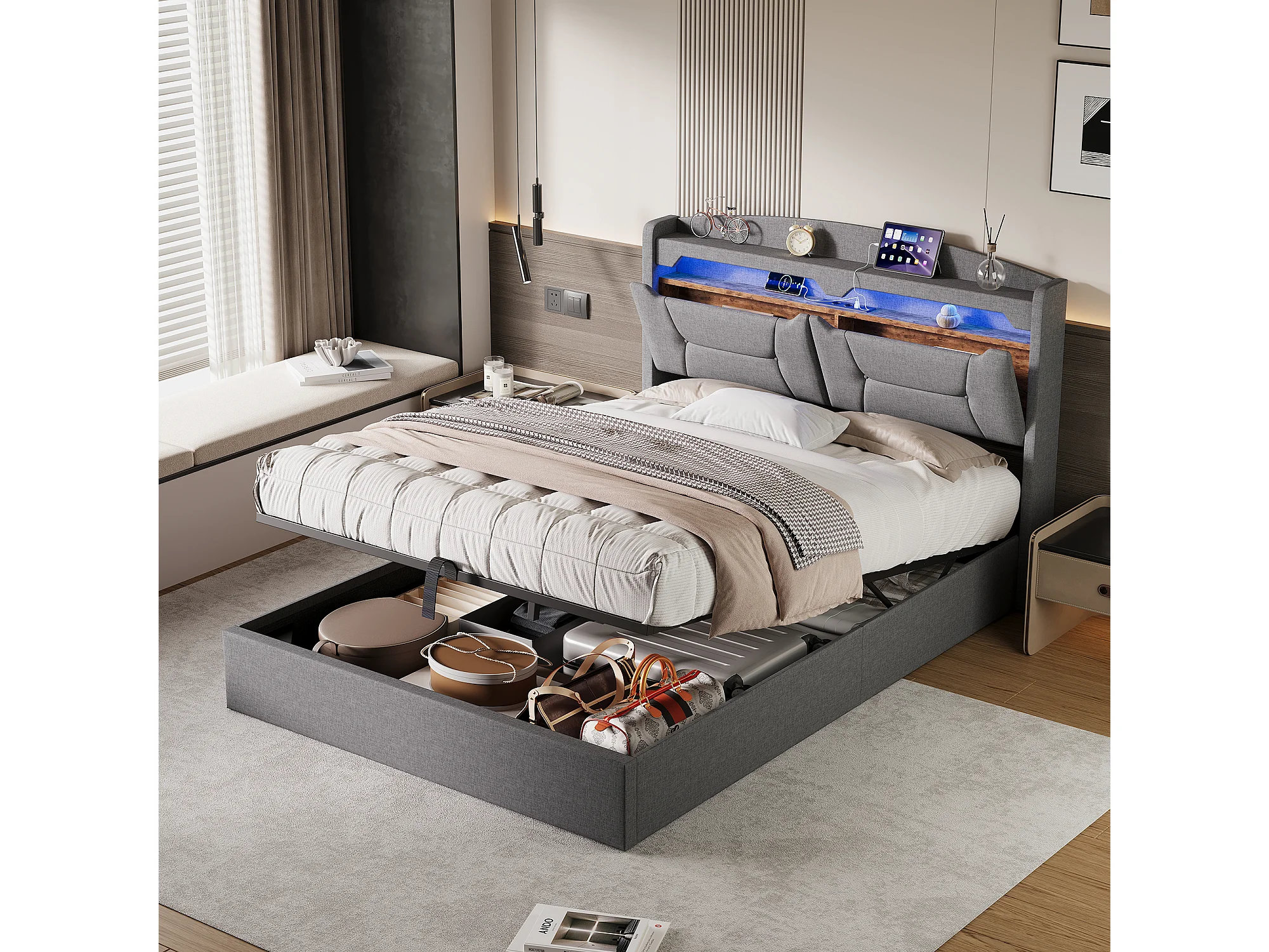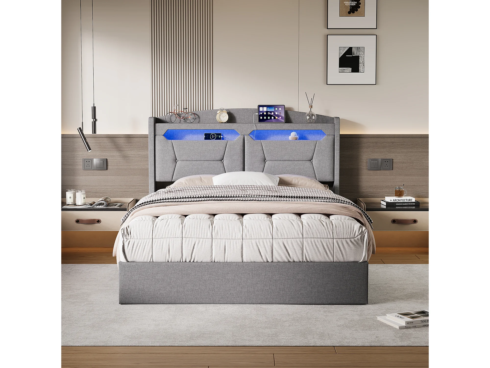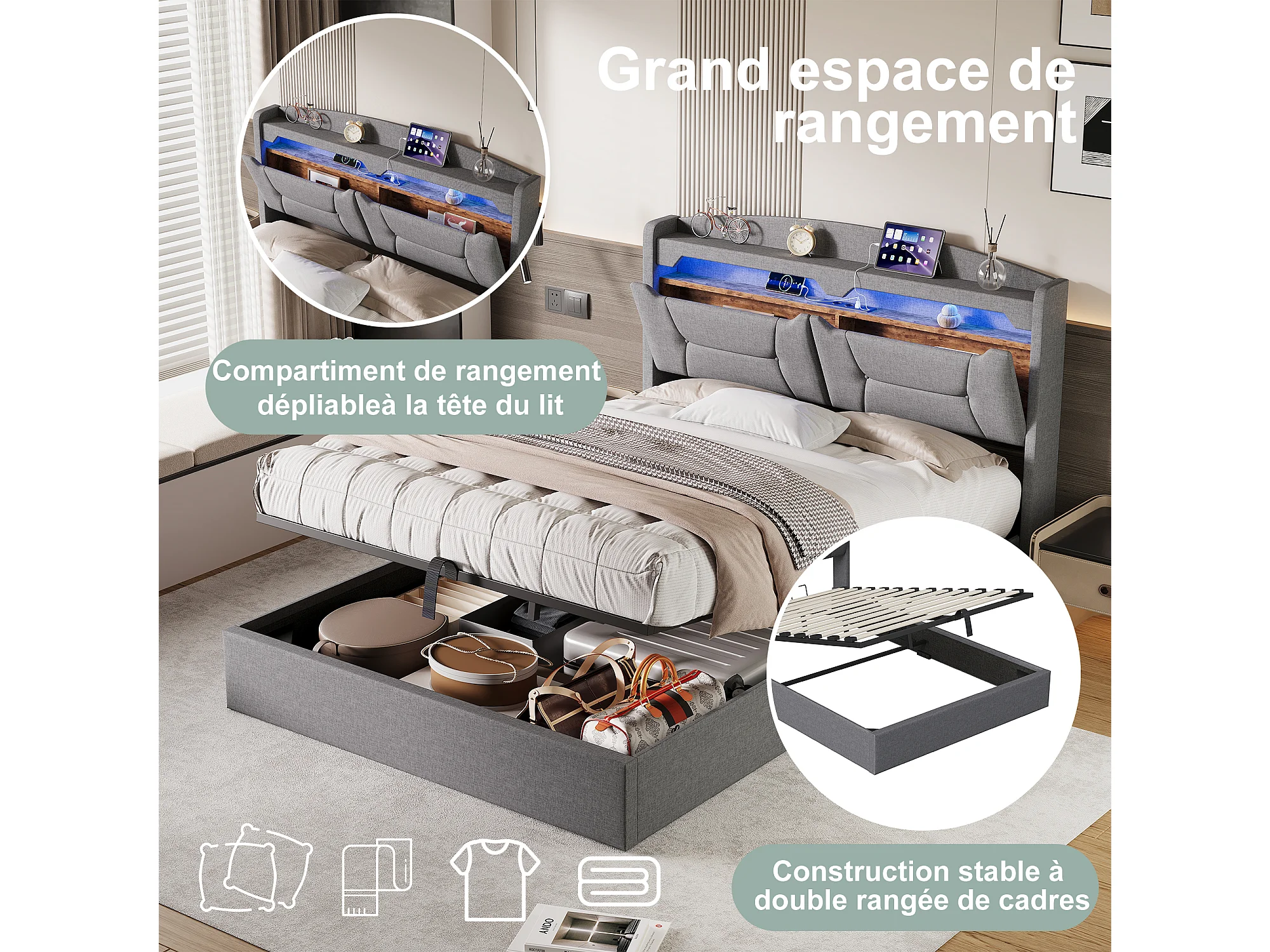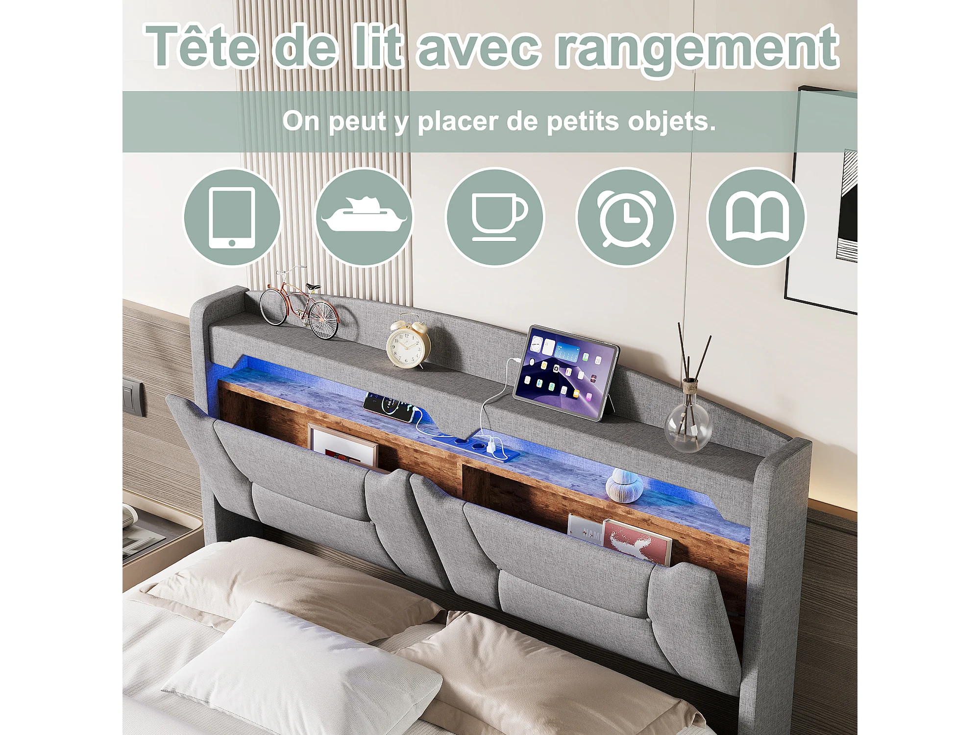 Letto contenitore 140 x 190 cm con rete a doghe e illuminazione a LED, con contenitore e testiera imbottita, grigio