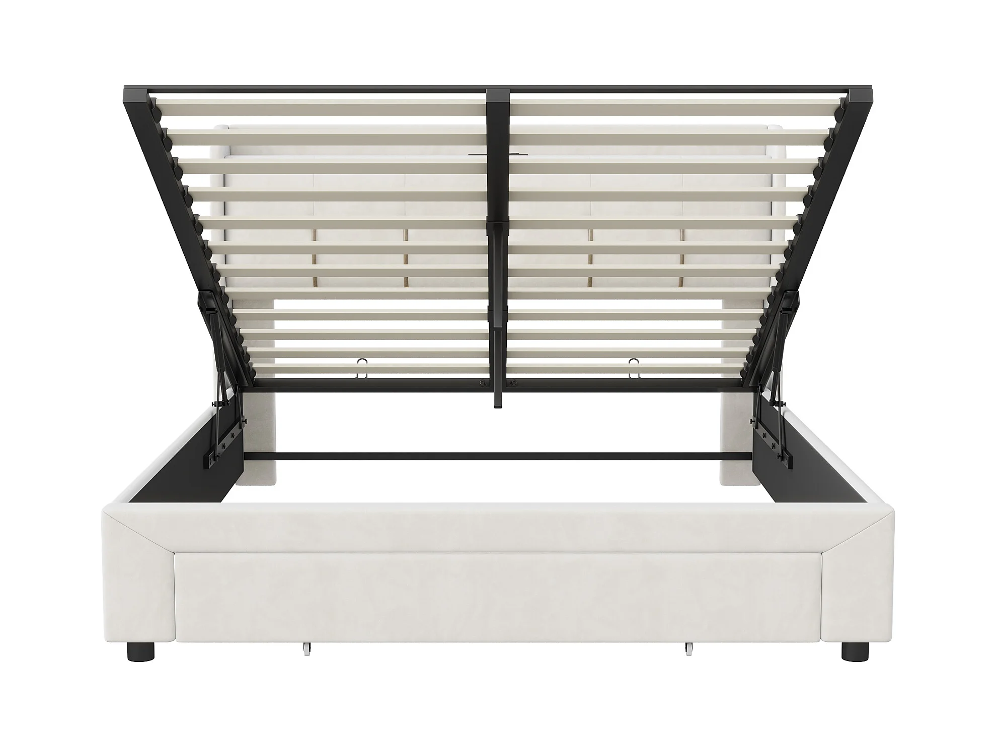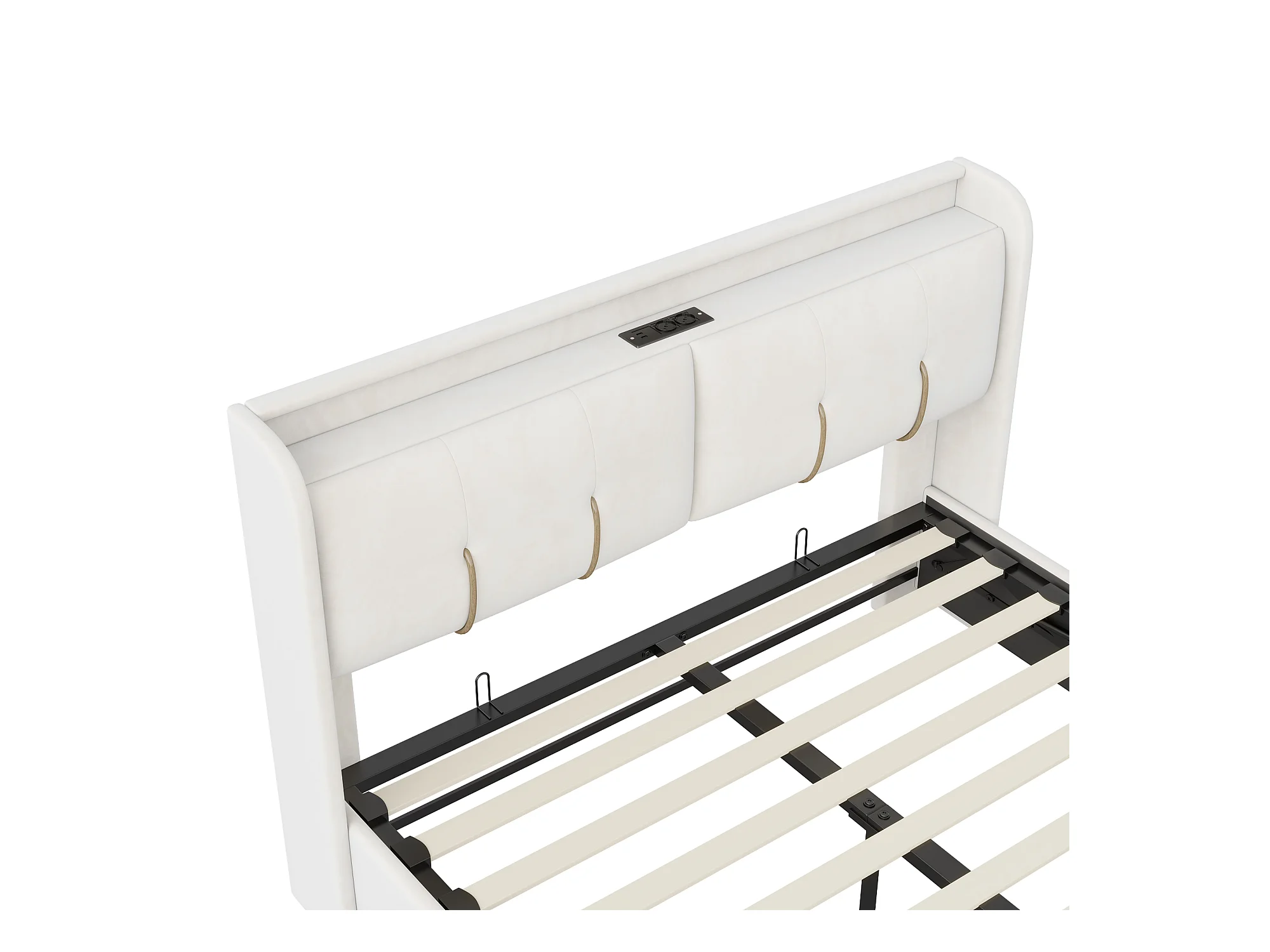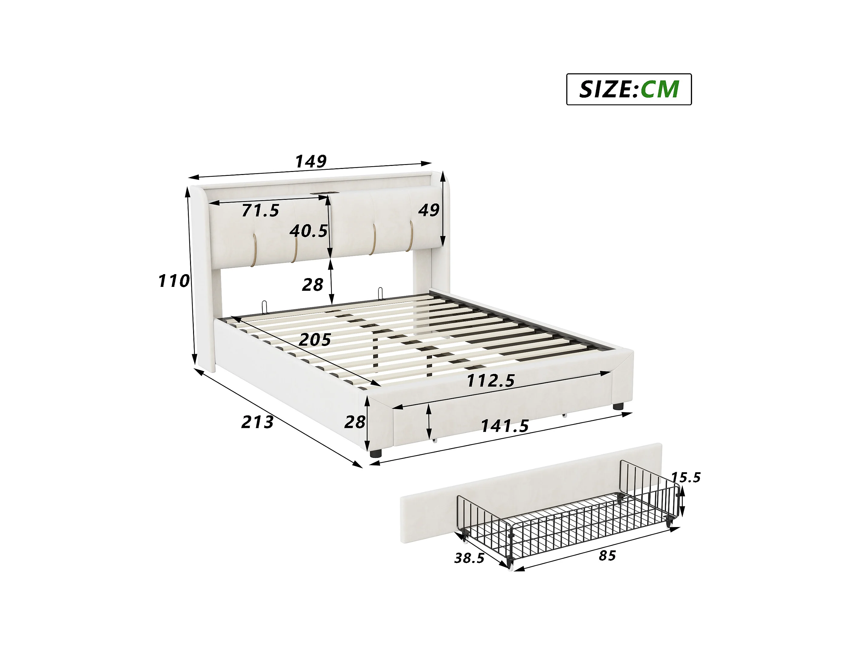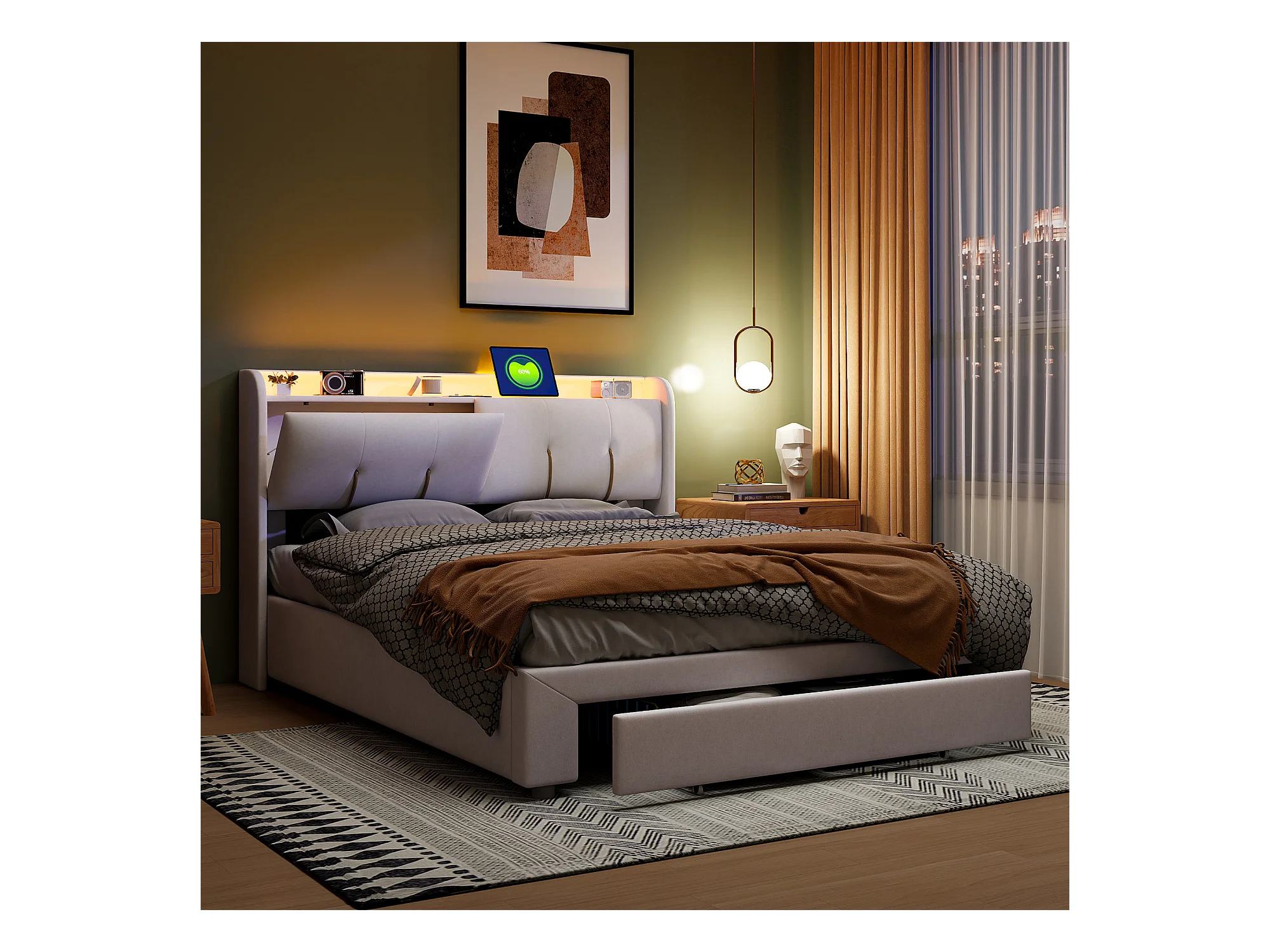 Letto contenitore 140x200 cm con LED e USB, letto matrimoniale imbottito con cassetti, velluto, beige