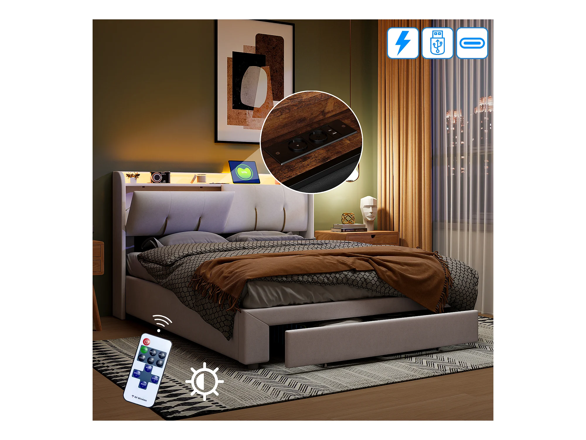 Letto contenitore 140x200 cm con LED e USB, letto matrimoniale imbottito con cassetti, velluto, beige