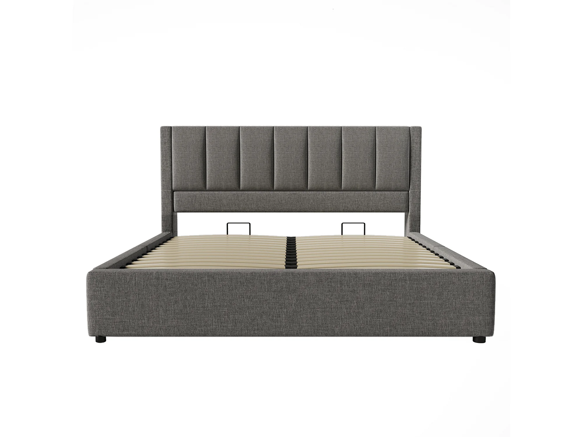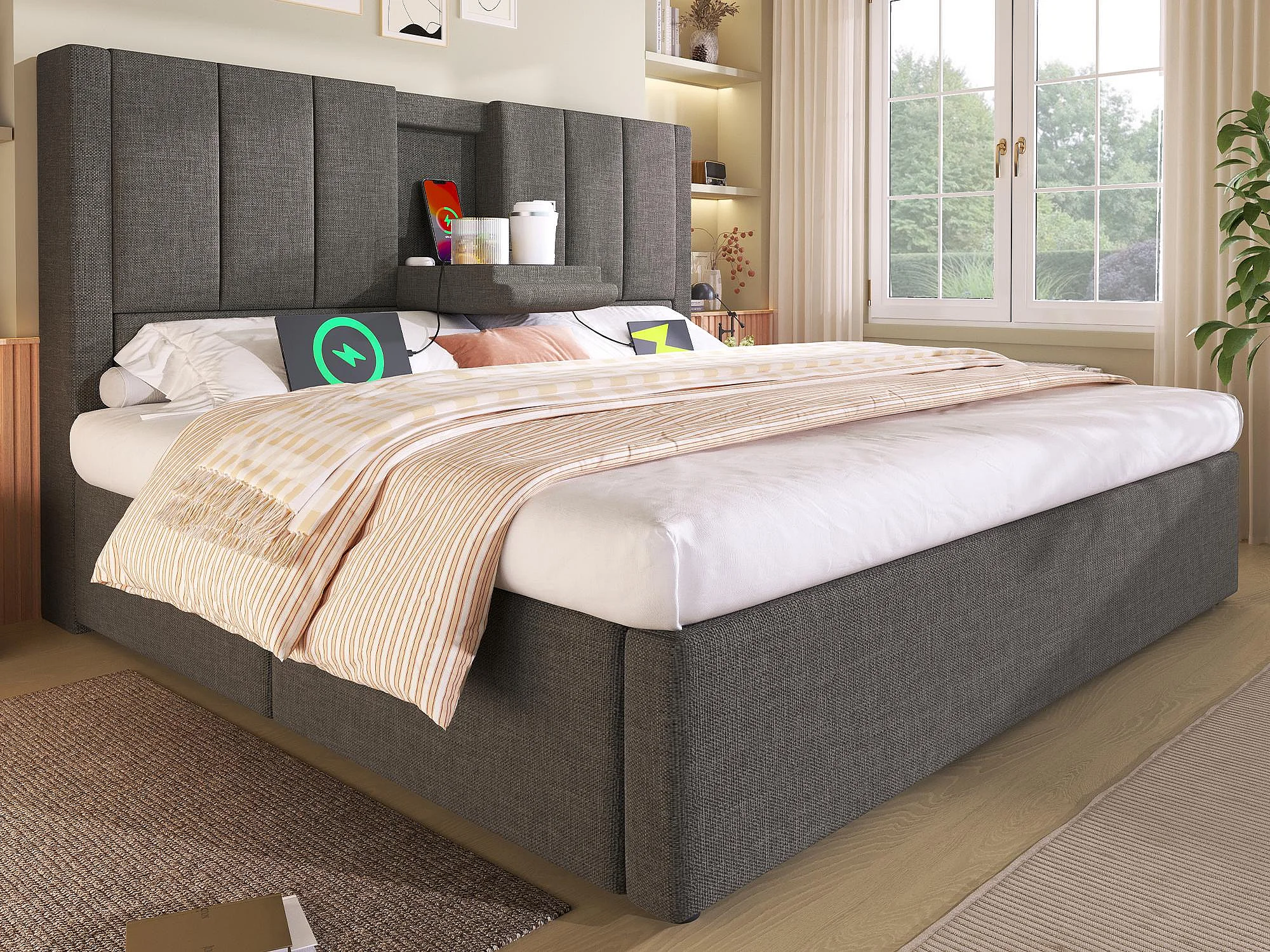 Letto contenitore imbottito 160x200cm - con portabicchieri nascosto - con porte USB e Tipo-C - con rete a doghe - Lino - Grigio (senza materasso)