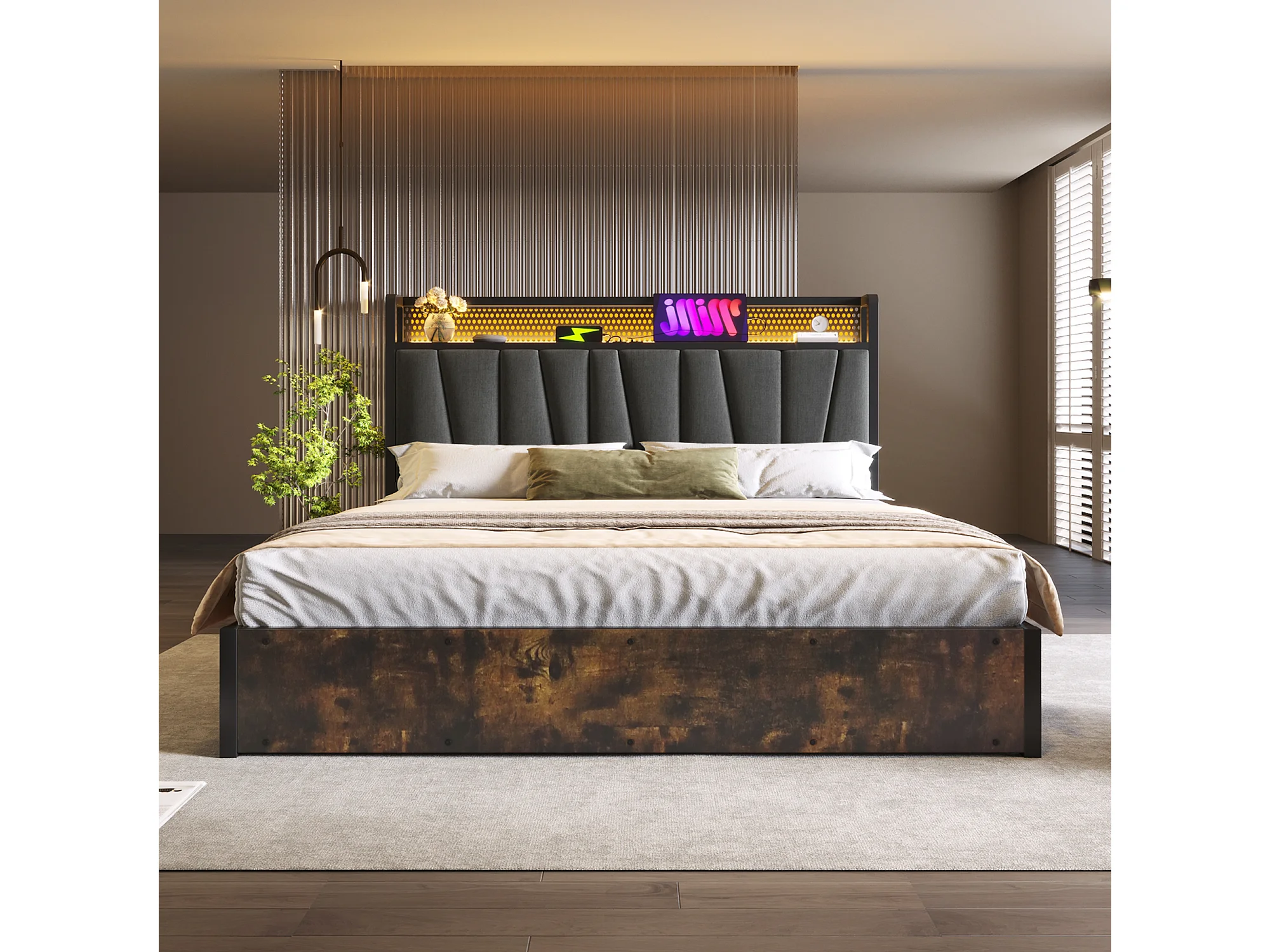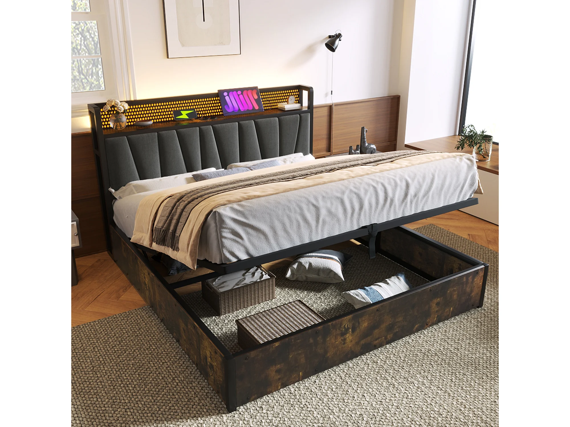Letto contenitore per adulti 160 x 200 cm - App Control LED + USB - legno + lino - stile industriale - grigio