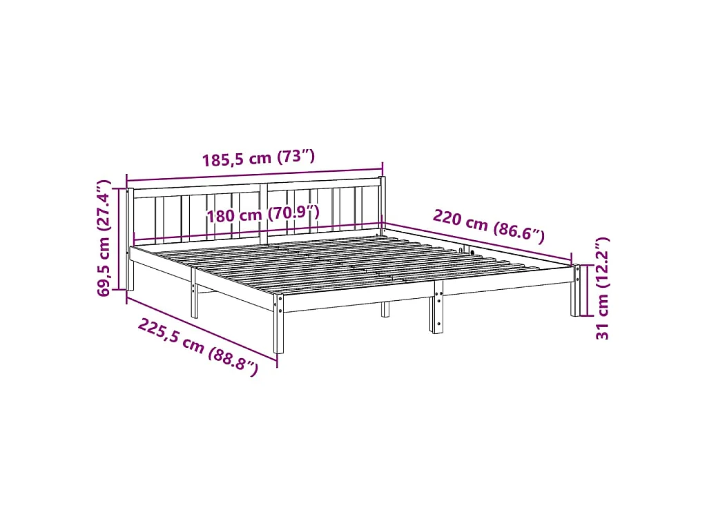 Letto Extra Lungo senza Materasso Bianco 180x220 cm in Pino