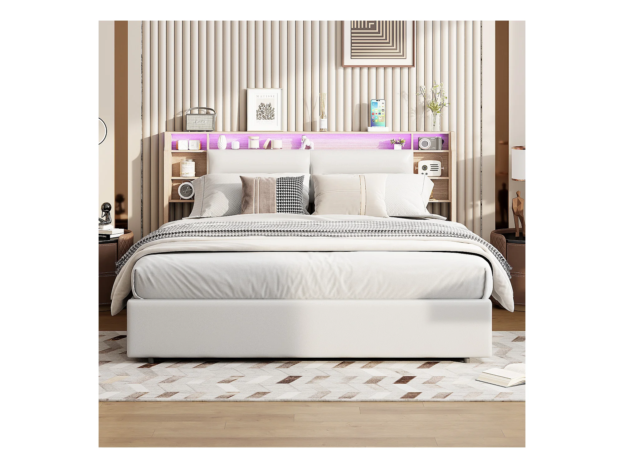 Letto imbottito, 160 x 200 cm, con LED e ricarica USB, letto matrimoniale, spazio contenitore, PU, bianco