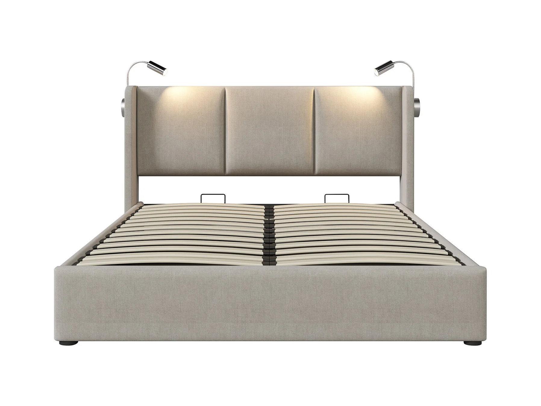 Letto imbottito 160 x 200 cm, Letto matrimoniale, Lampada da lettura con funzione di ricarica, Lino, Beige