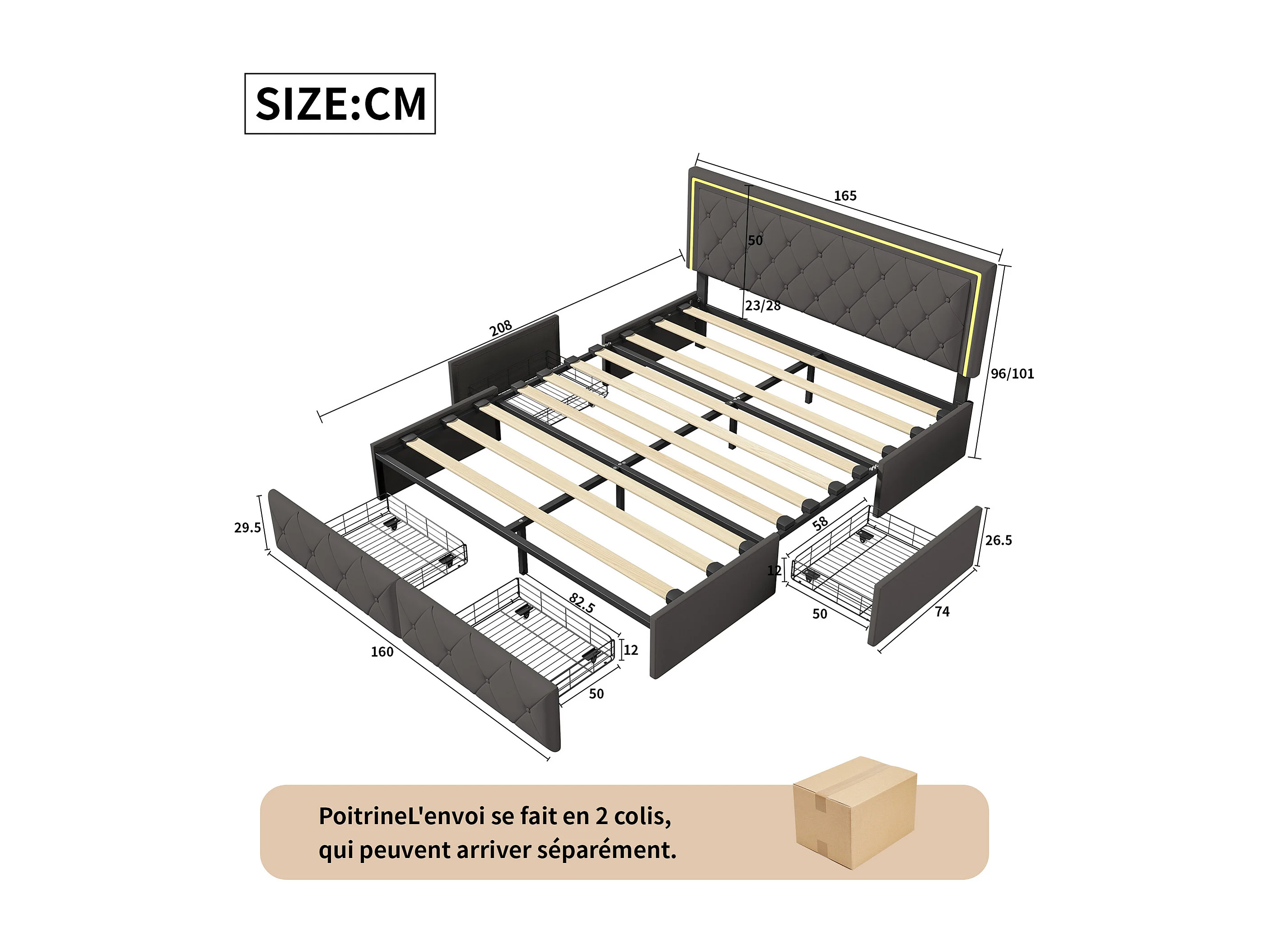 Letto imbottito 160x200cm con LED, con 4 cassetti contenitore, con rete a doghe, PU, grigio