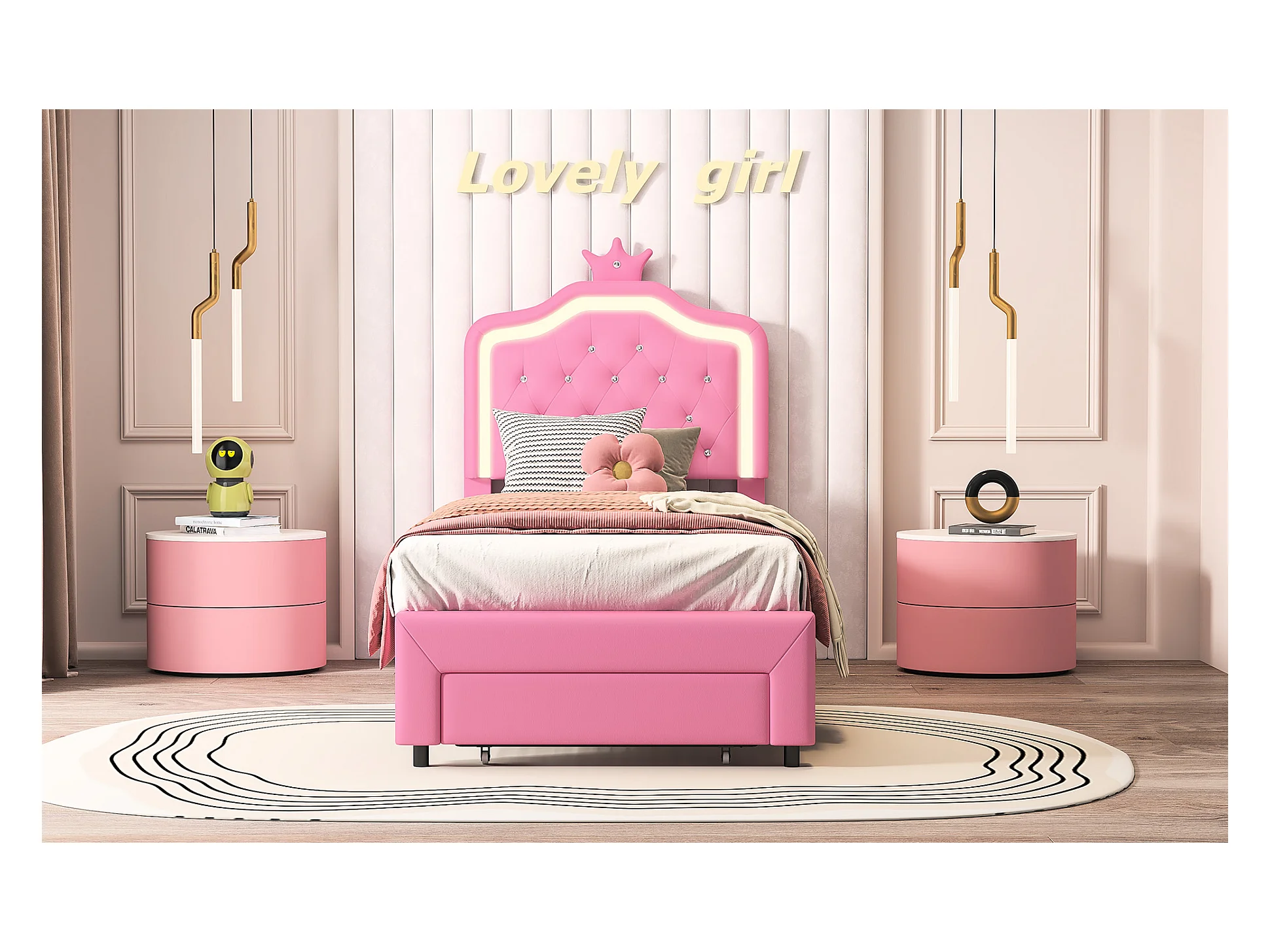 Letto imbottito 90*200cm, con cassetto ai piedi del letto e lampada alla testata del letto, rosa, materiale PU